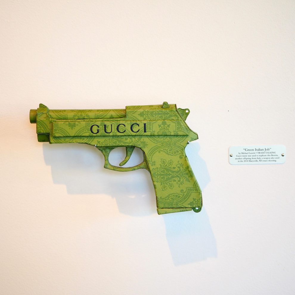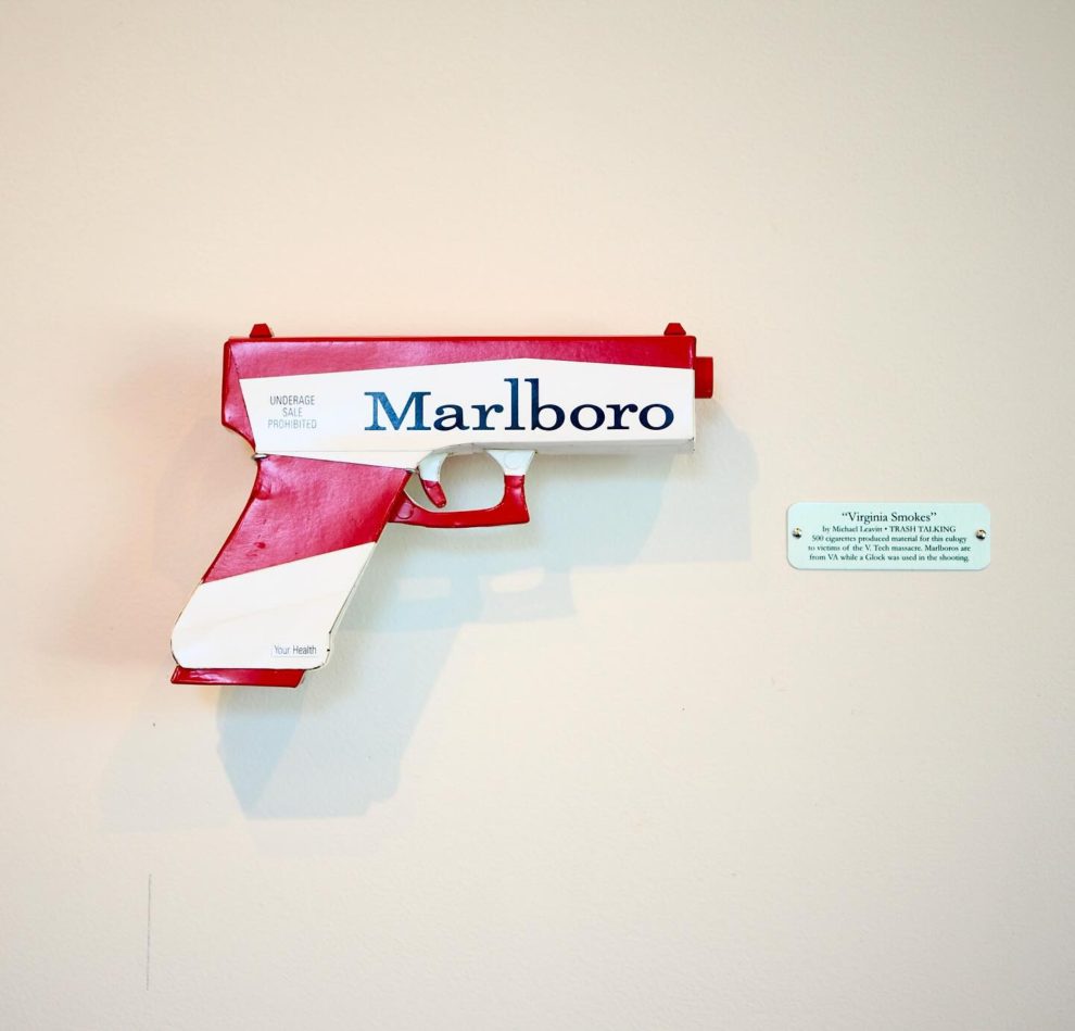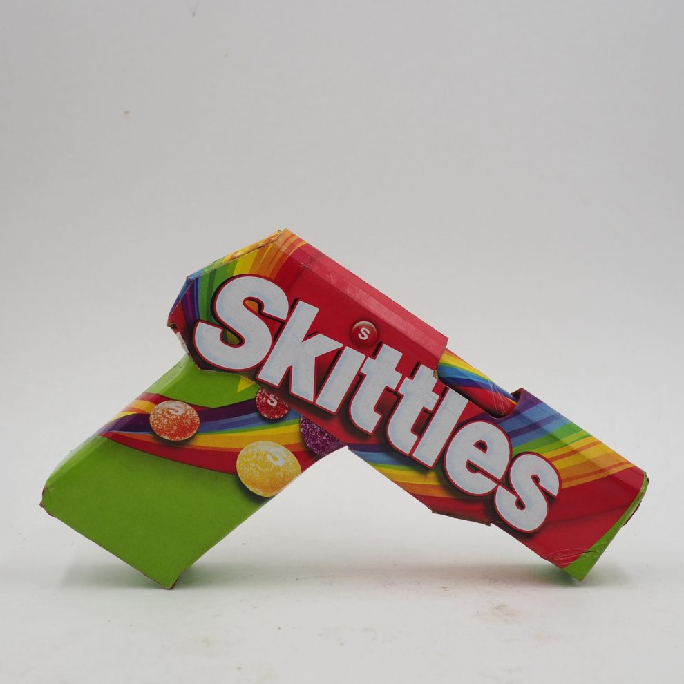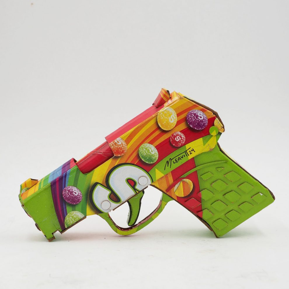 His works—ranging from Skittles-wrapped handguns to Apple-branded rotary phones—are full-scale replicas that use no paint, relying solely on the original packaging’s graphics. Inspired by his environmentalist father, Leavitt channels his passion for recycling into art that’s both witty and provocative. Since 2006, he’s used satire to spotlight how brands infiltrate daily life, revealing the hidden costs of addiction, excess, and ecological harm.