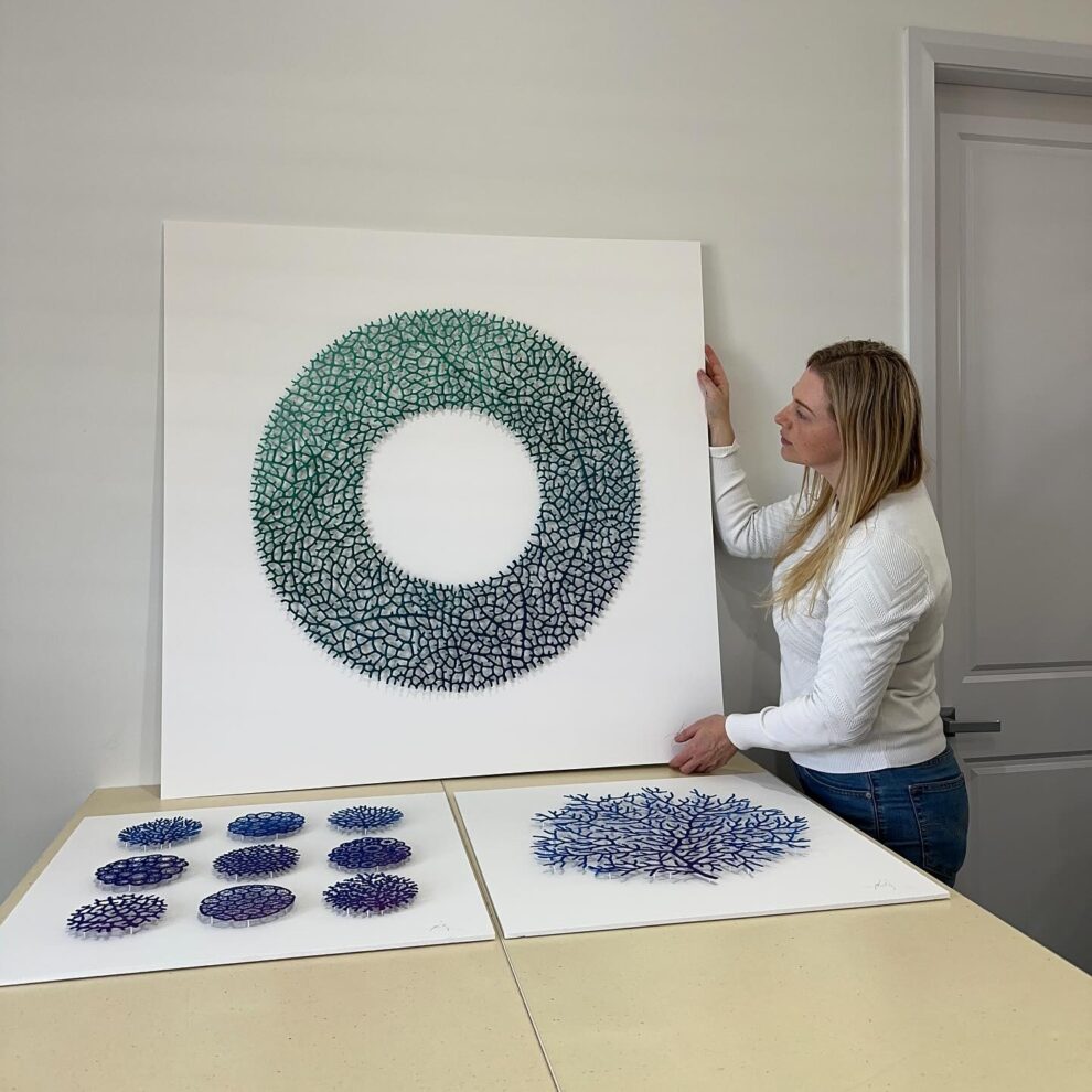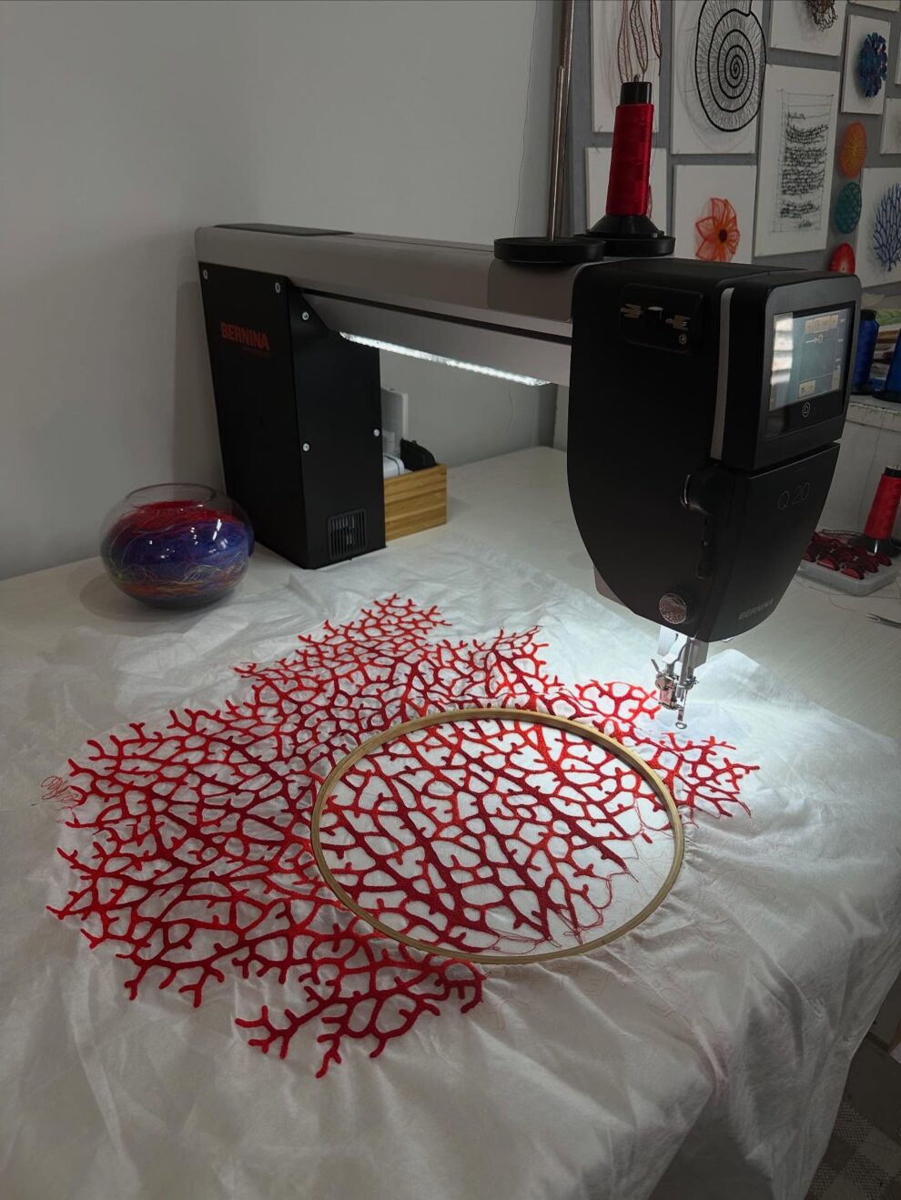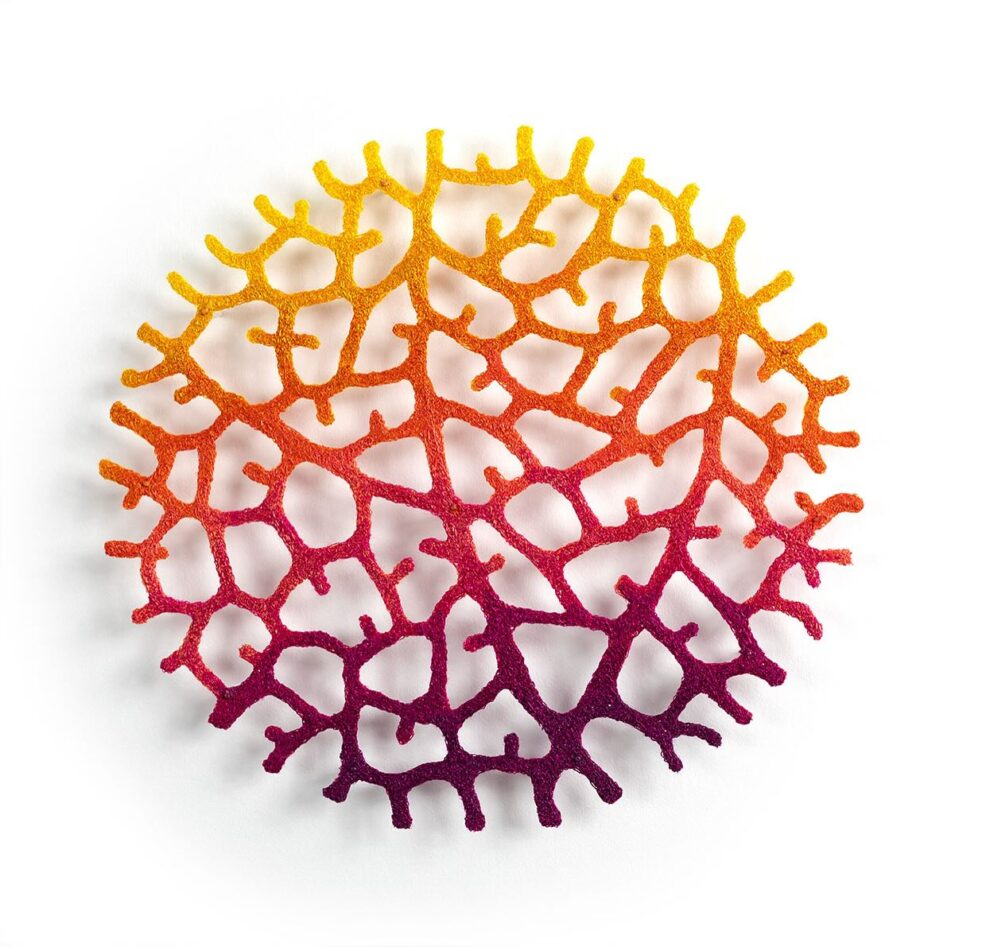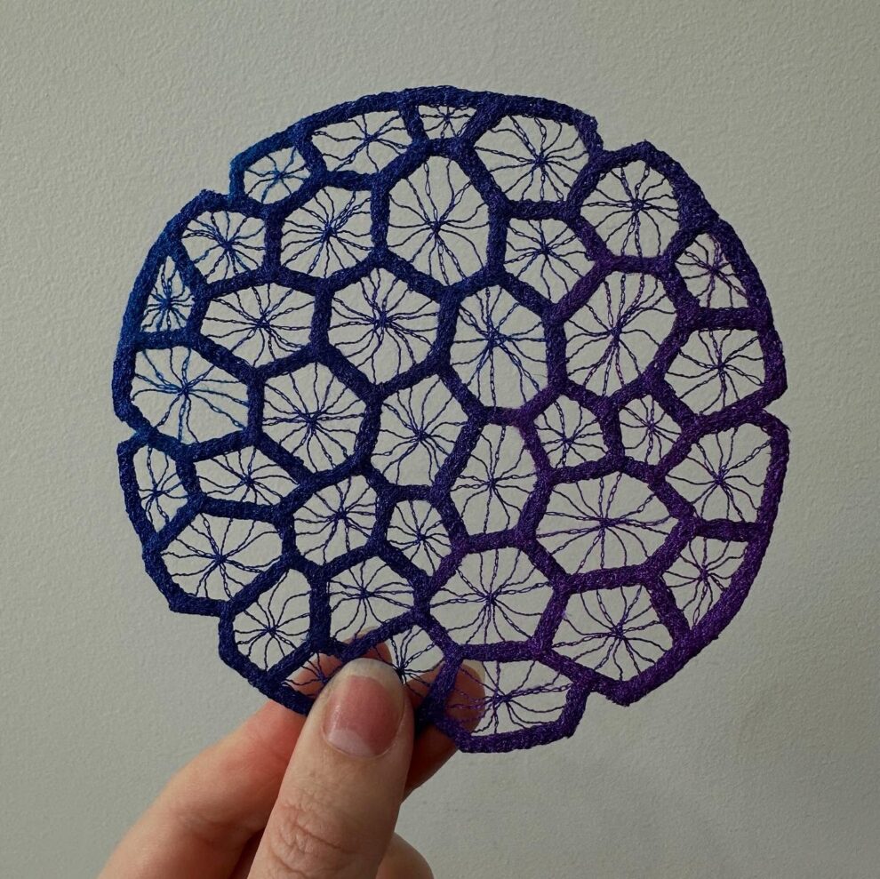 Her practice combines art, science, and natural history; she uses freehand machine embroidery on water-soluble fabric to create lace-like forms inspired by coral, leaves, fungi, and anatomical structures. Once the base fabric dissolves, only her fine stitched “skeletons” remain—ethereal works that seem suspended between fragility and resilience. Woolnough’s art has been exhibited internationally in over 40 shows, and her large-scale installation The New Neighbours—composed of 412 embroidered pieces pinned into a circular formation—was featured at ‘The Third Tamworth Textile Triennial.’ Her book ‘Organic Embroidery’ and workshops have inspired artists worldwide, while her social media presence connects over 300,000 followers to new series, process videos, and studio insights that merge craftsmanship with environmental consciousness.