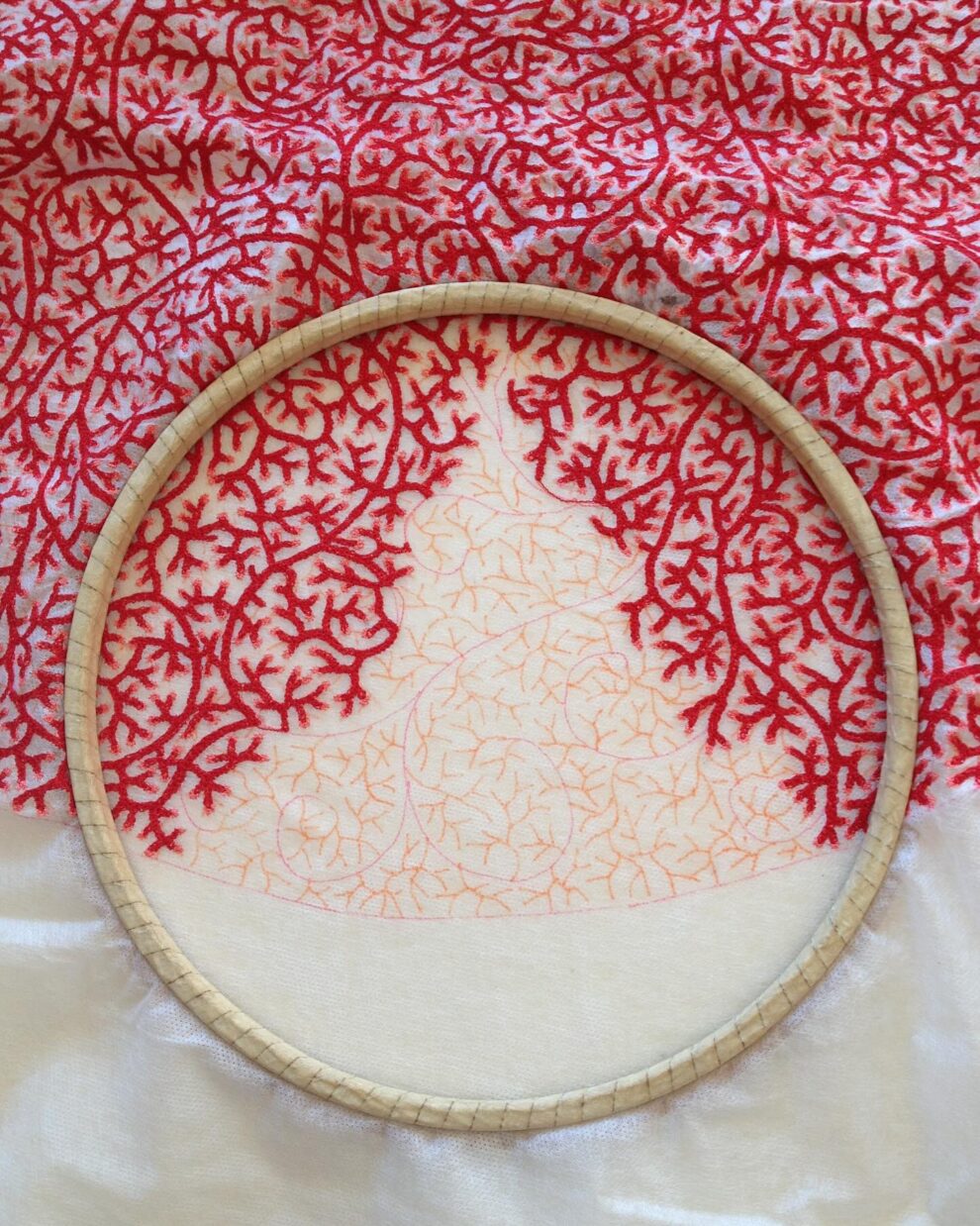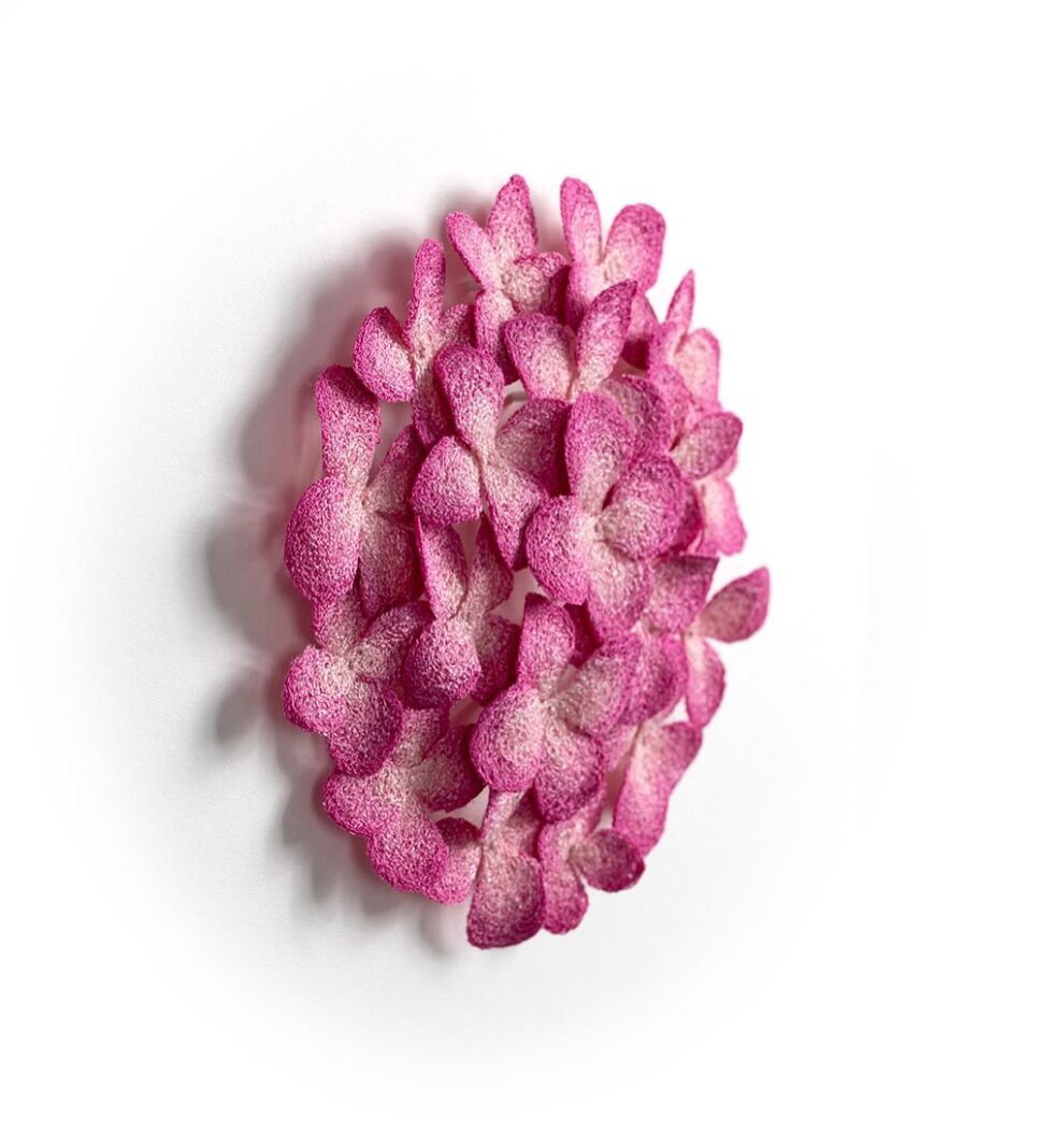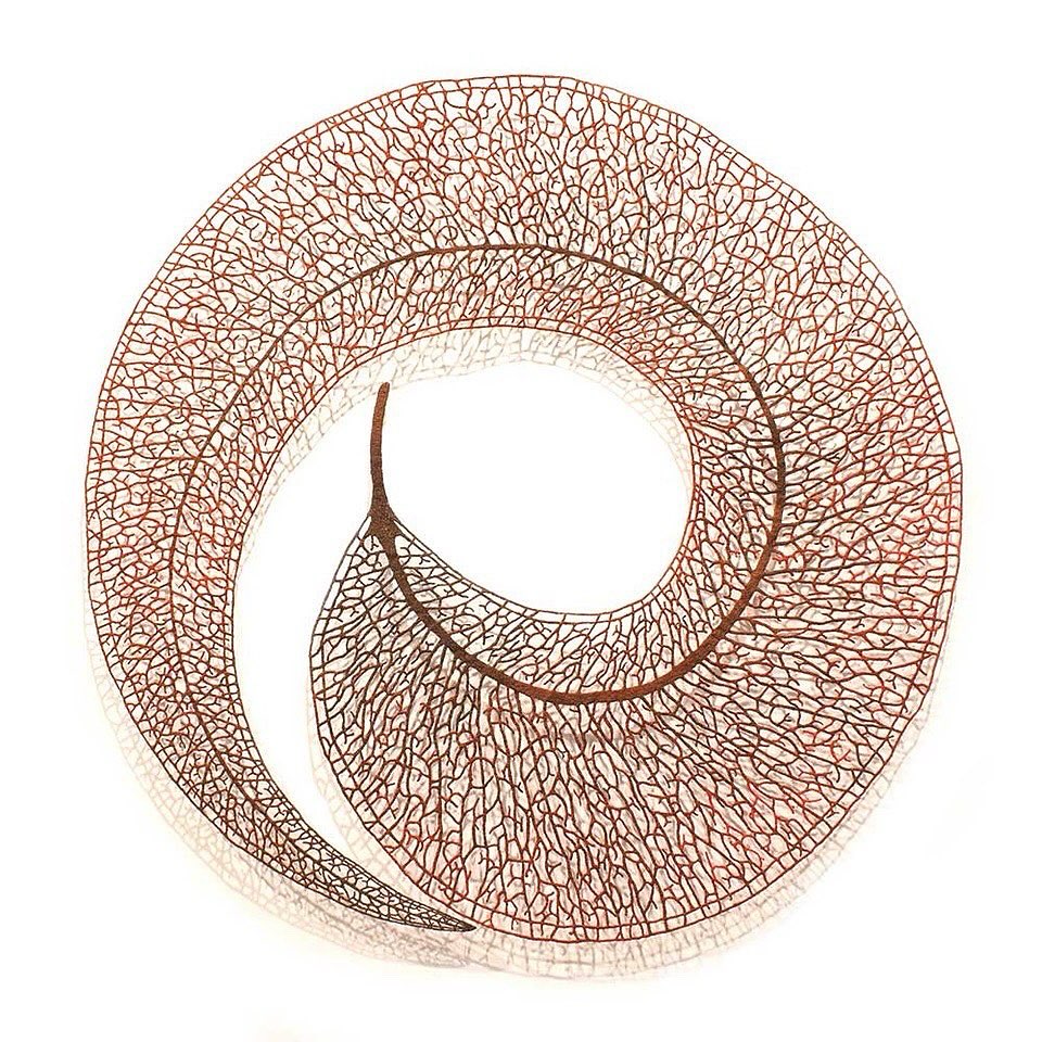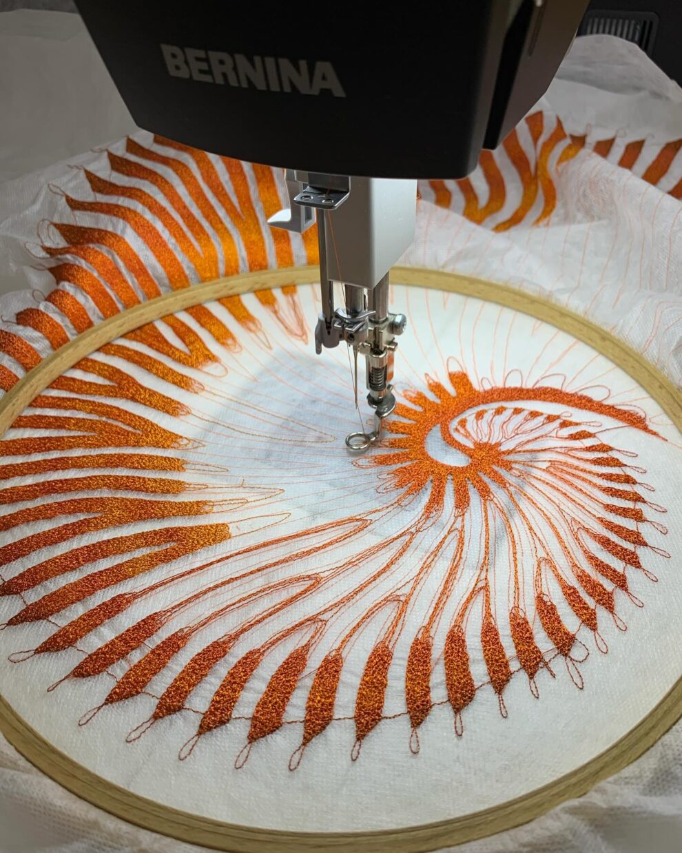 Her practice combines art, science, and natural history; she uses freehand machine embroidery on water-soluble fabric to create lace-like forms inspired by coral, leaves, fungi, and anatomical structures. Once the base fabric dissolves, only her fine stitched “skeletons” remain—ethereal works that seem suspended between fragility and resilience. Woolnough’s art has been exhibited internationally in over 40 shows, and her large-scale installation The New Neighbours—composed of 412 embroidered pieces pinned into a circular formation—was featured at ‘The Third Tamworth Textile Triennial.’ Her book ‘Organic Embroidery’ and workshops have inspired artists worldwide, while her social media presence connects over 300,000 followers to new series, process videos, and studio insights that merge craftsmanship with environmental consciousness.