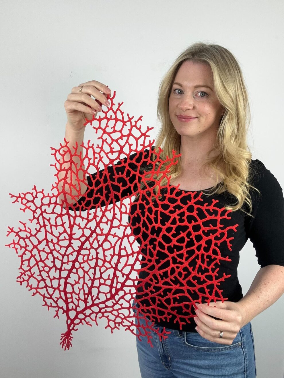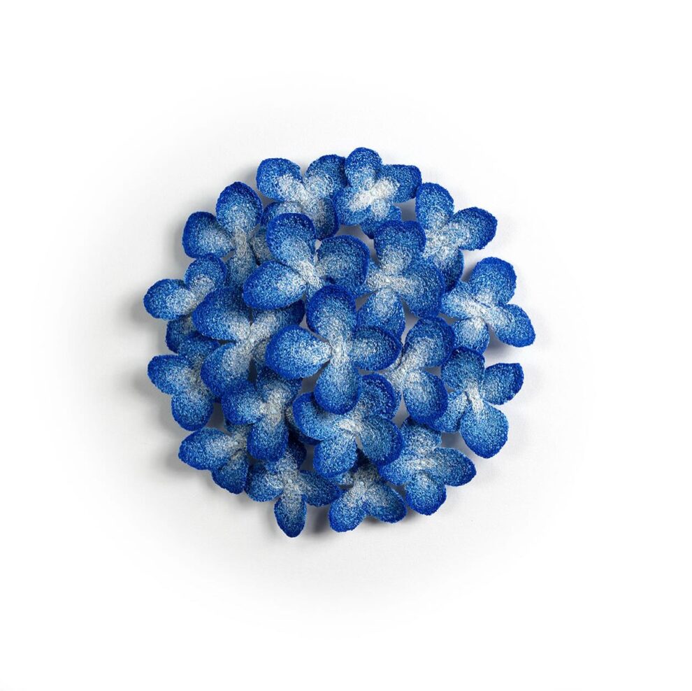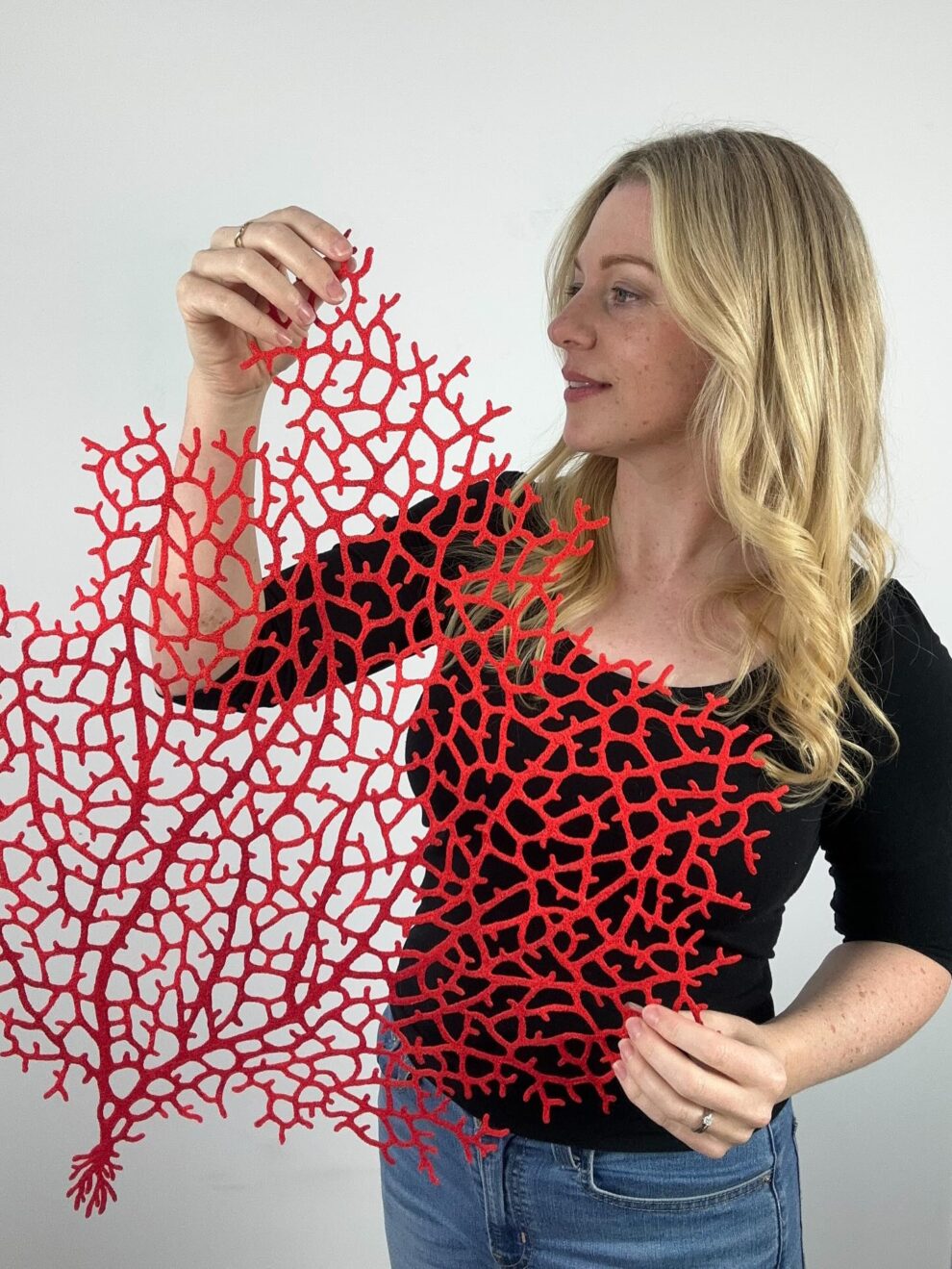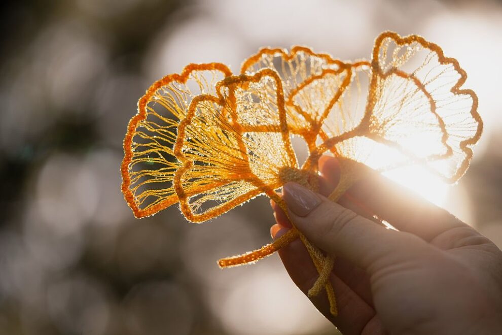 Her practice combines art, science, and natural history; she uses freehand machine embroidery on water-soluble fabric to create lace-like forms inspired by coral, leaves, fungi, and anatomical structures. Once the base fabric dissolves, only her fine stitched “skeletons” remain—ethereal works that seem suspended between fragility and resilience. Woolnough’s art has been exhibited internationally in over 40 shows, and her large-scale installation The New Neighbours—composed of 412 embroidered pieces pinned into a circular formation—was featured at ‘The Third Tamworth Textile Triennial.’ Her book ‘Organic Embroidery’ and workshops have inspired artists worldwide, while her social media presence connects over 300,000 followers to new series, process videos, and studio insights that merge craftsmanship with environmental consciousness.