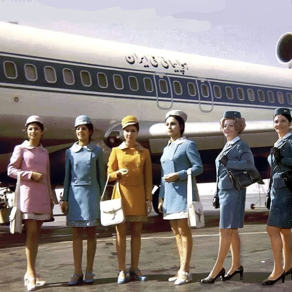 Its flight attendants symbolized a modern, outward‑looking Iran, and the position was regarded as an elite and highly desirable profession for young women. Throughout the 1960s and 70s, these stewardesses became international style icons, embodying the glamour of the Jet Age. Their uniforms, often created by top fashion designers, featured tailored blazers, knee‑length skirts, and elegant pillbox hats.