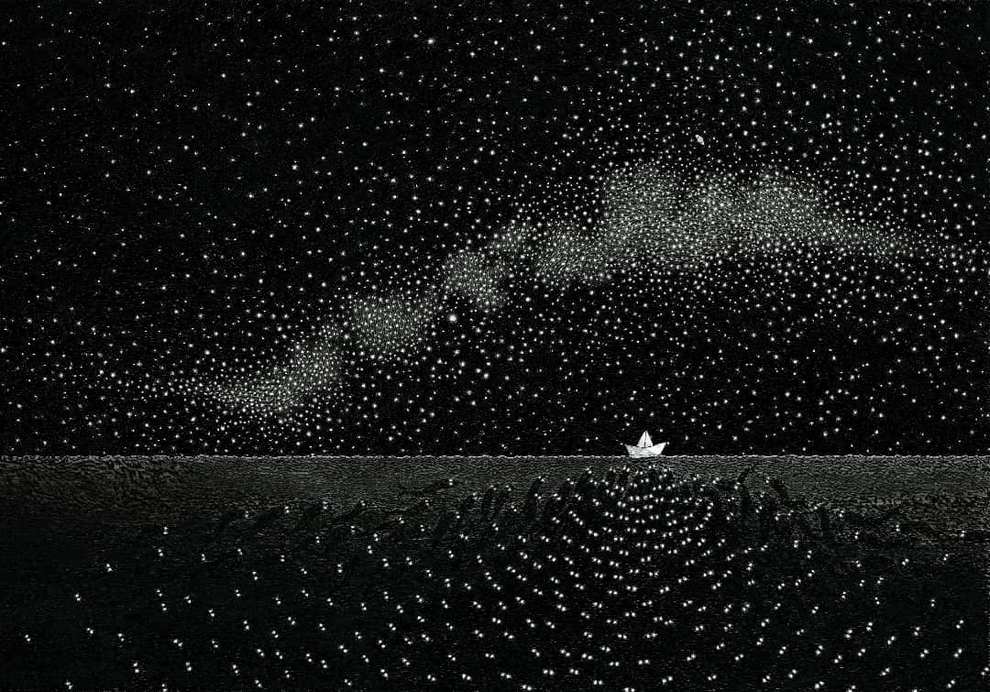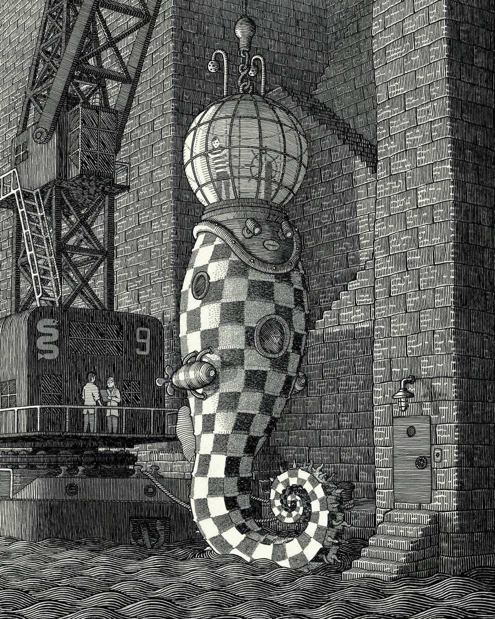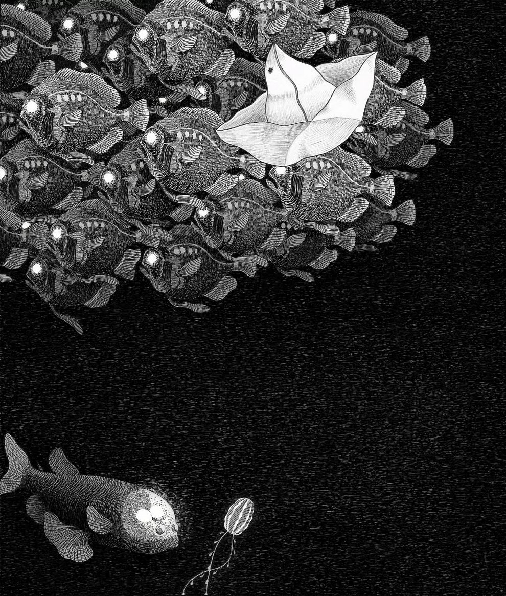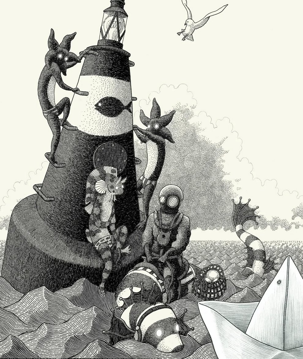 Peter van den Ende is a Belgian illustrator and author born in Antwerp in 1985, best known for his debut wordless picture book The Wanderer (Zwerveling), a hand-drawn epic following a paper boat’s fantastical ocean journey through ink-black seas, mechanical sea monsters, icy poles and alien depths.