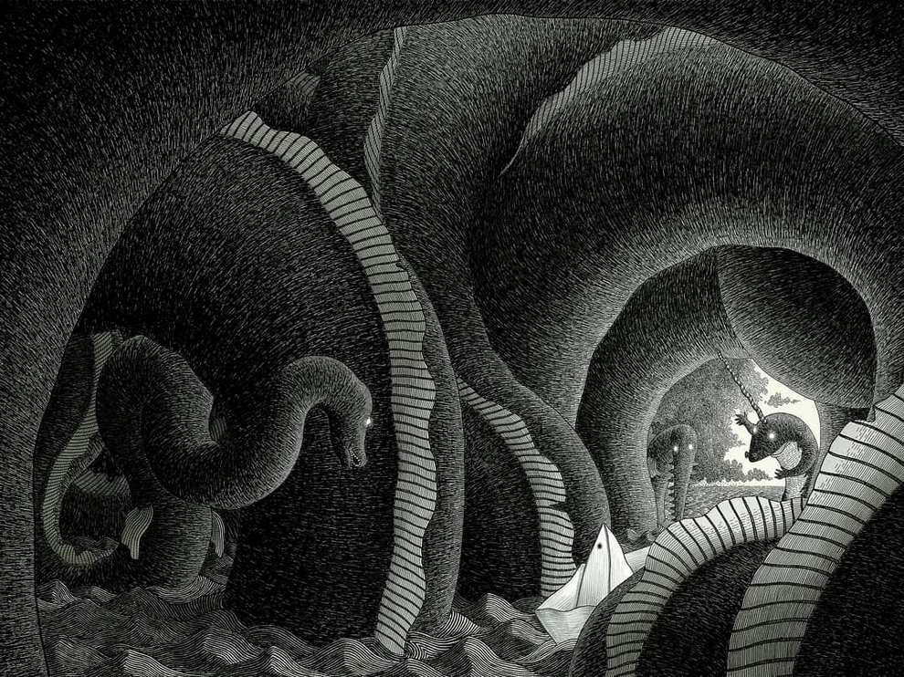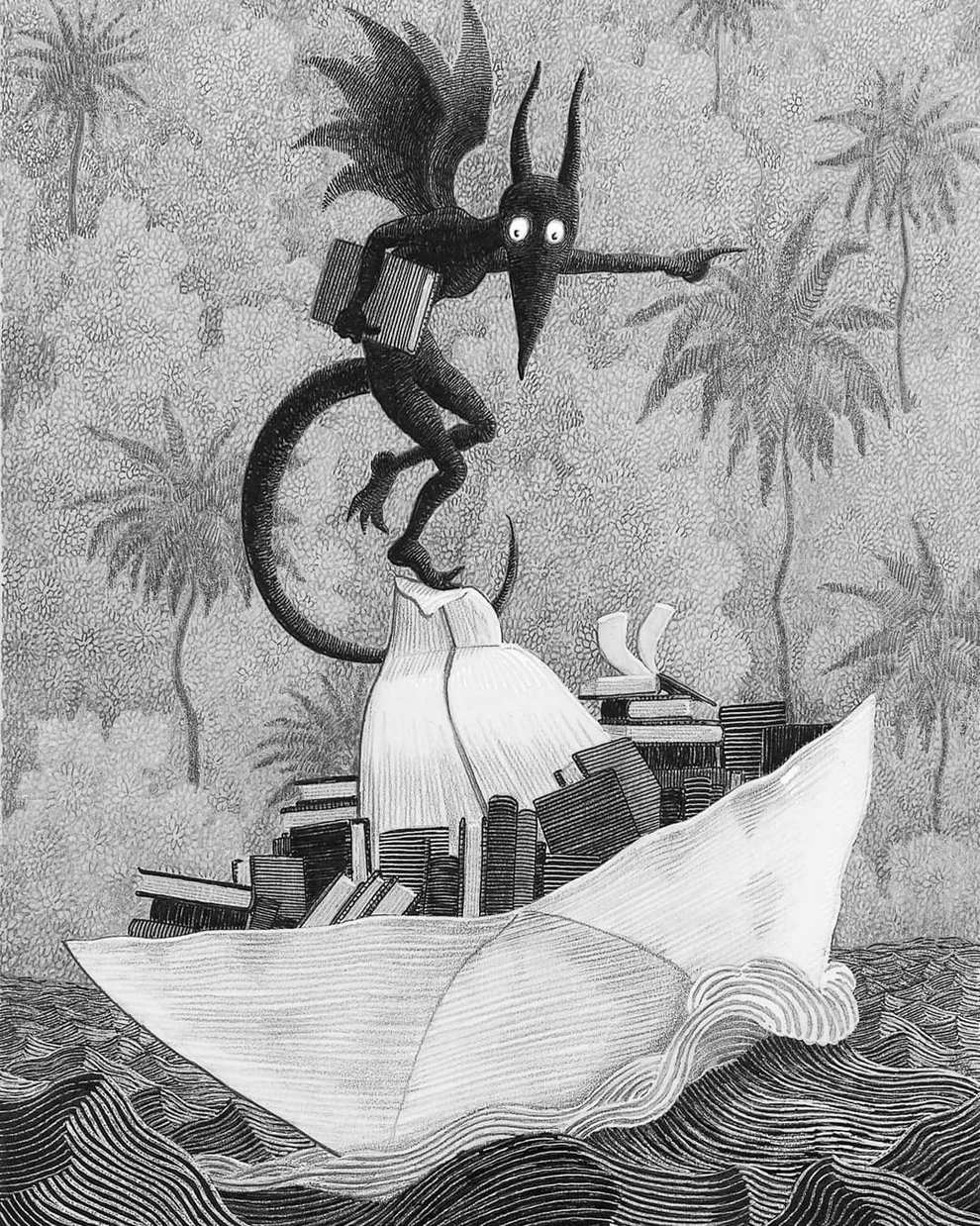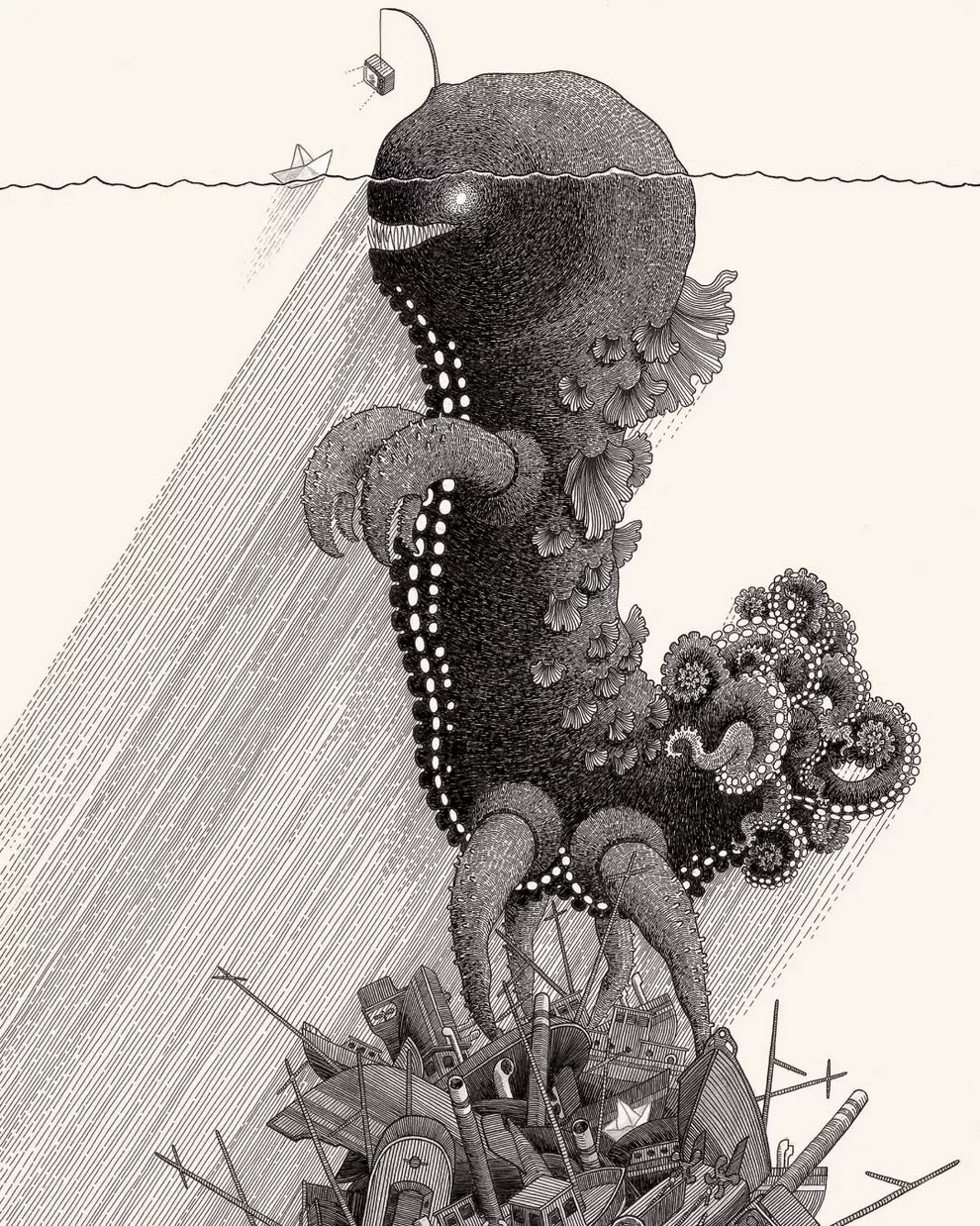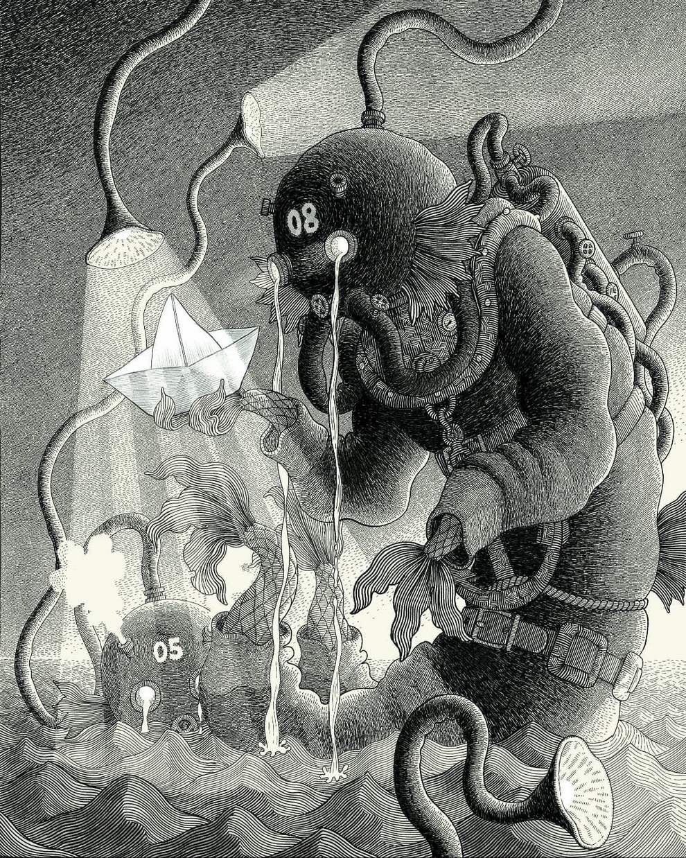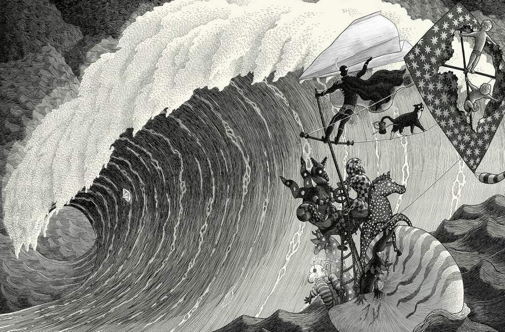 Peter van den Ende is a Belgian illustrator and author born in Antwerp in 1985, best known for his debut wordless picture book The Wanderer (Zwerveling), a hand-drawn epic following a paper boat’s fantastical ocean journey through ink-black seas, mechanical sea monsters, icy poles and alien depths.