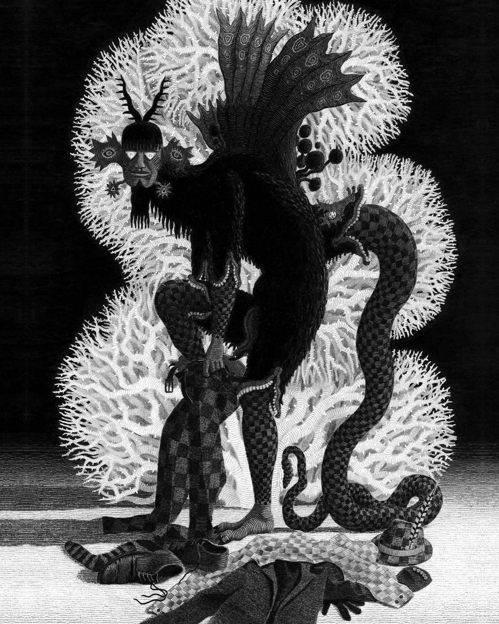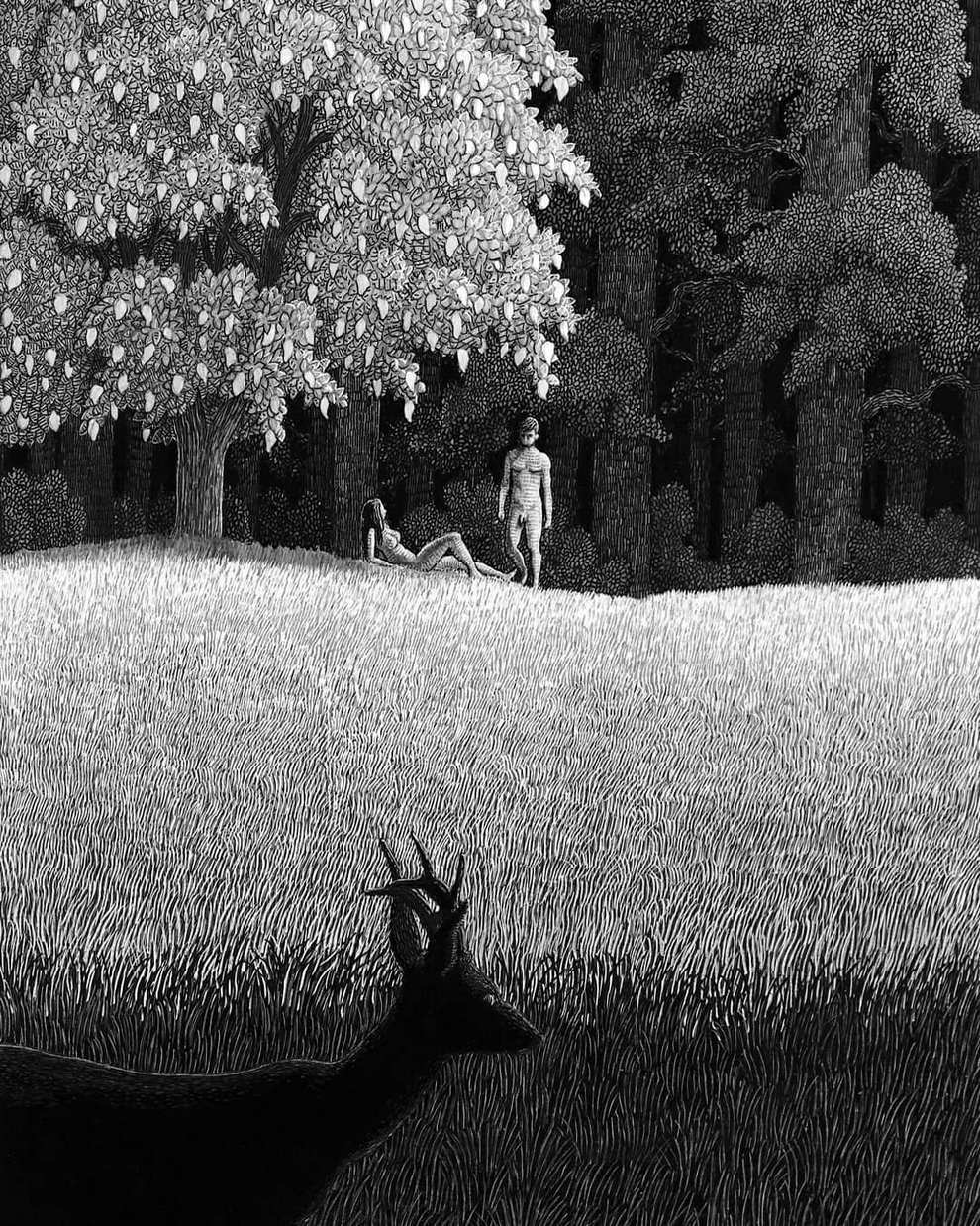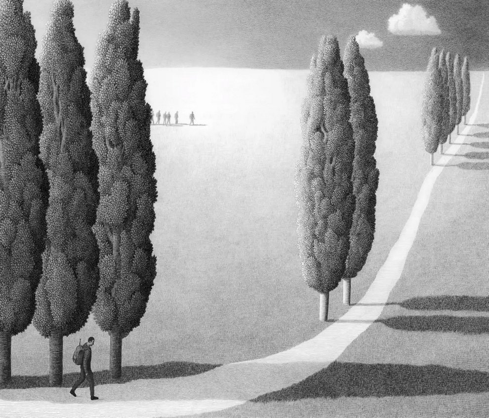 Trained in biology but always doodling, he worked as a nature guide in the Cayman Islands before committing to art full-time; his style features hyper-detailed, monochromatic pen-and-ink worlds packed with symbolism, creatures and impossible architecture that invite endless discovery for all ages. The Wanderer won awards like the Dilys Evans Founder’s Award, appeared in Best Dutch Book Designs and Ilustrarte selections, and has been translated widely, while he now teaches workshops, exhibits originals and works on new projects like dinosaur sketches.