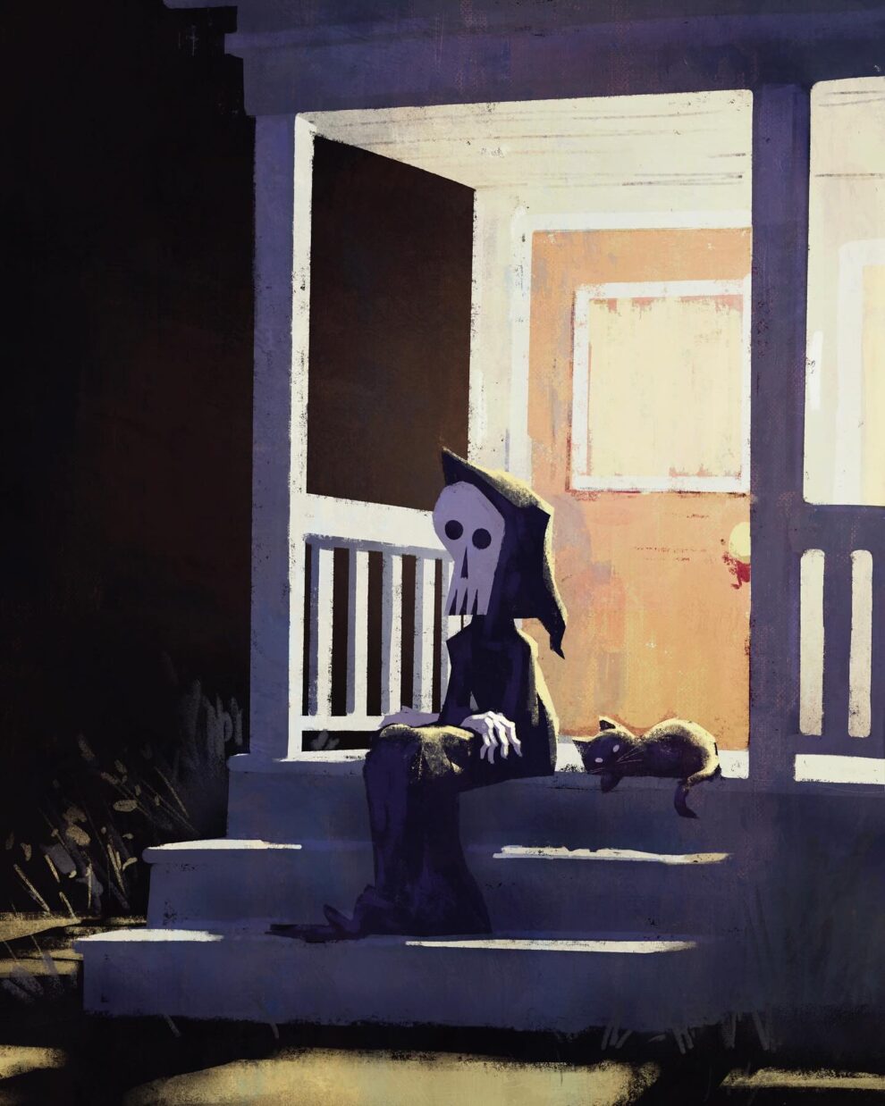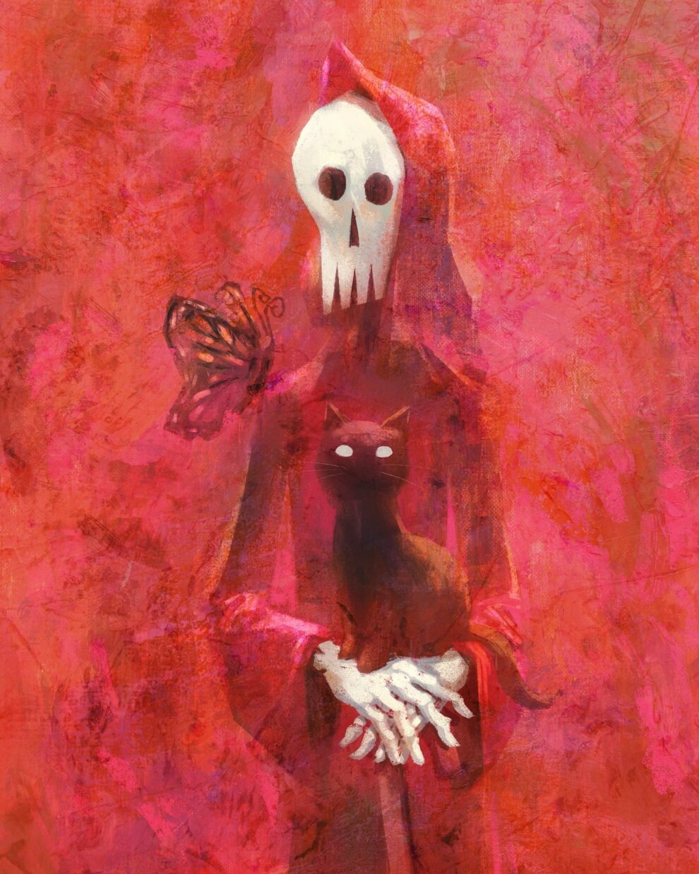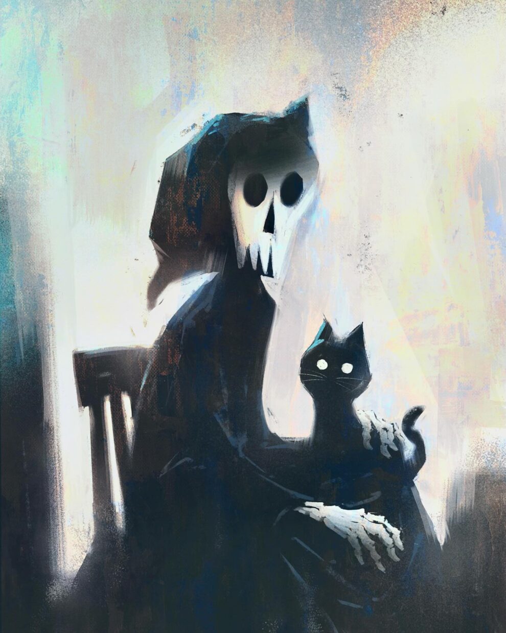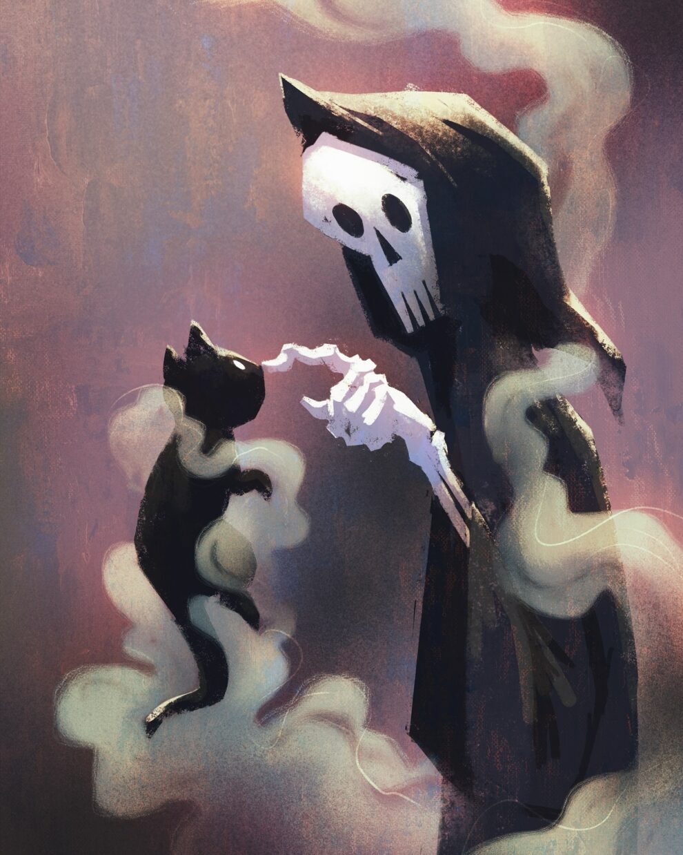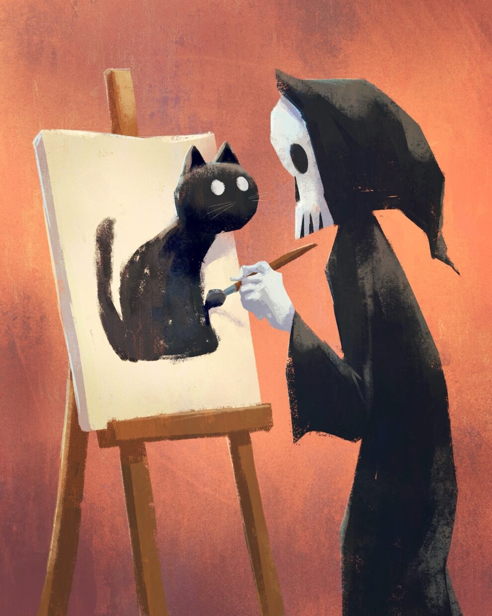 Illustrator Creates The “Dead Cat” Painting Series With Grim Reaper And Cat Sidekick Wandering Through A Whimsical, Soft‑spoken Afterlife