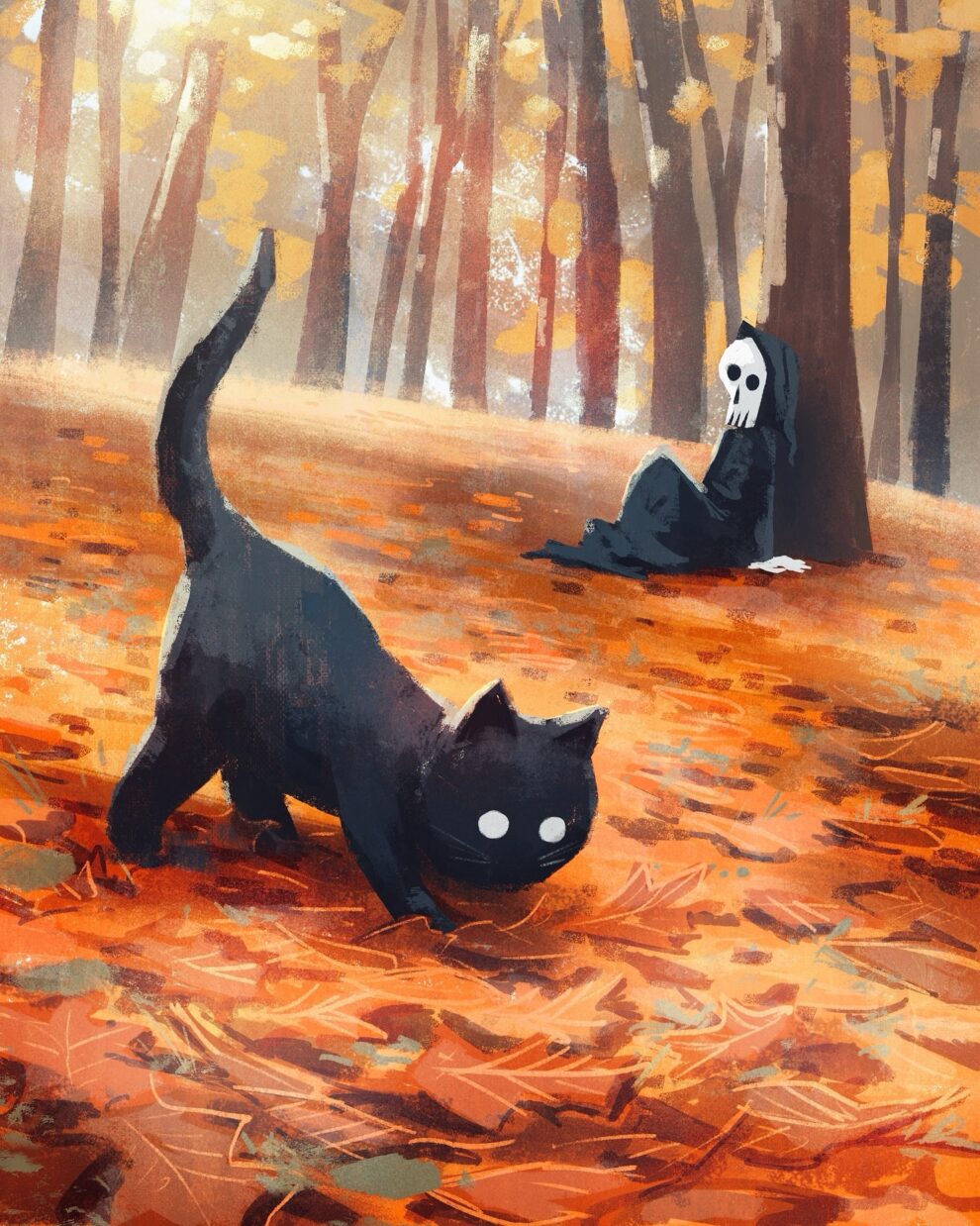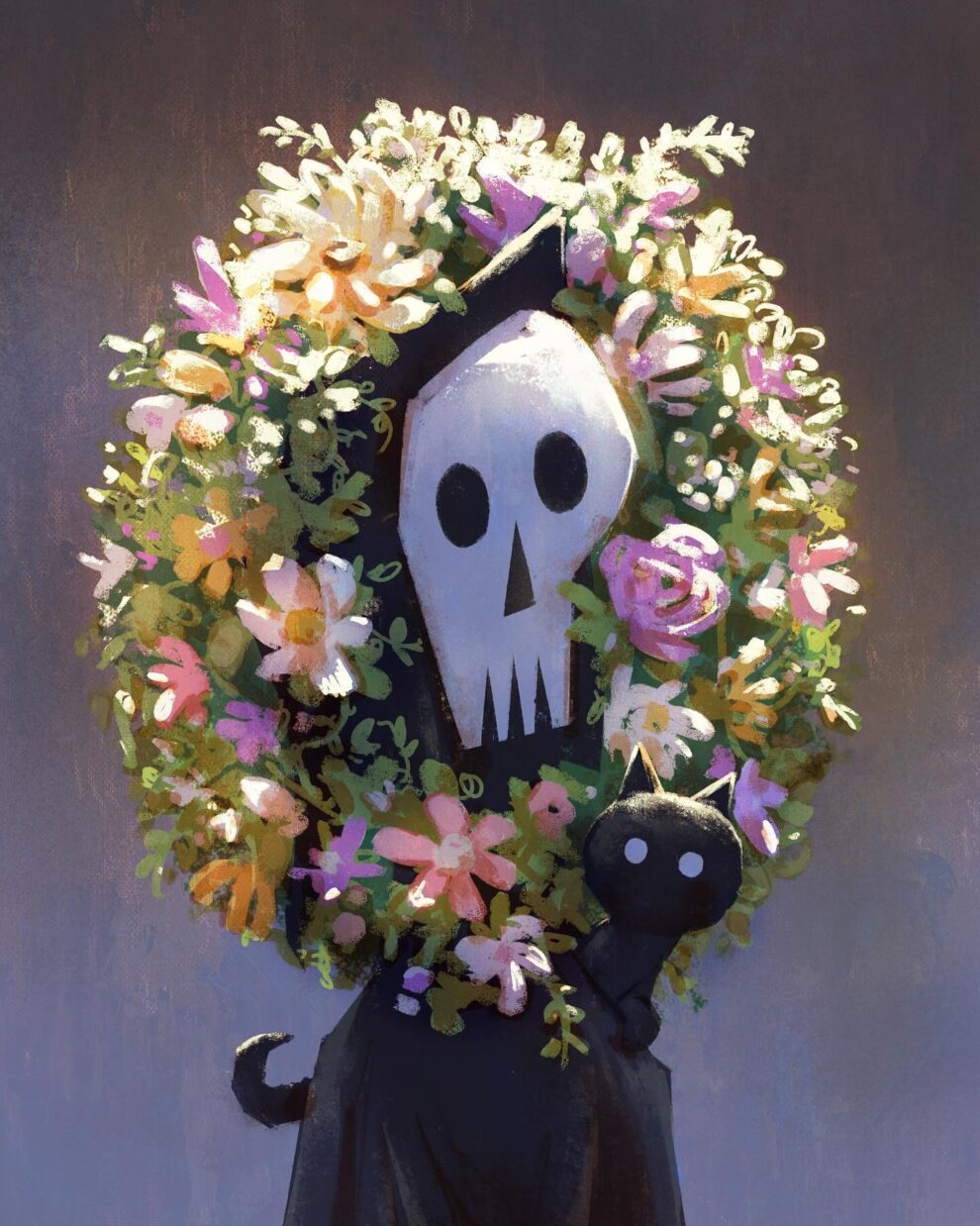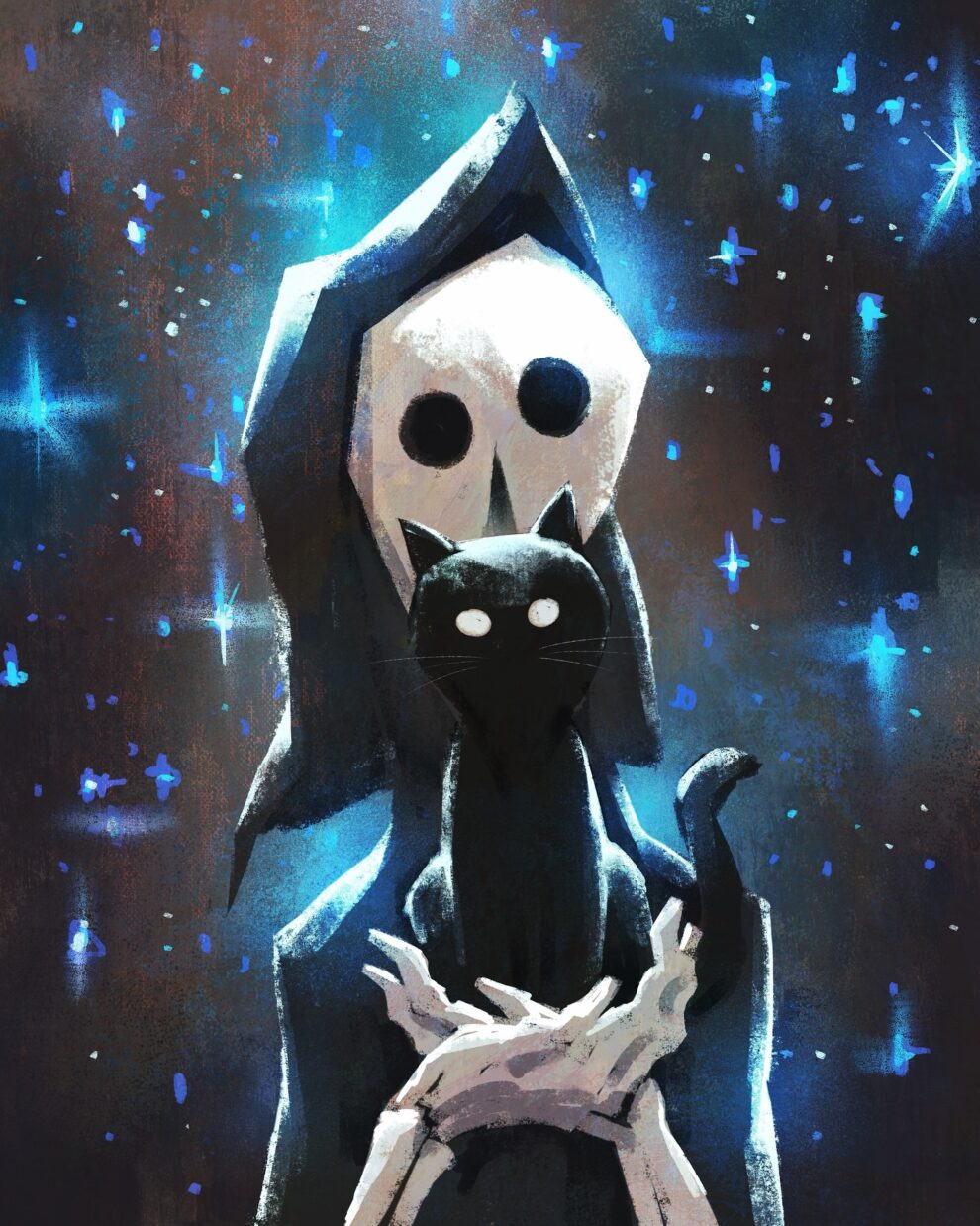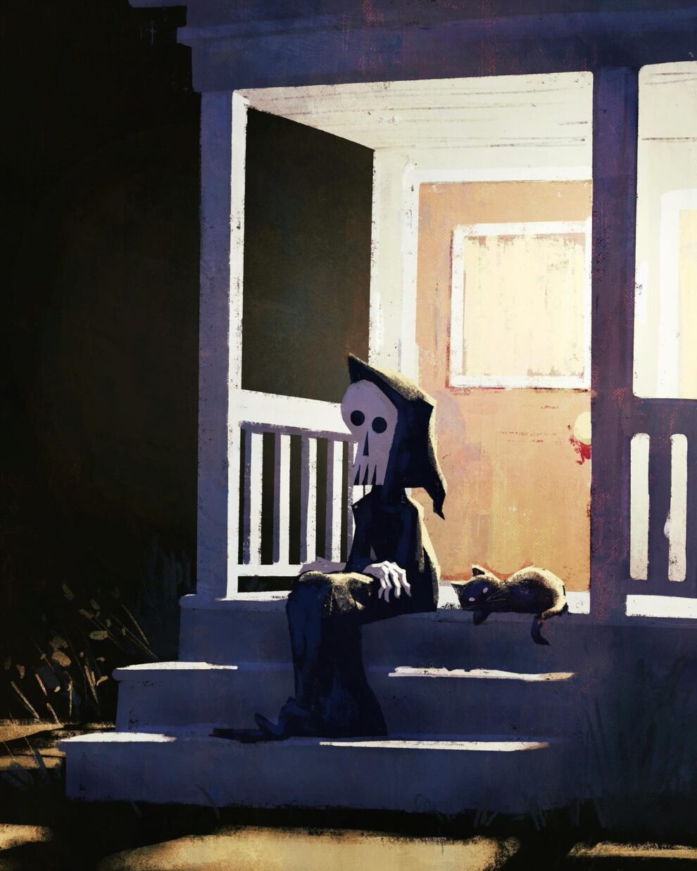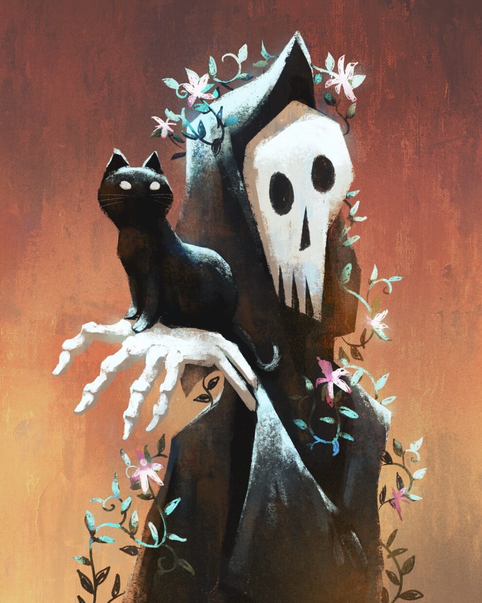 Illustrator Creates The “Dead Cat” Painting Series With Grim Reaper And Cat Sidekick Wandering Through A Whimsical, Soft‑spoken Afterlife