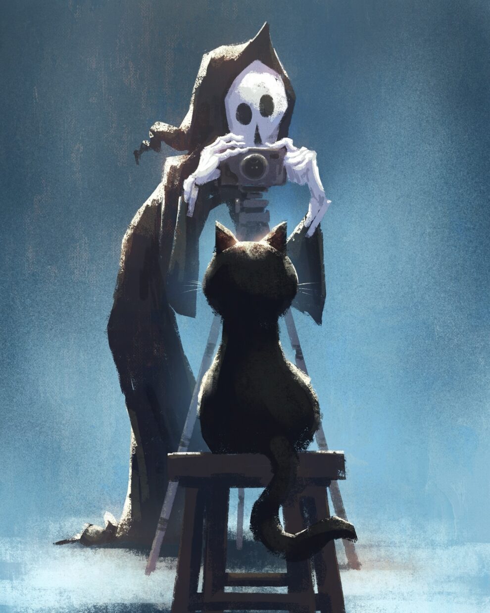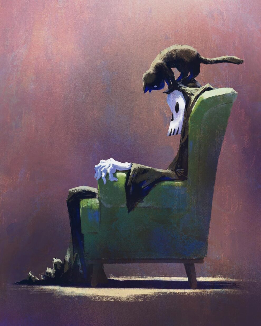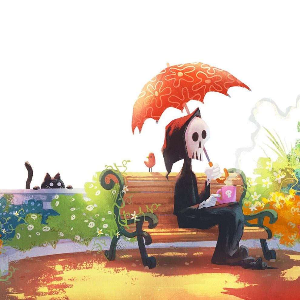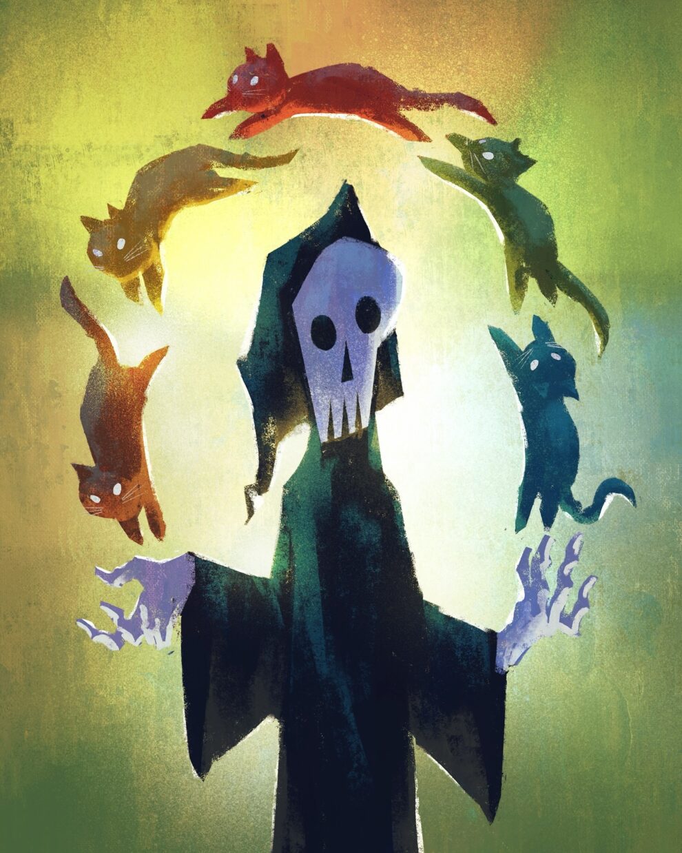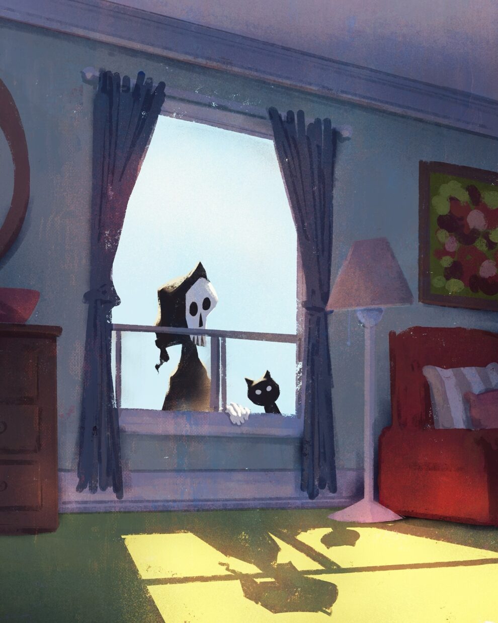 Illustrator Creates The “Dead Cat” Painting Series With Grim Reaper And Cat Sidekick Wandering Through A Whimsical, Soft‑spoken Afterlife