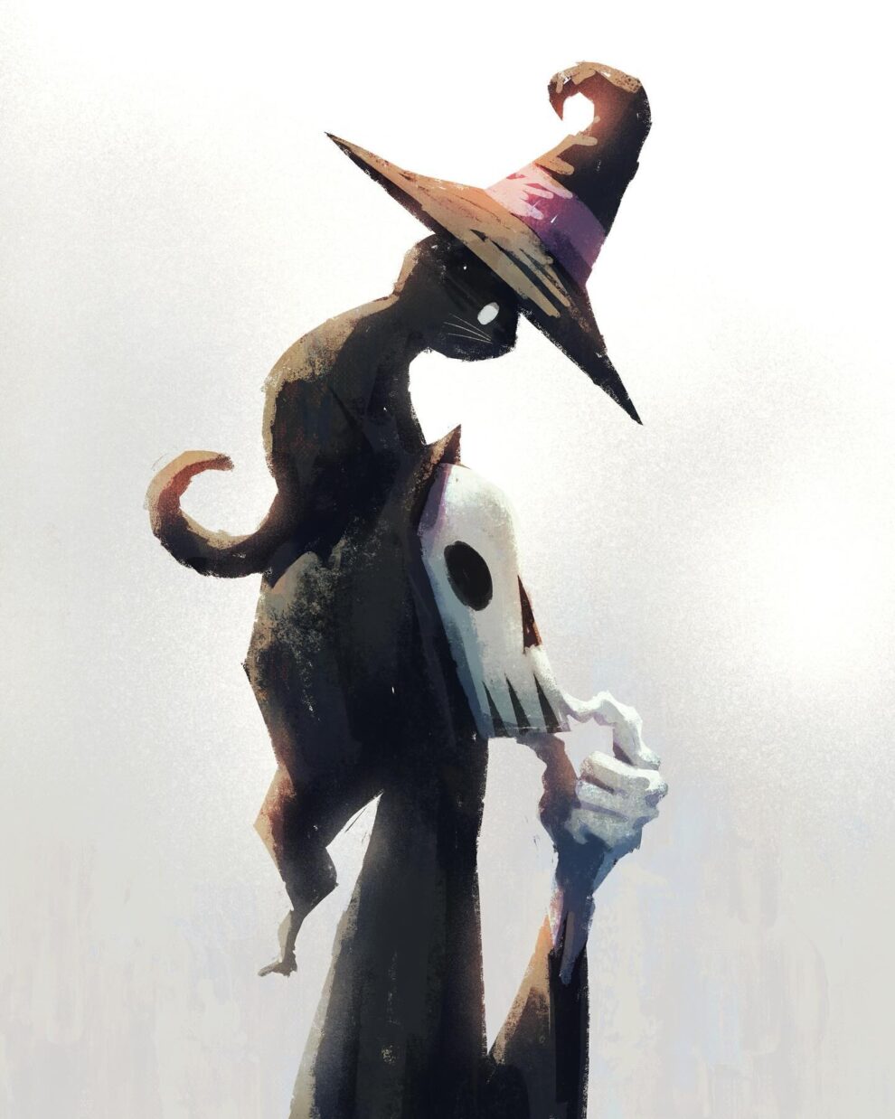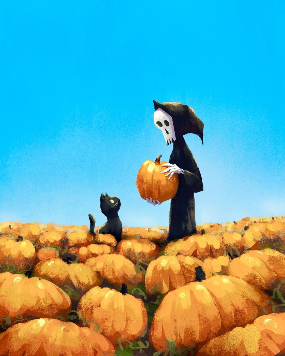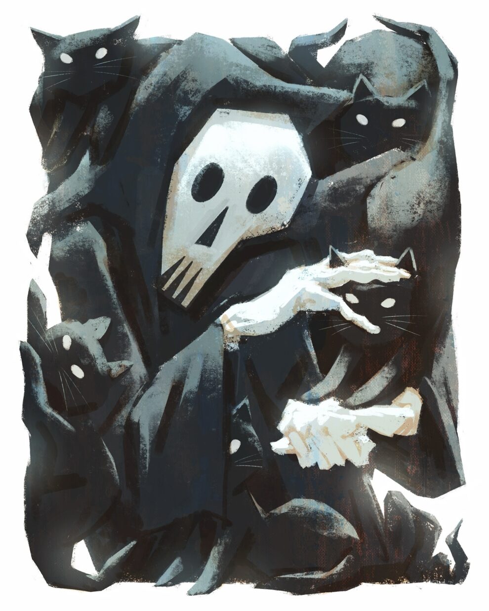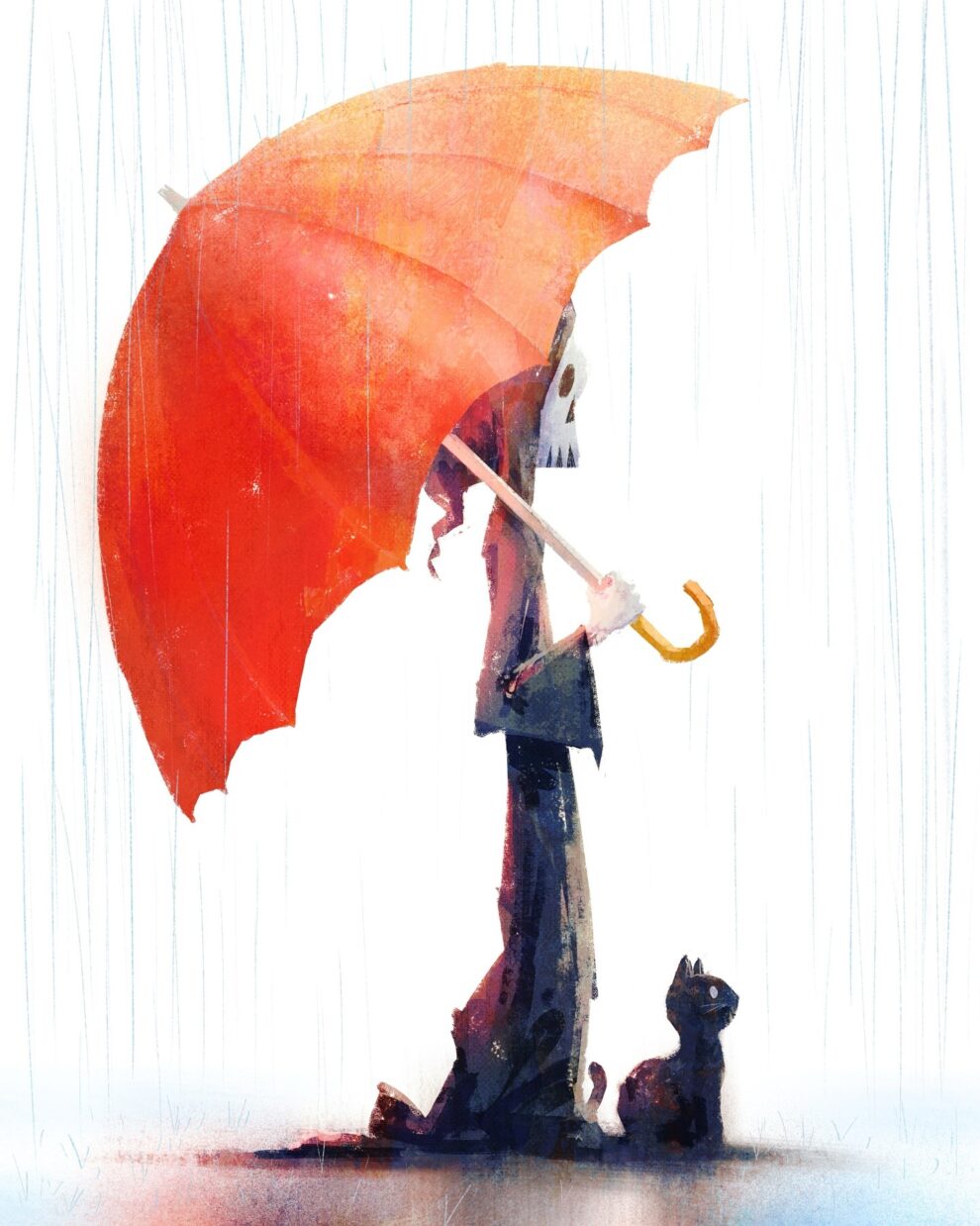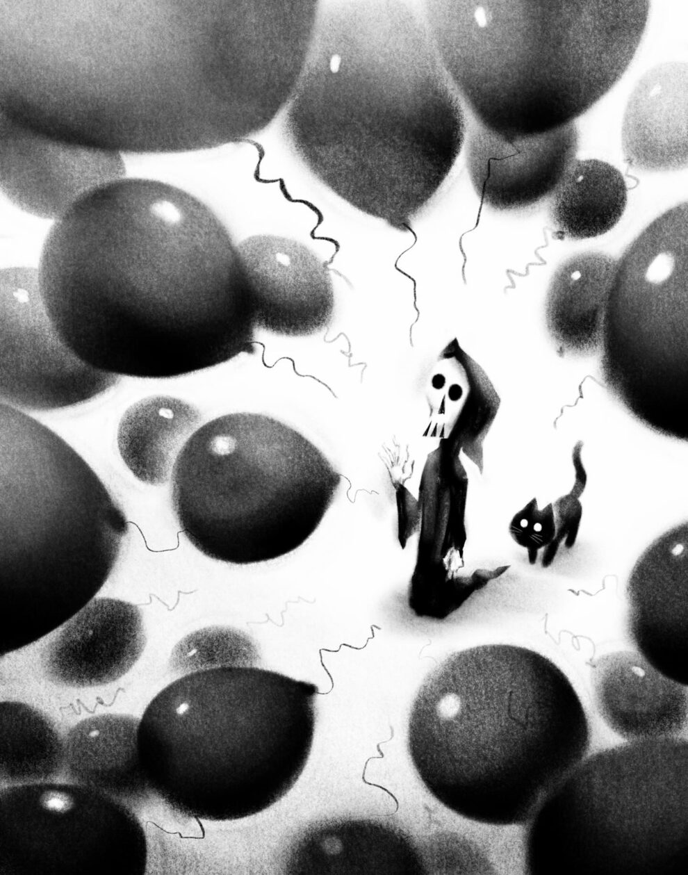 Illustrator Creates The “Dead Cat” Painting Series With Grim Reaper And Cat Sidekick Wandering Through A Whimsical, Soft‑spoken Afterlife