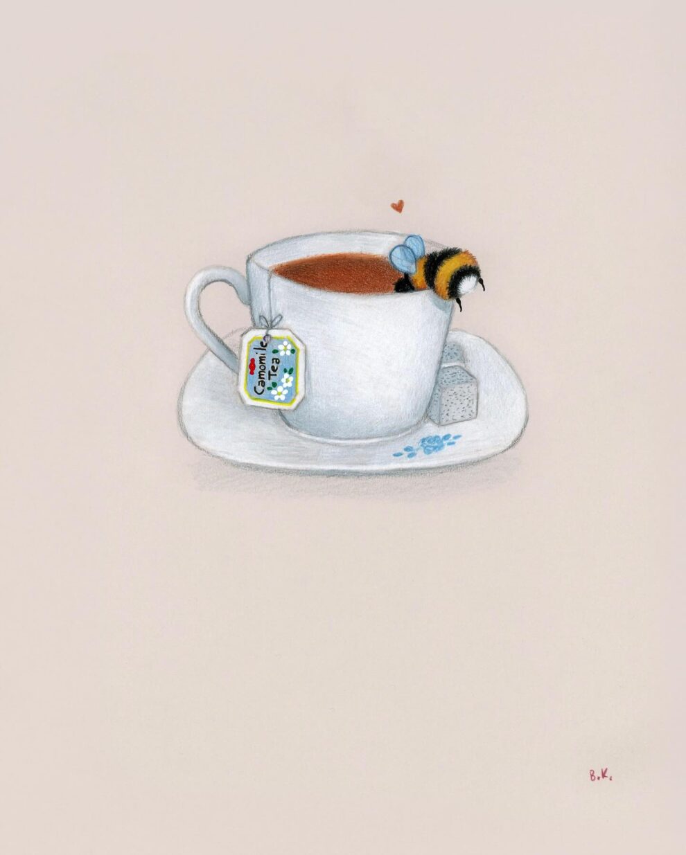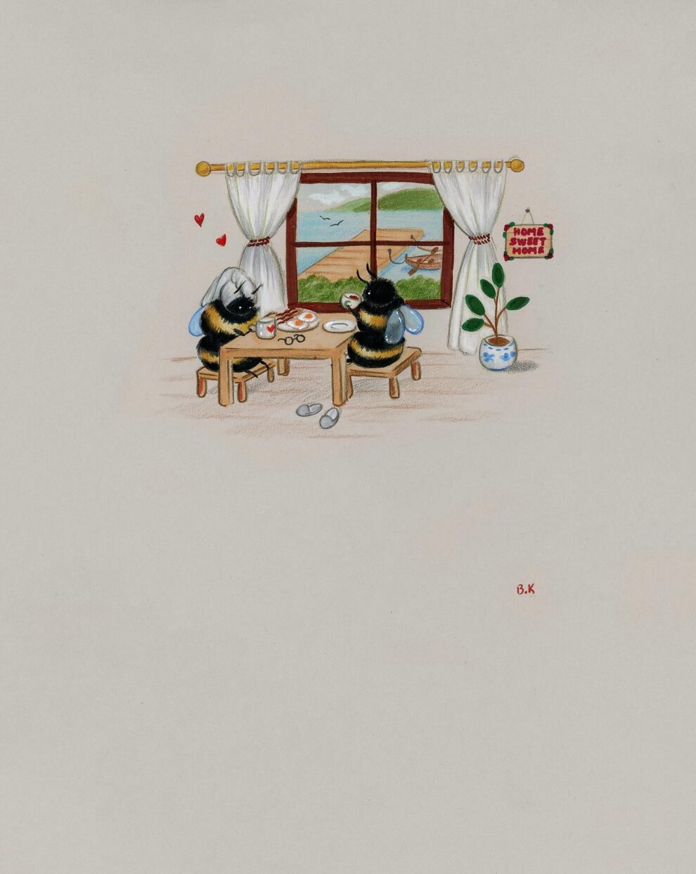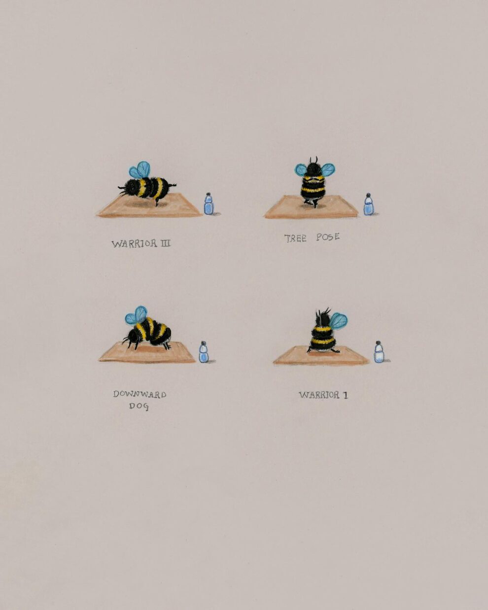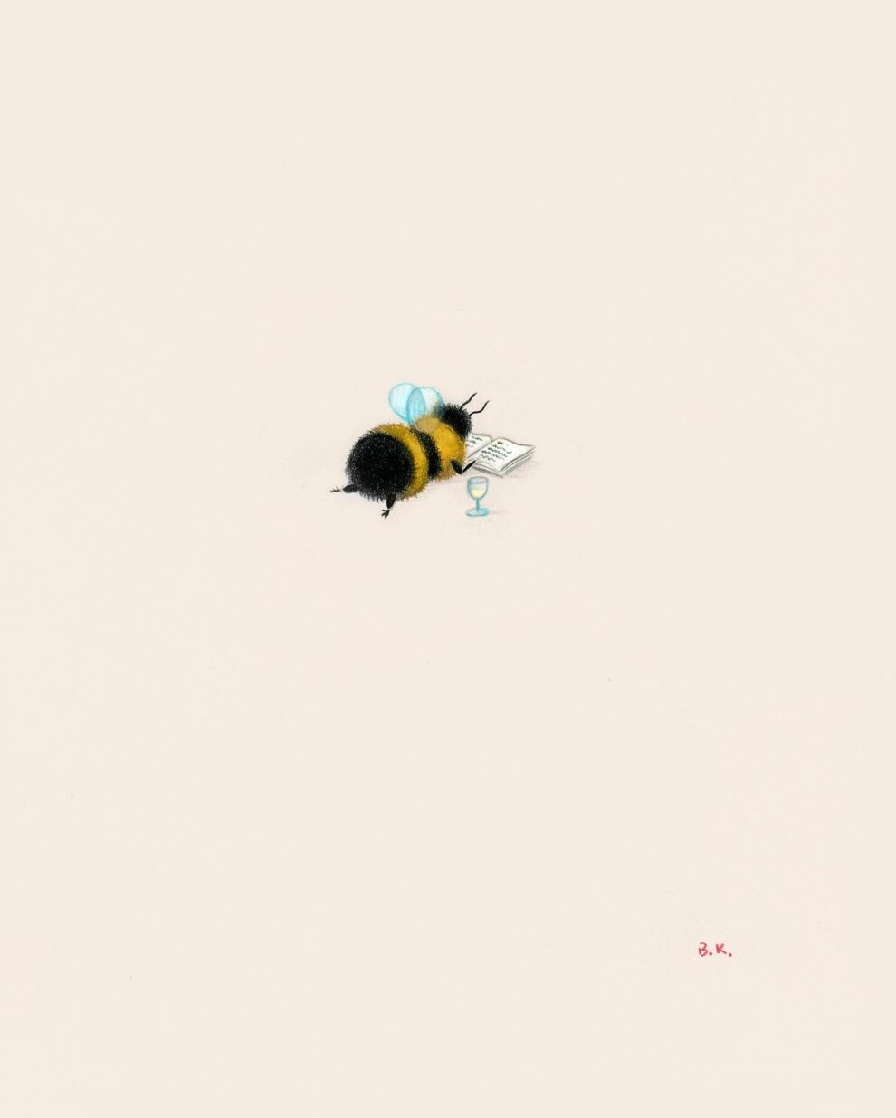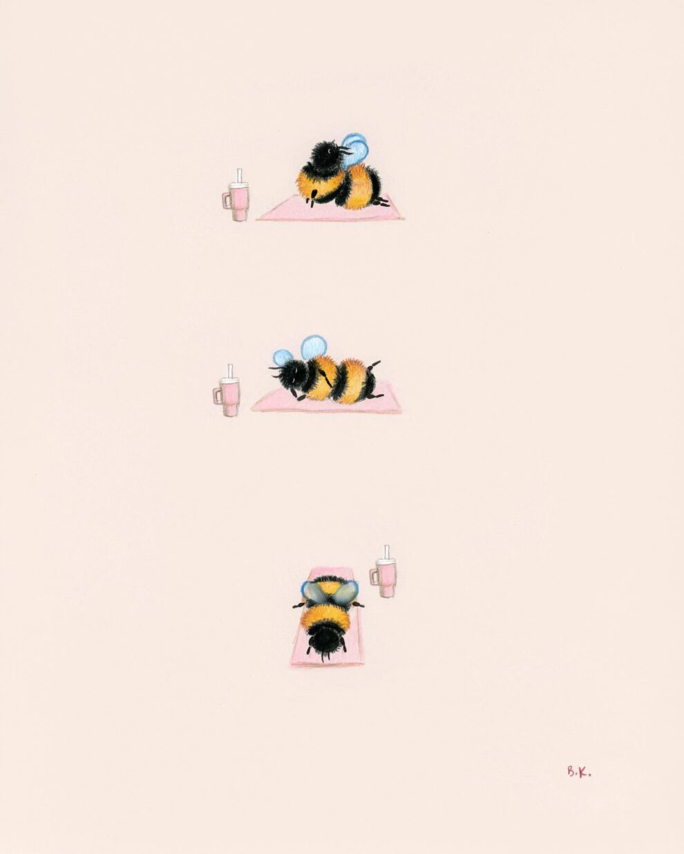 Using simple lines, soft colour and plenty of white space, the artist turns tiny scenes of reading, stretching, drinking coffee or working into gentle visual jokes and cozy micro‑stories for bee lovers, bookworms and self‑care nerds. The work appears in posts, logos and patterns, with a small shop “coming soon,” suggesting prints, stationery and fabric designs built around this calm, humorous bee universe.