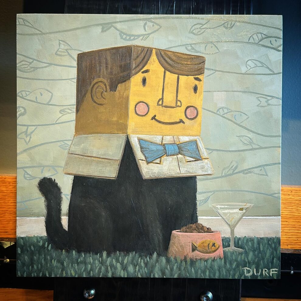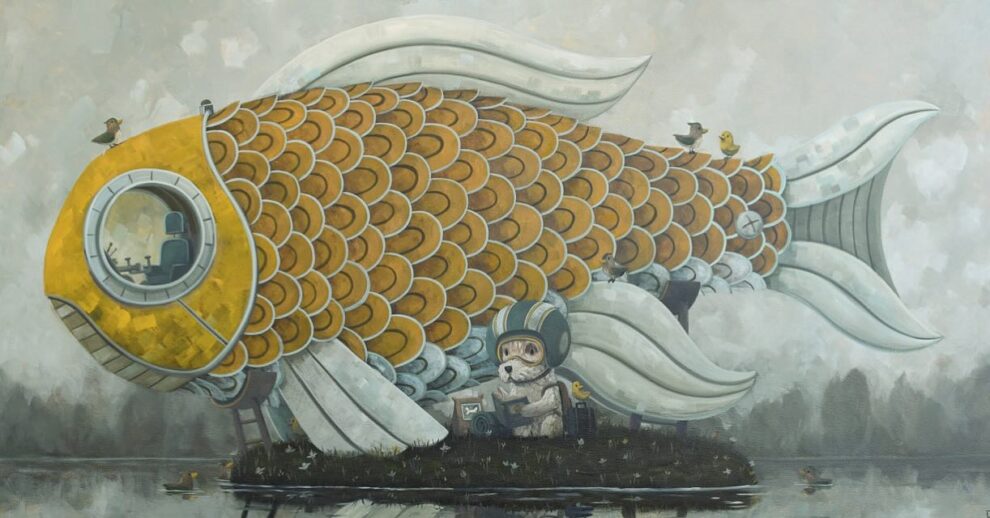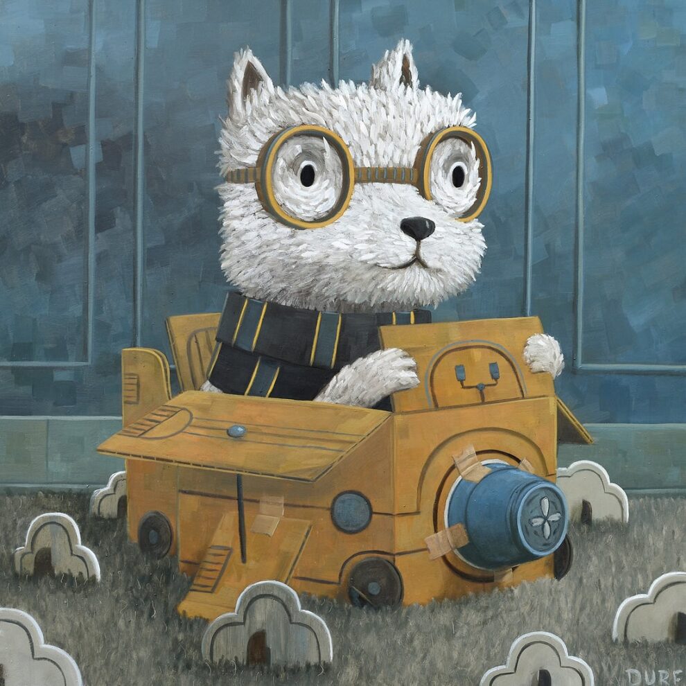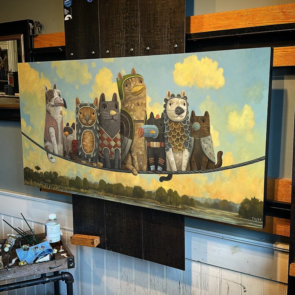 Nathan Durfee is an American painter and illustrator based in Charleston, South Carolina, known for whimsical pop‑surreal narratives packed with quirky animals, kids, and oddball objects in bright, storybook colour.