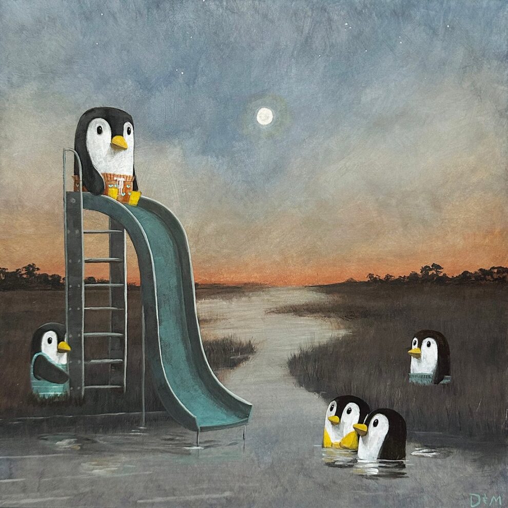 A Vermont native and SCAD illustration graduate, he shifted from editorial work to full‑time painting around 2008–2009, developing large oil‑on‑panel pieces and small works on vintage postcards that mix Monet‑like atmosphere, Rockwell‑style storytelling and Dr. Seuss humour. Represented by galleries such as Robert Lange Studios, Abend Gallery and LeMieux Galleries, his sold‑out solo shows often re‑imagine classic paintings, stage “Dreamer” series about inner lives, and spotlight community and Lowcountry landscapes through his signature, very serious whimsy.