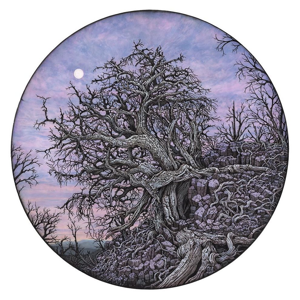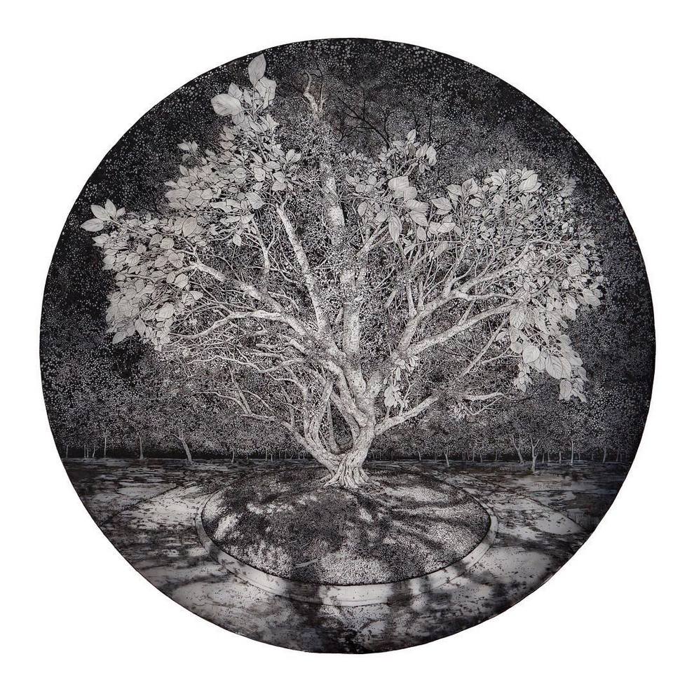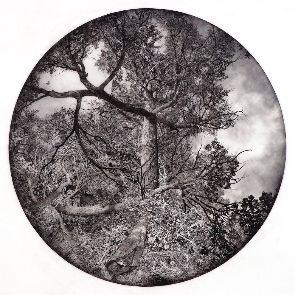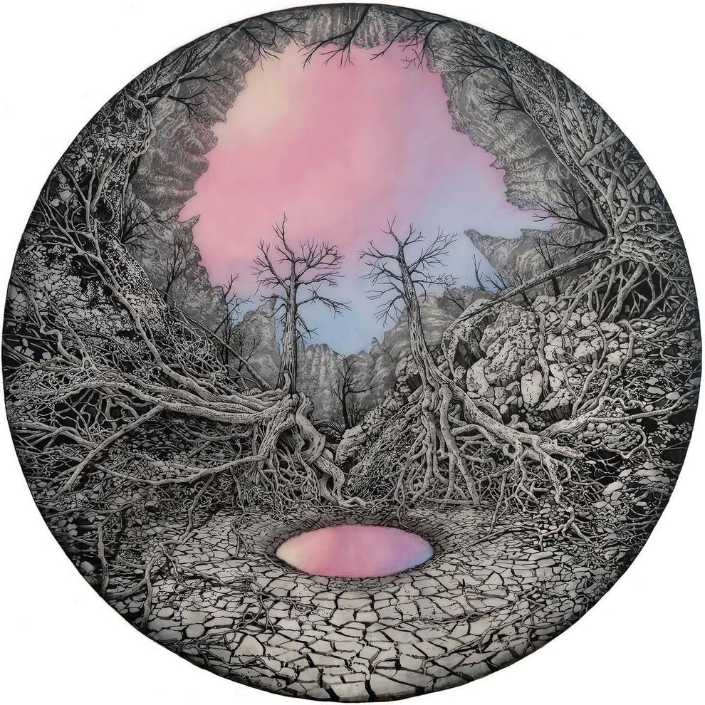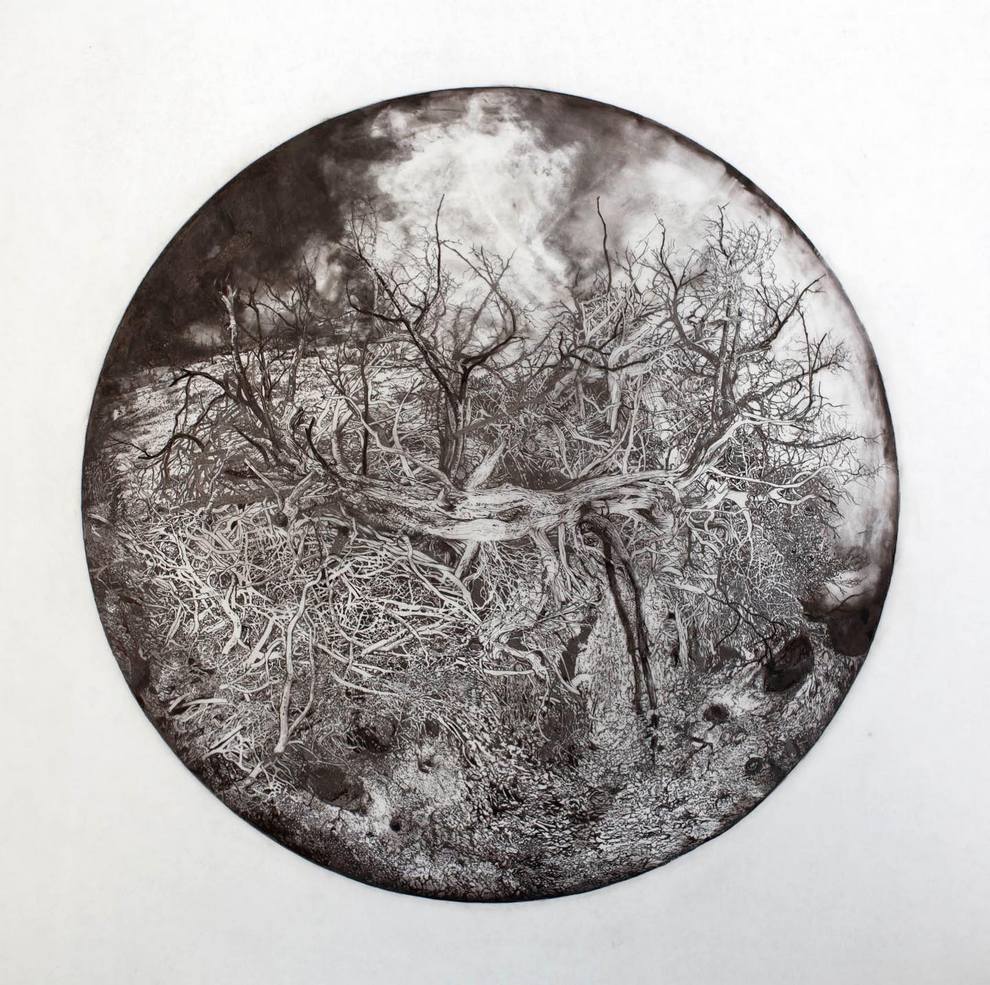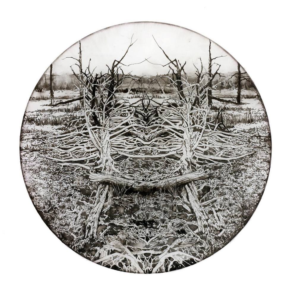 Rachael Pease is a Chicago‑based artist known for meticulous ink drawings on translucent Dura‑Lar that weave real landscapes and trees together with threads of memory, fantasy and speculative futures.
