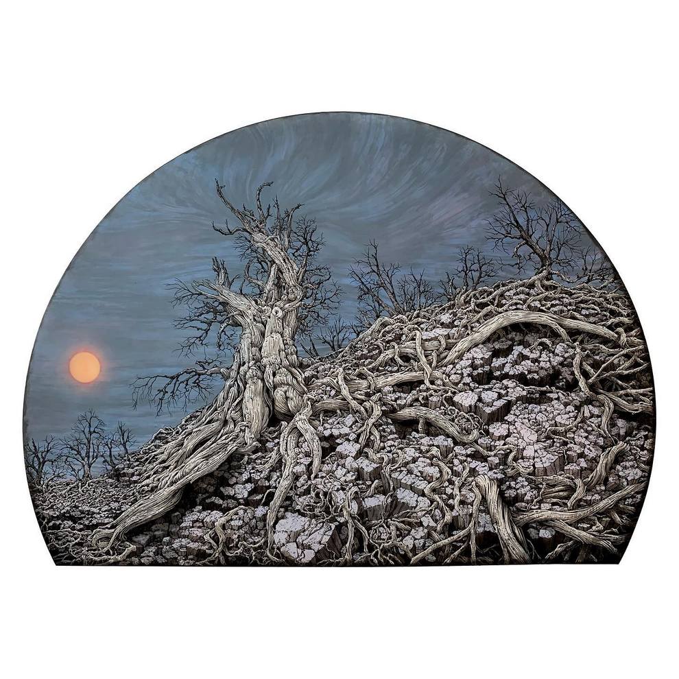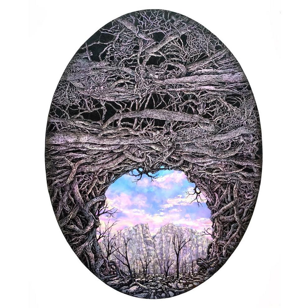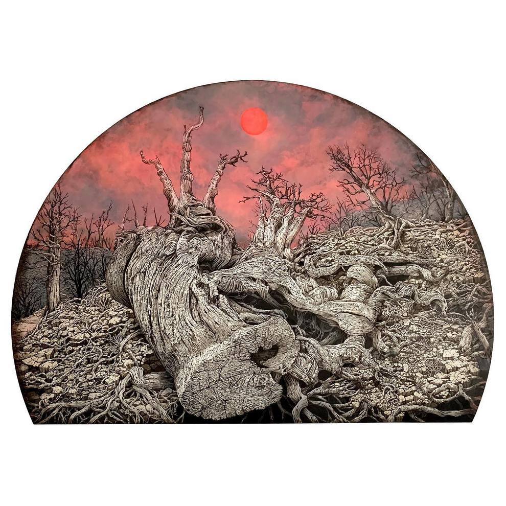 Often working from places she’s lived—from Pennsylvania woods to California canyons—she reconstructs roots, branches and rocks into dense, architectural structures that feel part botanical, part neural map, sometimes embedding hints of endangered species or imagined ruins. Her works appear in galleries and fairs via spaces like Arch Enemy Arts, and as prints, with titles such as “Trillium Rising,” “Radiate,” “Memento,” and “7 Layers Deep” pointing to themes of time, loss, and layered perception.