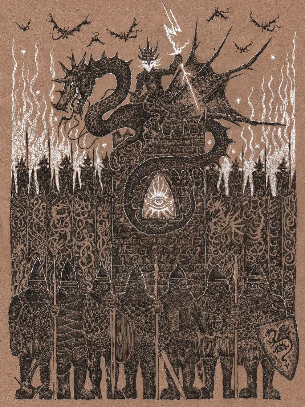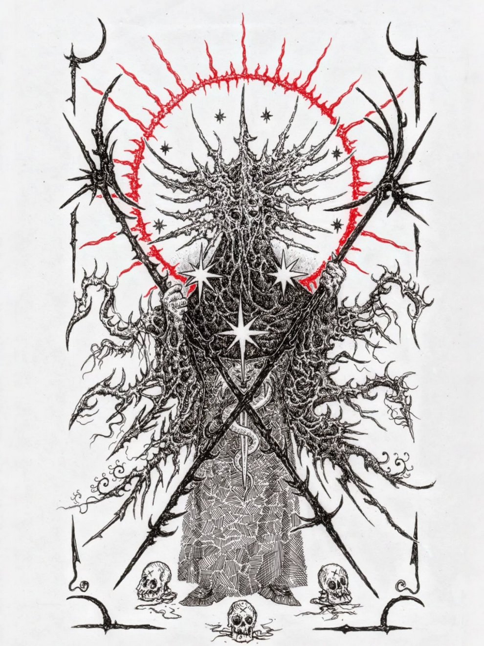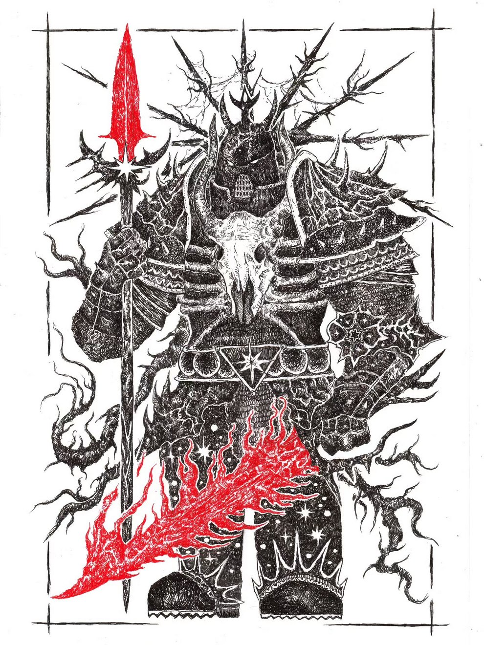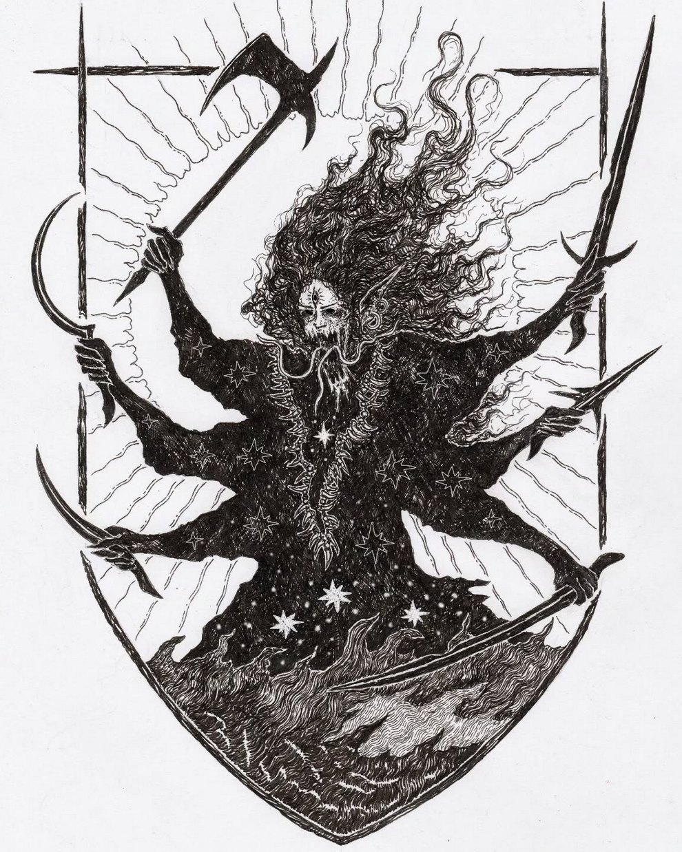 His work focuses on duels, crusaders, gallows, skeletal warriors, tortured saints and occult emblems, rendered in tight fineliner linework with occasional blood‑red accents, and used for band merch, album covers, T‑shirts, restaurant commissions and limited prints. Through recurring series and titles like “Decline and Decay,” “Oppression of the Weak” and “Arrows of Entropy,” he builds a pseudo‑historical world of war, oppression and entropy that appeals to dark‑art communities and metal fans worldwide.
