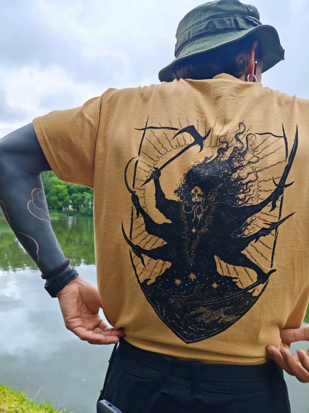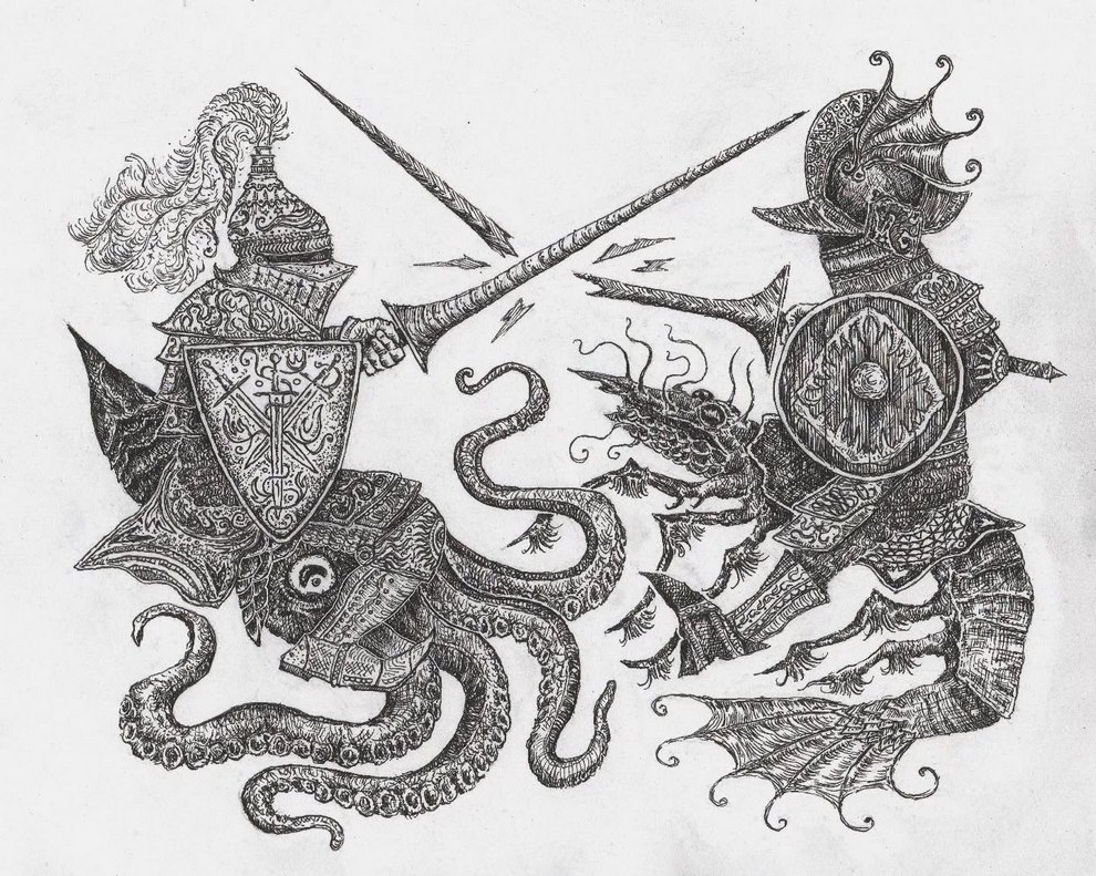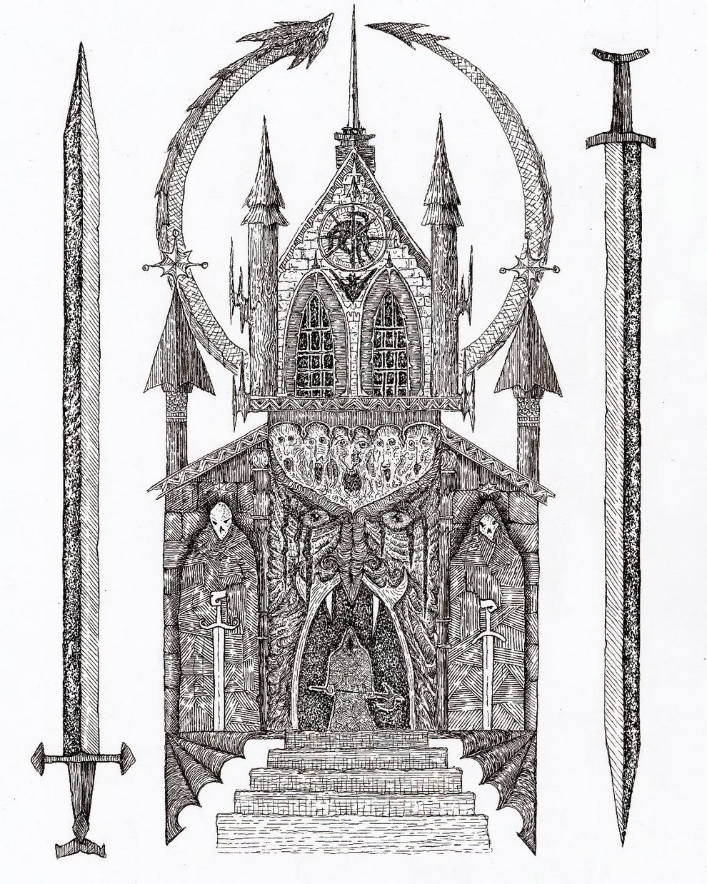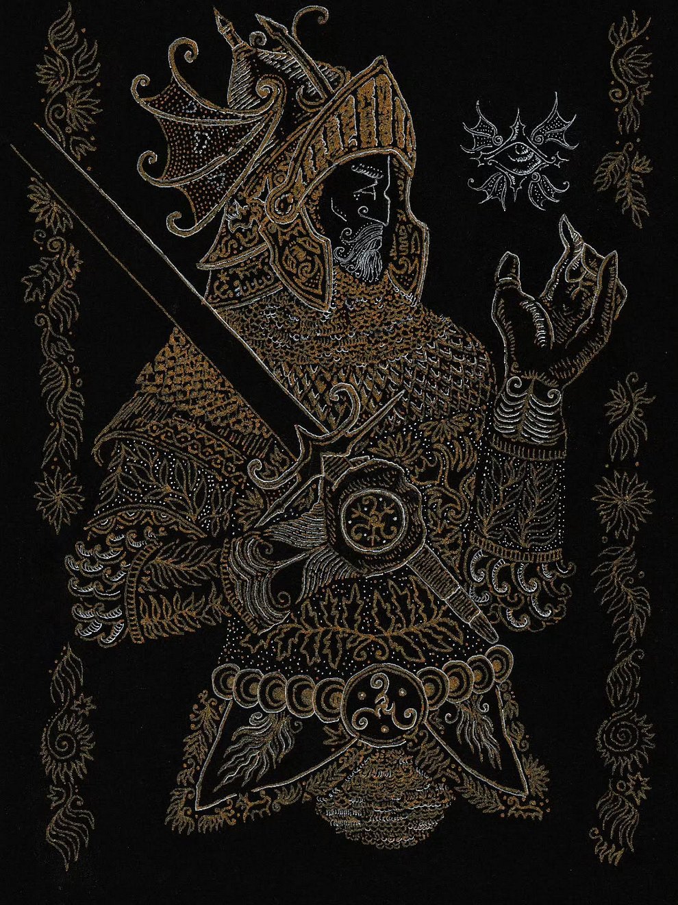 His work focuses on duels, crusaders, gallows, skeletal warriors, tortured saints and occult emblems, rendered in tight fineliner linework with occasional blood‑red accents, and used for band merch, album covers, T‑shirts, restaurant commissions and limited prints. Through recurring series and titles like “Decline and Decay,” “Oppression of the Weak” and “Arrows of Entropy,” he builds a pseudo‑historical world of war, oppression and entropy that appeals to dark‑art communities and metal fans worldwide.