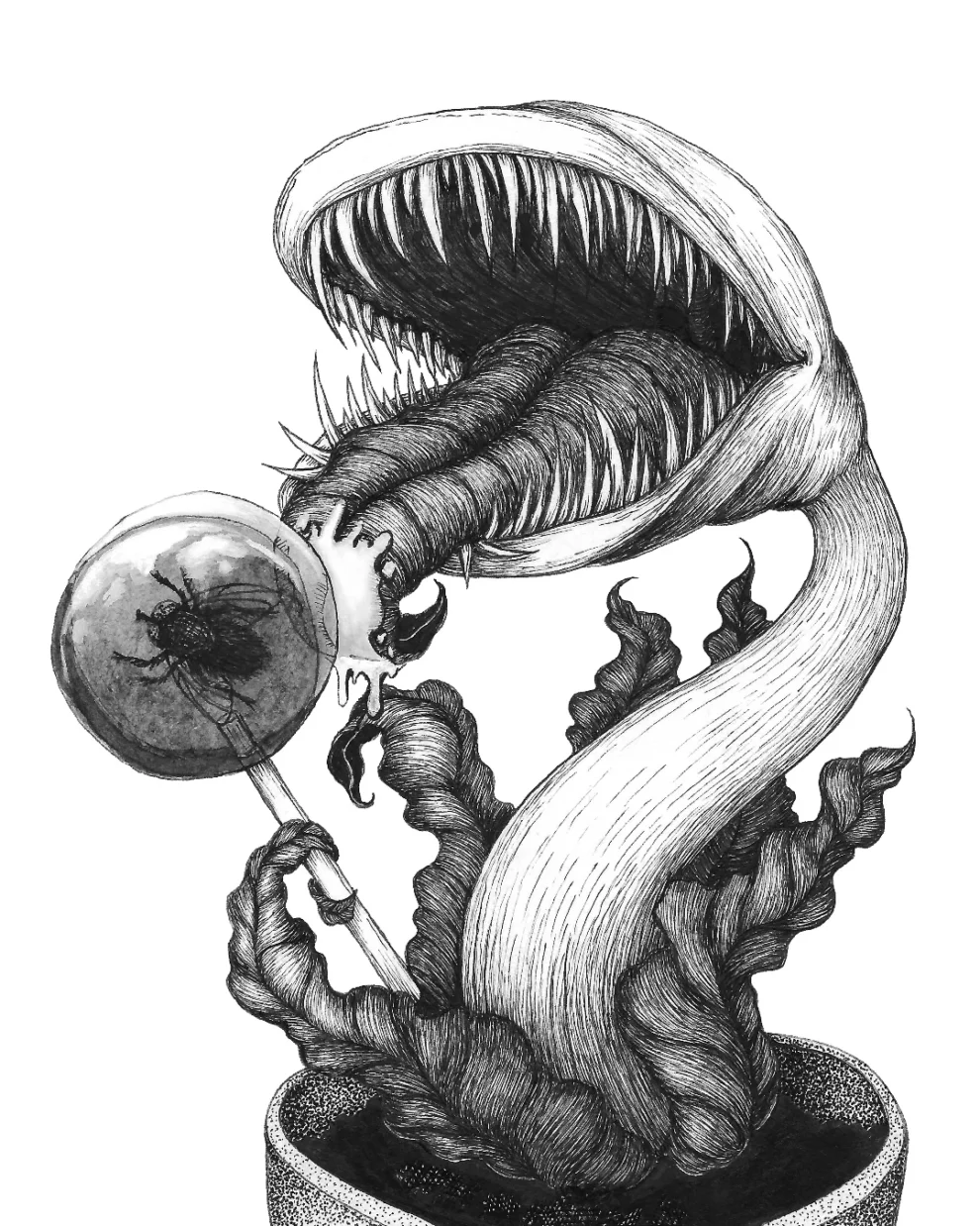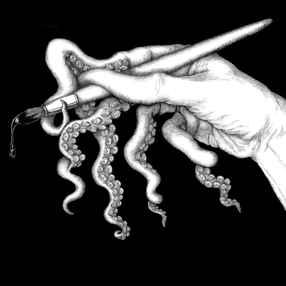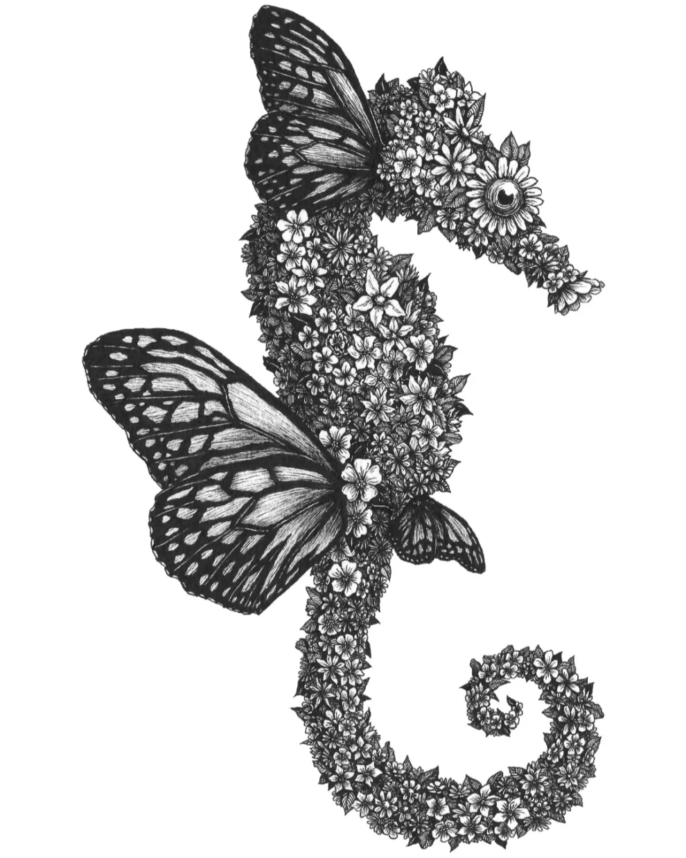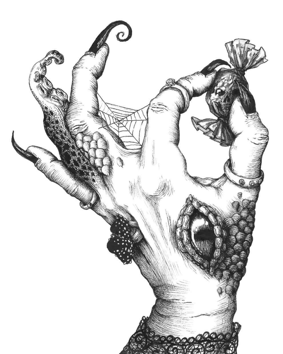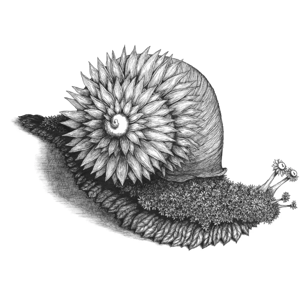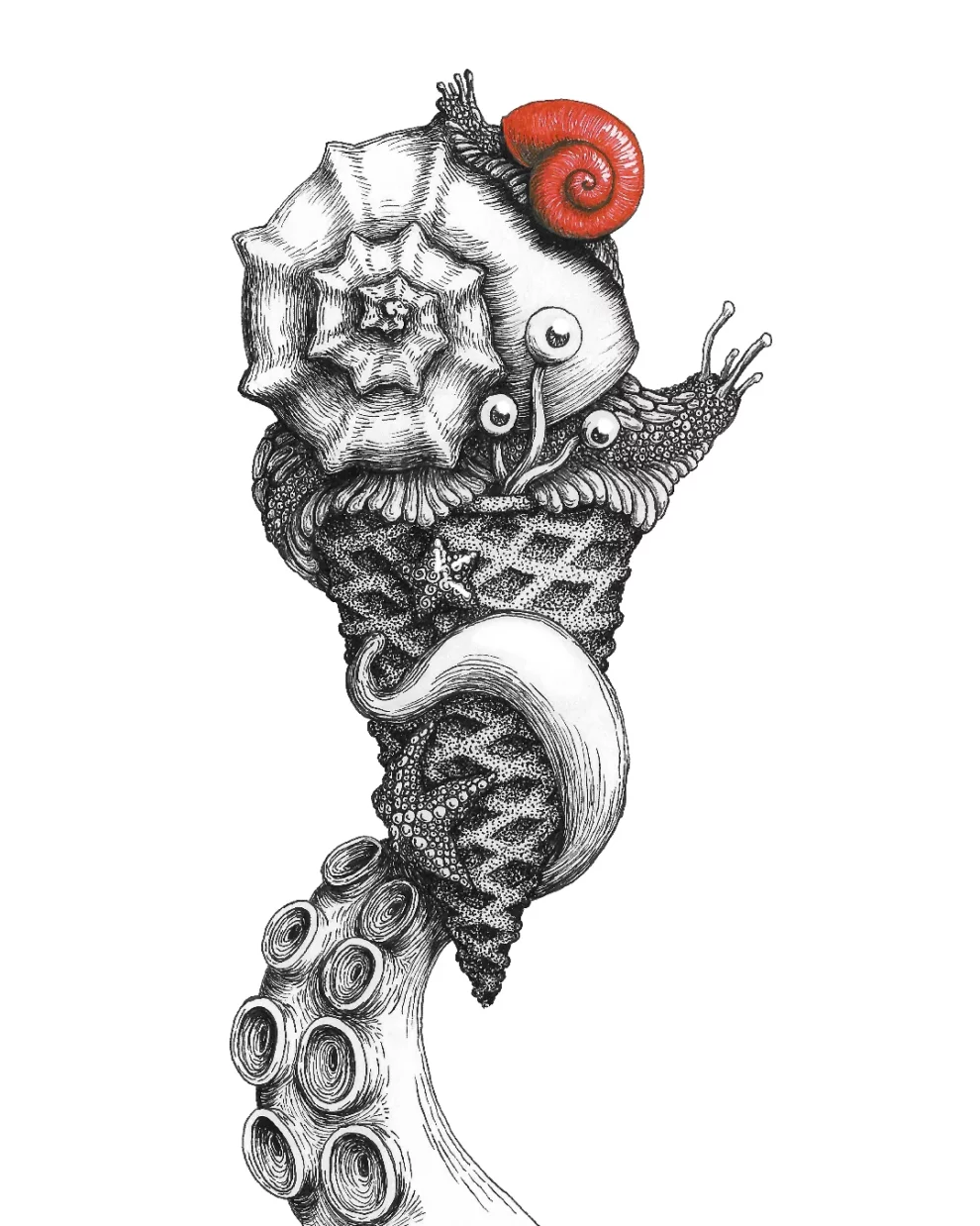 Working mostly in pen and ink (often “ink only”), she creates hypnotic compositions where weird animals, toads, crustaceans and plant forms tangle together, walking the line between horror, humour and obsessive pattern. Her work appears widely in art‑sharing communities and black‑and‑white illustration feeds.