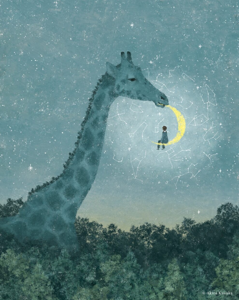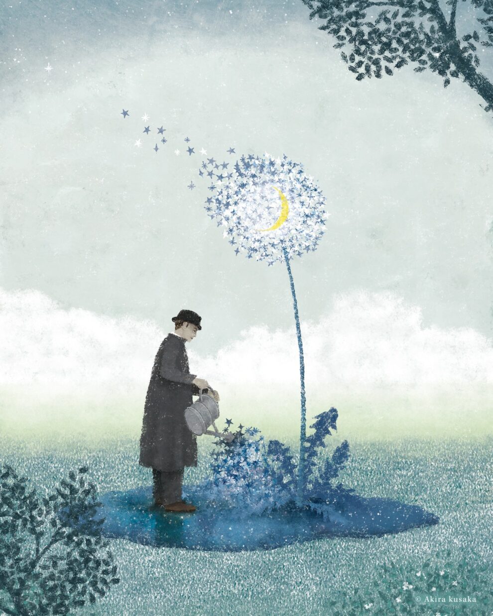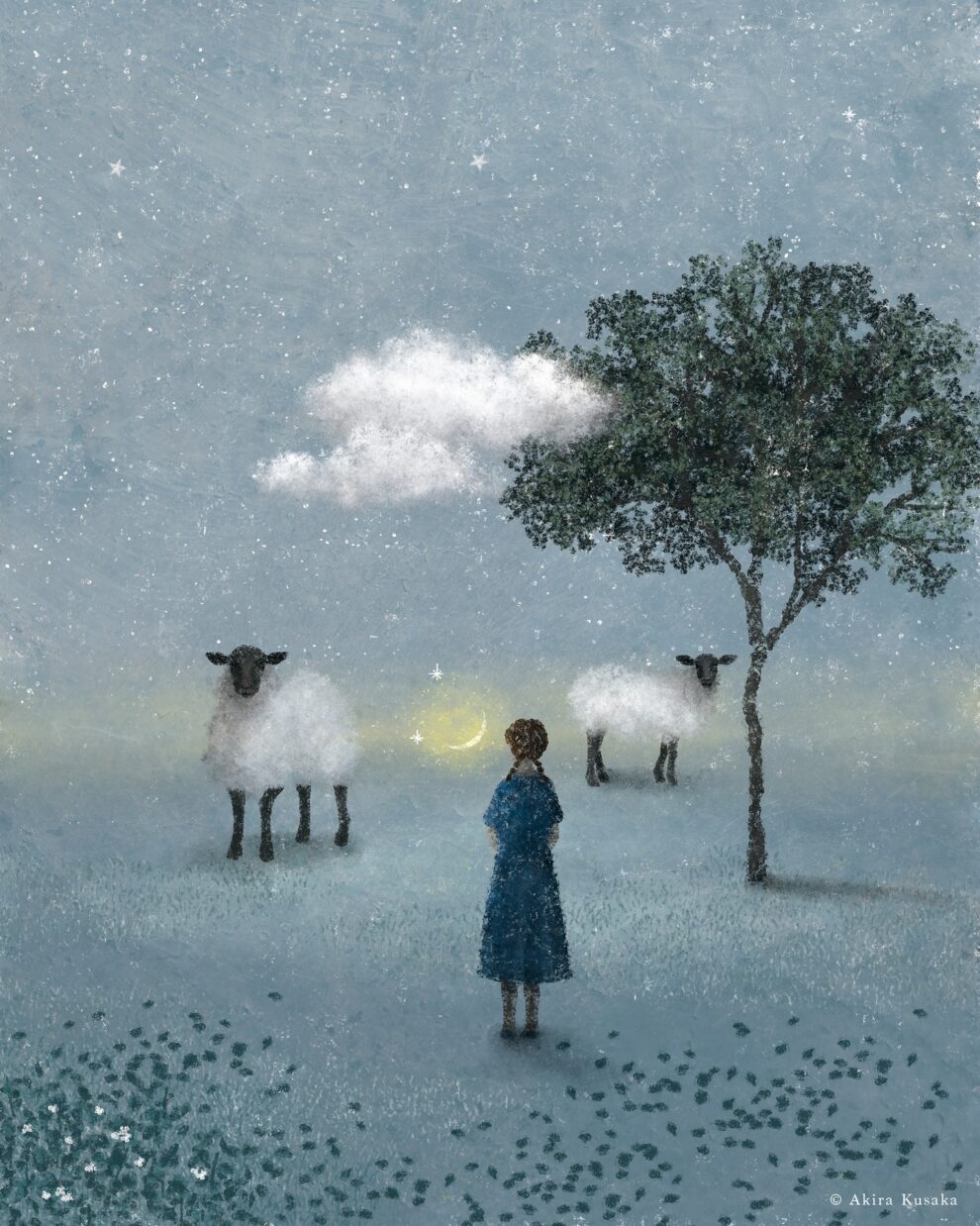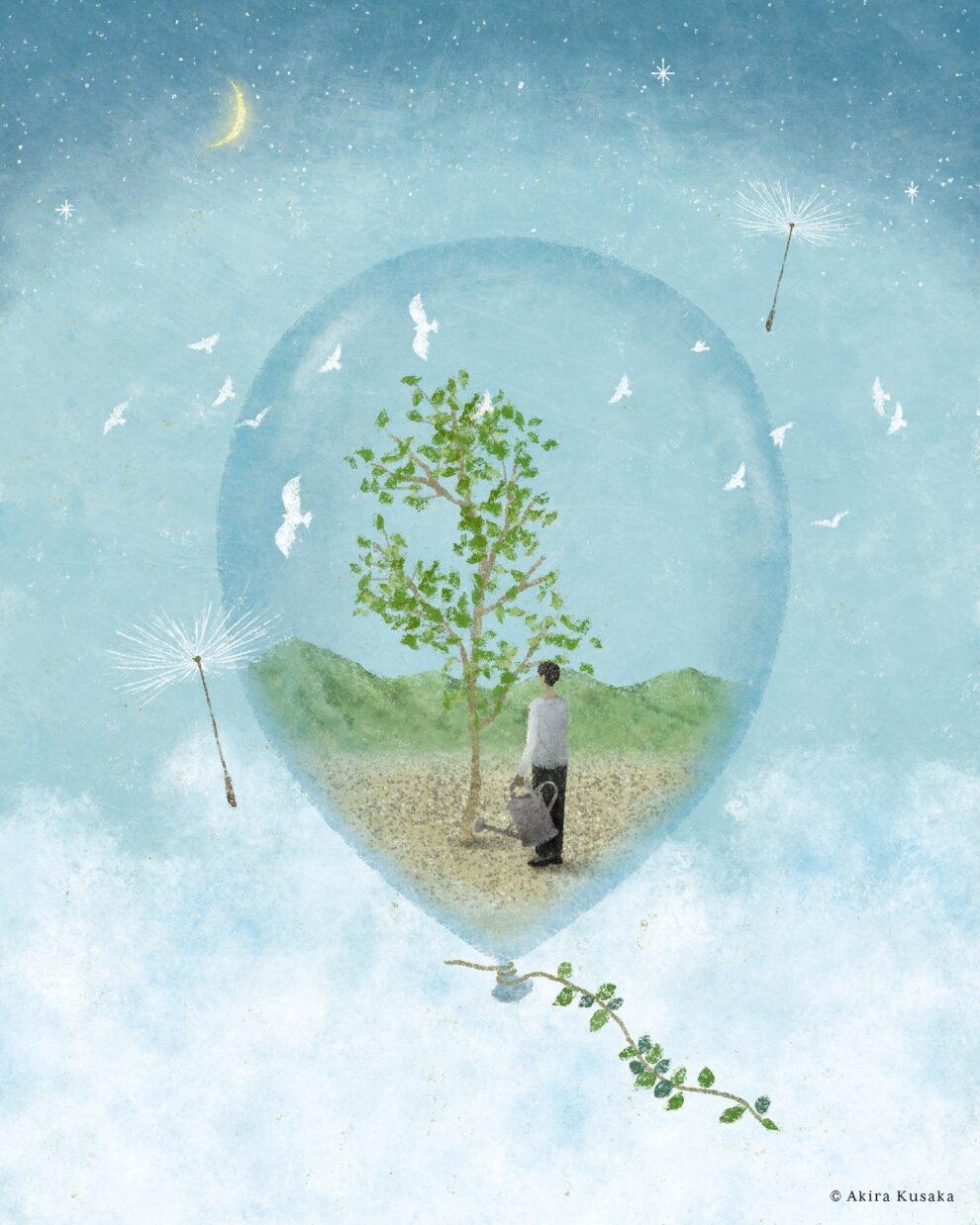 Akira Kusaka (日下 明) is a contemporary Japanese illustrator and graphic designer based in Osaka, known for dreamy, poetic scenes where small human figures, animals and architecture float in vast, quiet spaces.