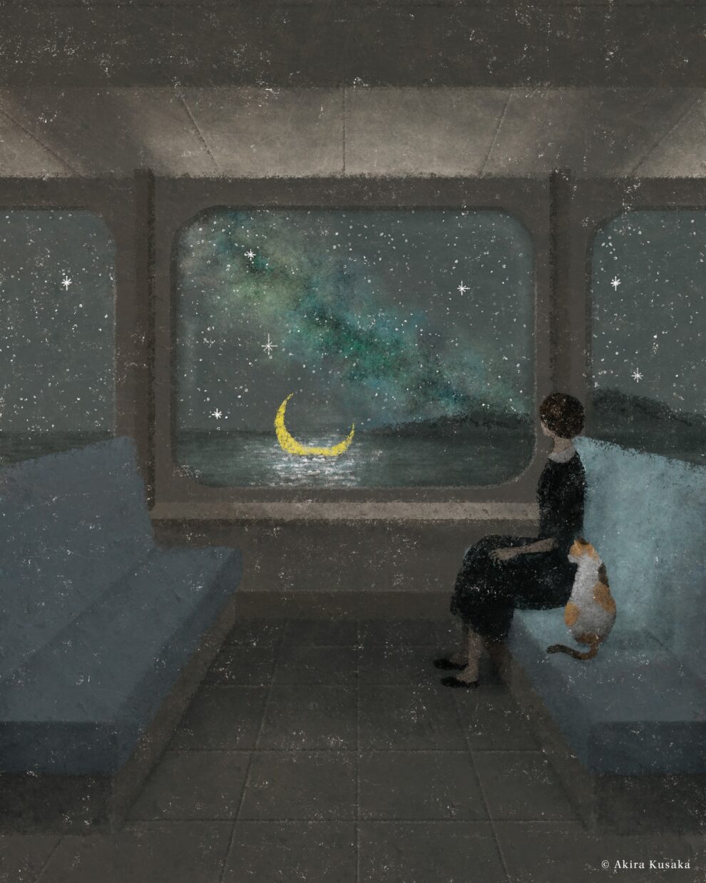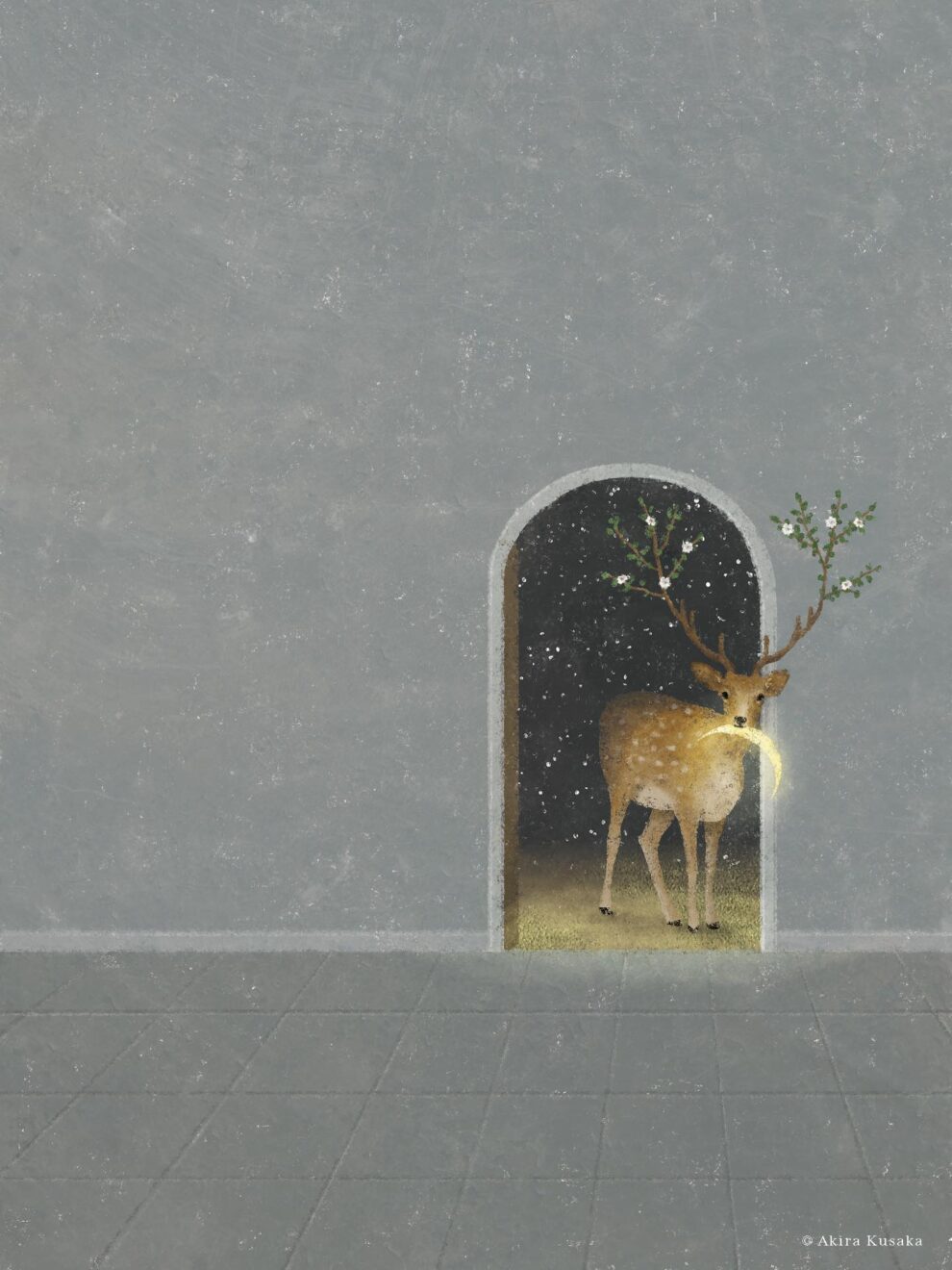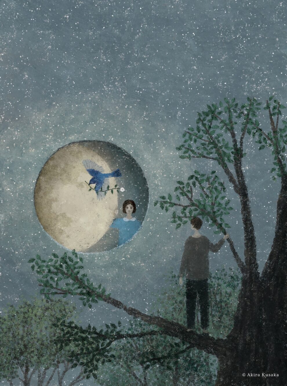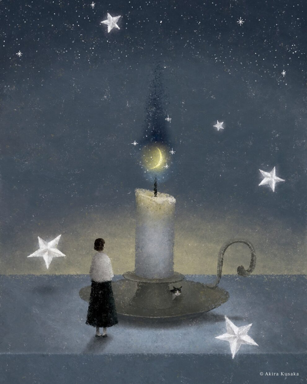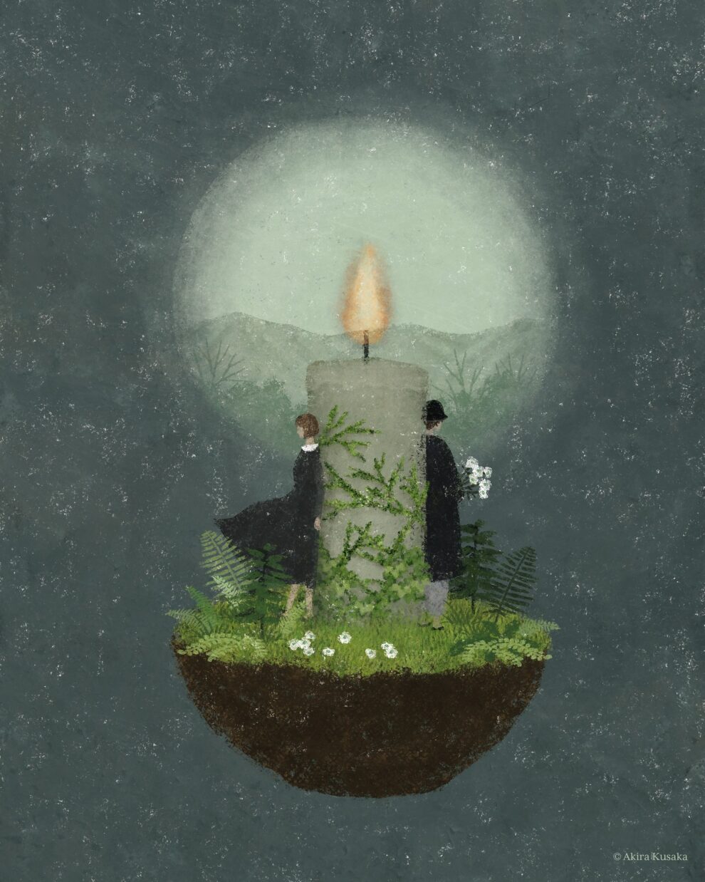 Akira Kusaka (日下 明) is a contemporary Japanese illustrator and graphic designer based in Osaka, known for dreamy, poetic scenes where small human figures, animals and architecture float in vast, quiet spaces.