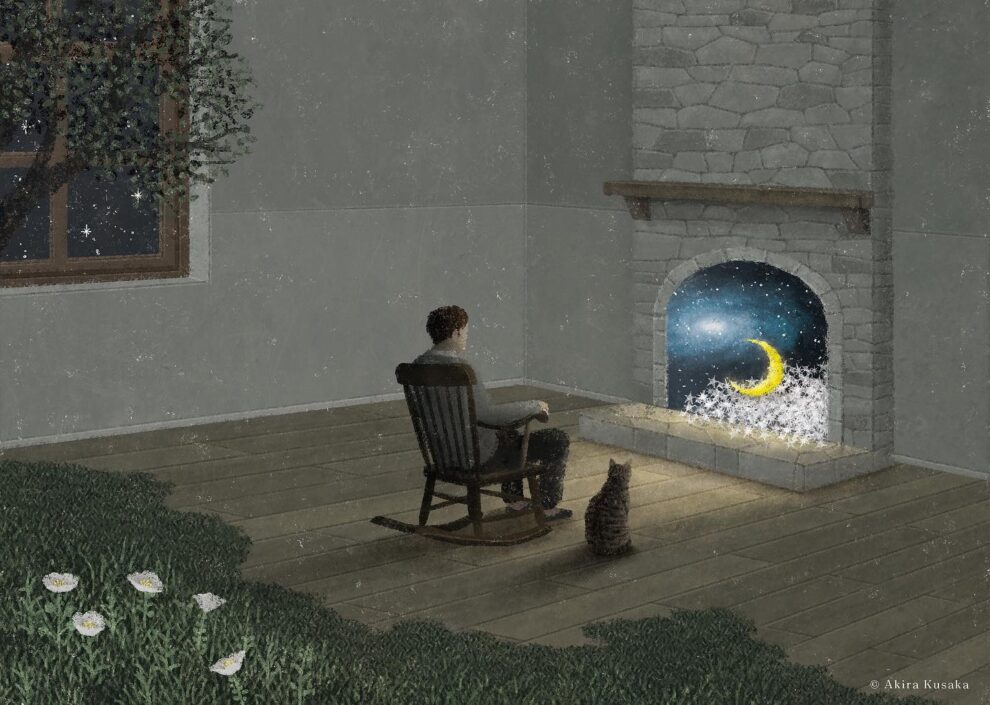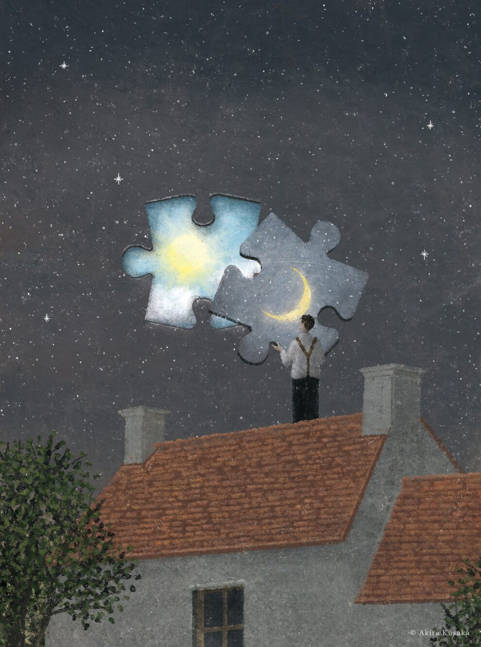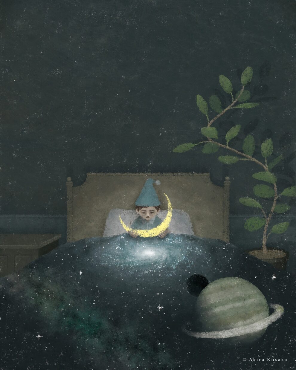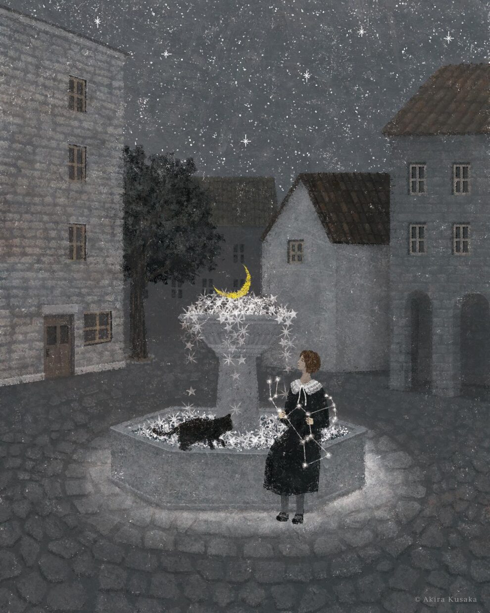 Akira Kusaka (日下 明) is a contemporary Japanese illustrator and graphic designer based in Osaka, known for dreamy, poetic scenes where small human figures, animals and architecture float in vast, quiet spaces.