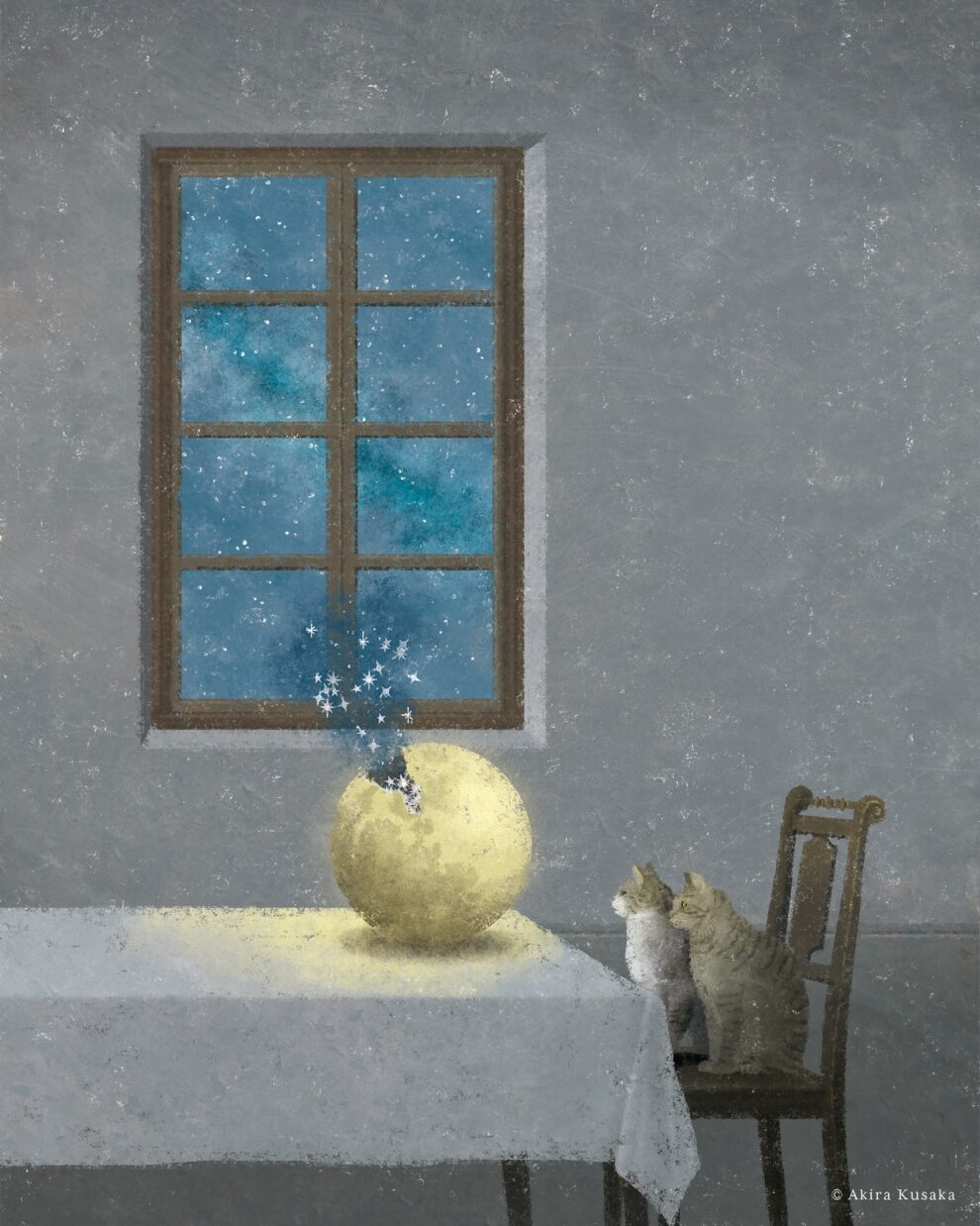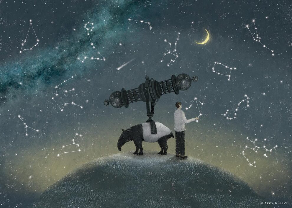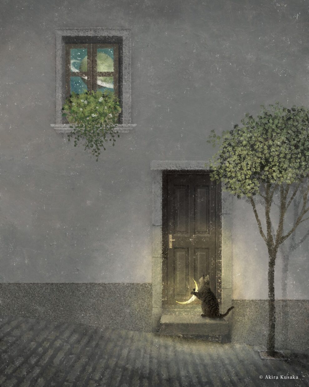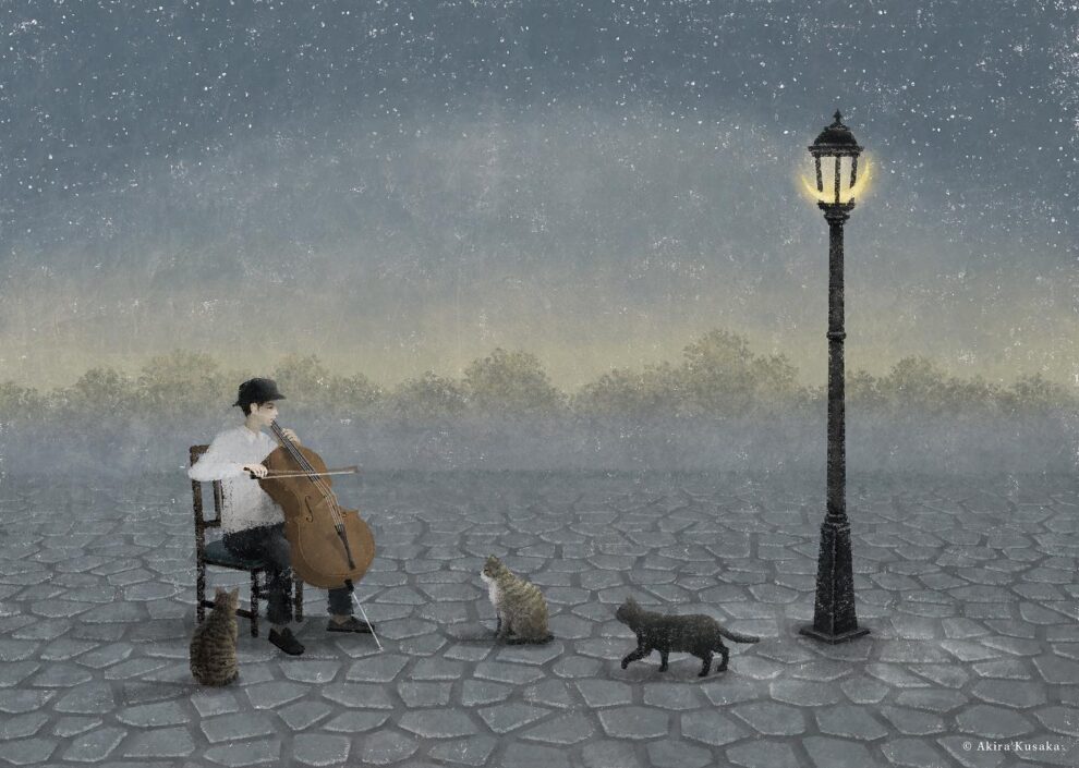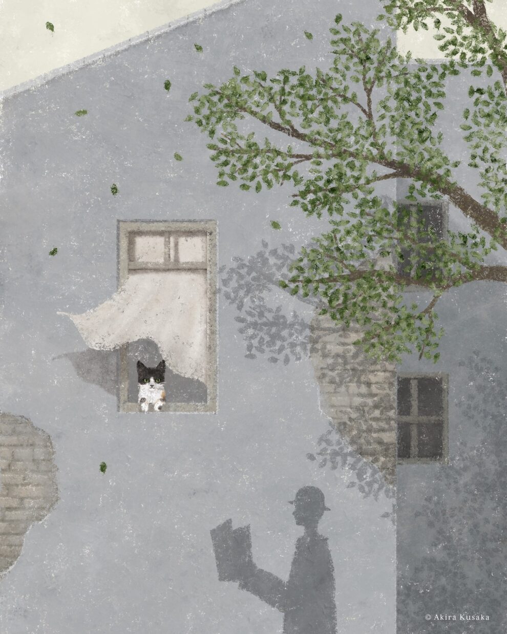 Akira Kusaka (日下 明) is a contemporary Japanese illustrator and graphic designer based in Osaka, known for dreamy, poetic scenes where small human figures, animals and architecture float in vast, quiet spaces.