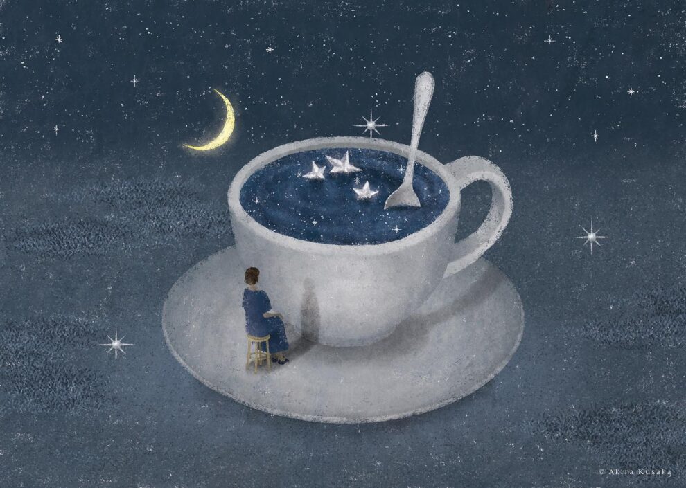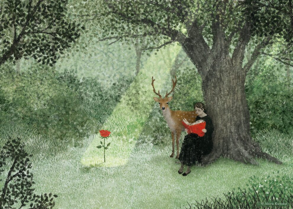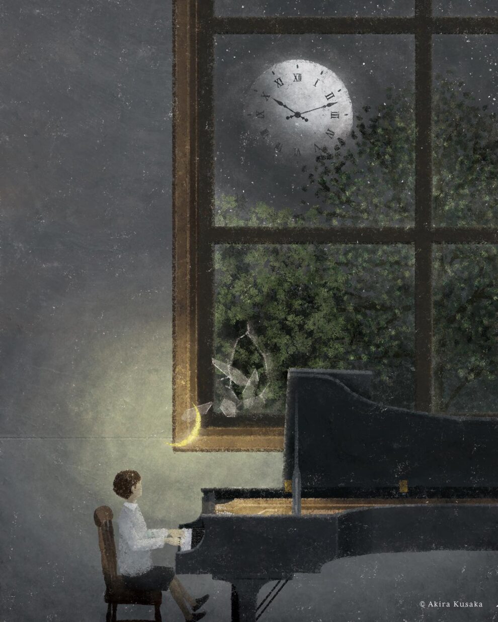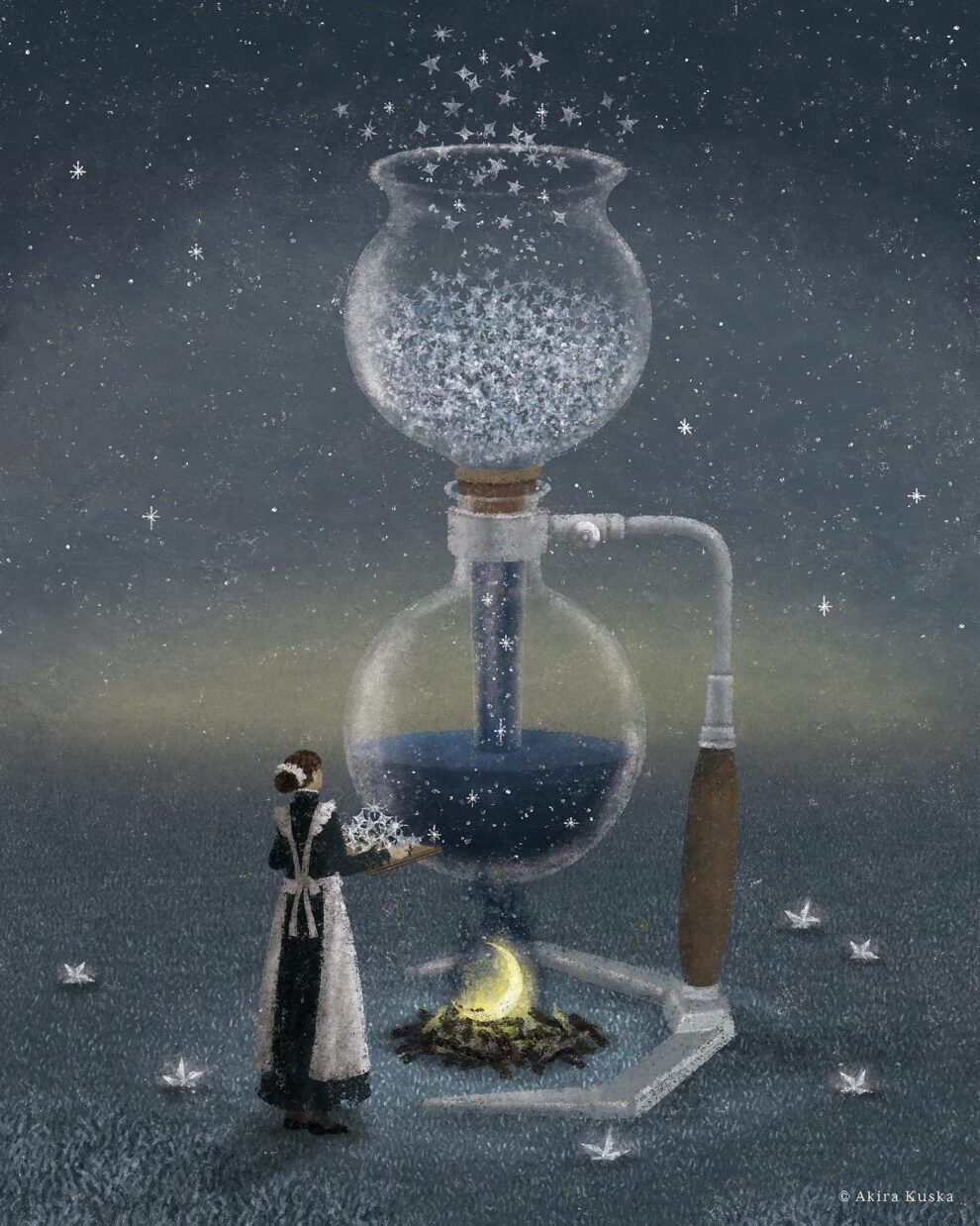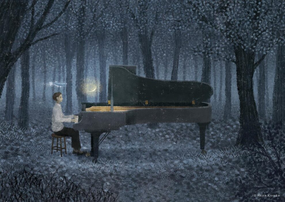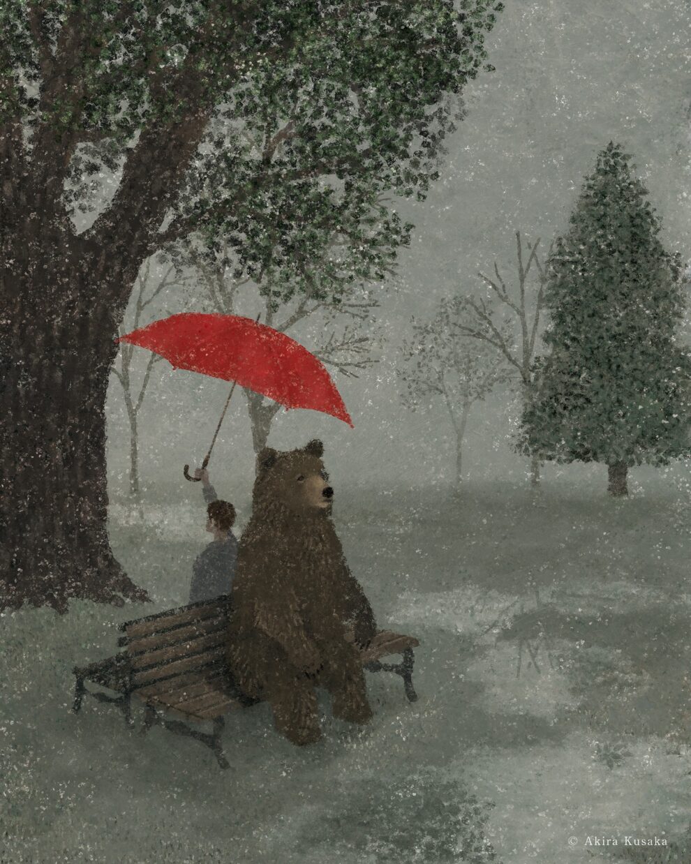 Akira Kusaka (日下 明) is a contemporary Japanese illustrator and graphic designer based in Osaka, known for dreamy, poetic scenes where small human figures, animals and architecture float in vast, quiet spaces.