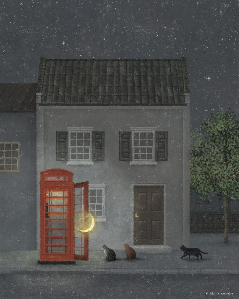Japanese Illustrator Creates Dreamy Digital Landscapes With Tiny Figures, Moons And Houses Suspended In Quiet, Poetic Night Skies
