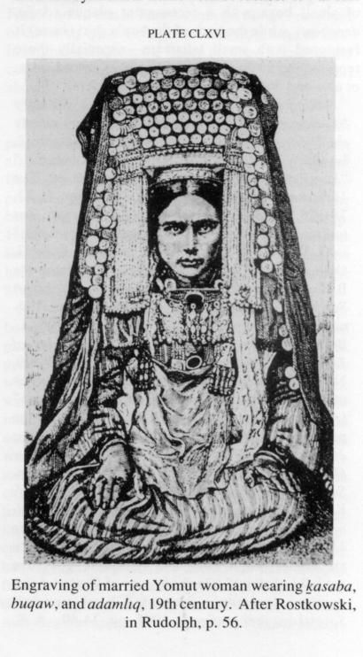 In 1883, Yomut women from Krasnovodsk—today called Türkmenbaşy in Turkmenistan—were photographed wearing the Kasaba, a remarkable cylindrical headpiece. Tall and ornate, the Kasaba immediately stood out with its intricate craftsmanship, serving not only as adornment but as a marker of social standing, wealth, and marital status.