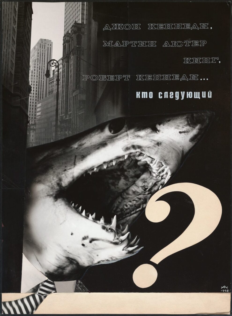 John Kennedy, Martin Luther King, Robert Kennedy … Who will be the next one? A necktie-wearing shark is shown beneath the title, 1968