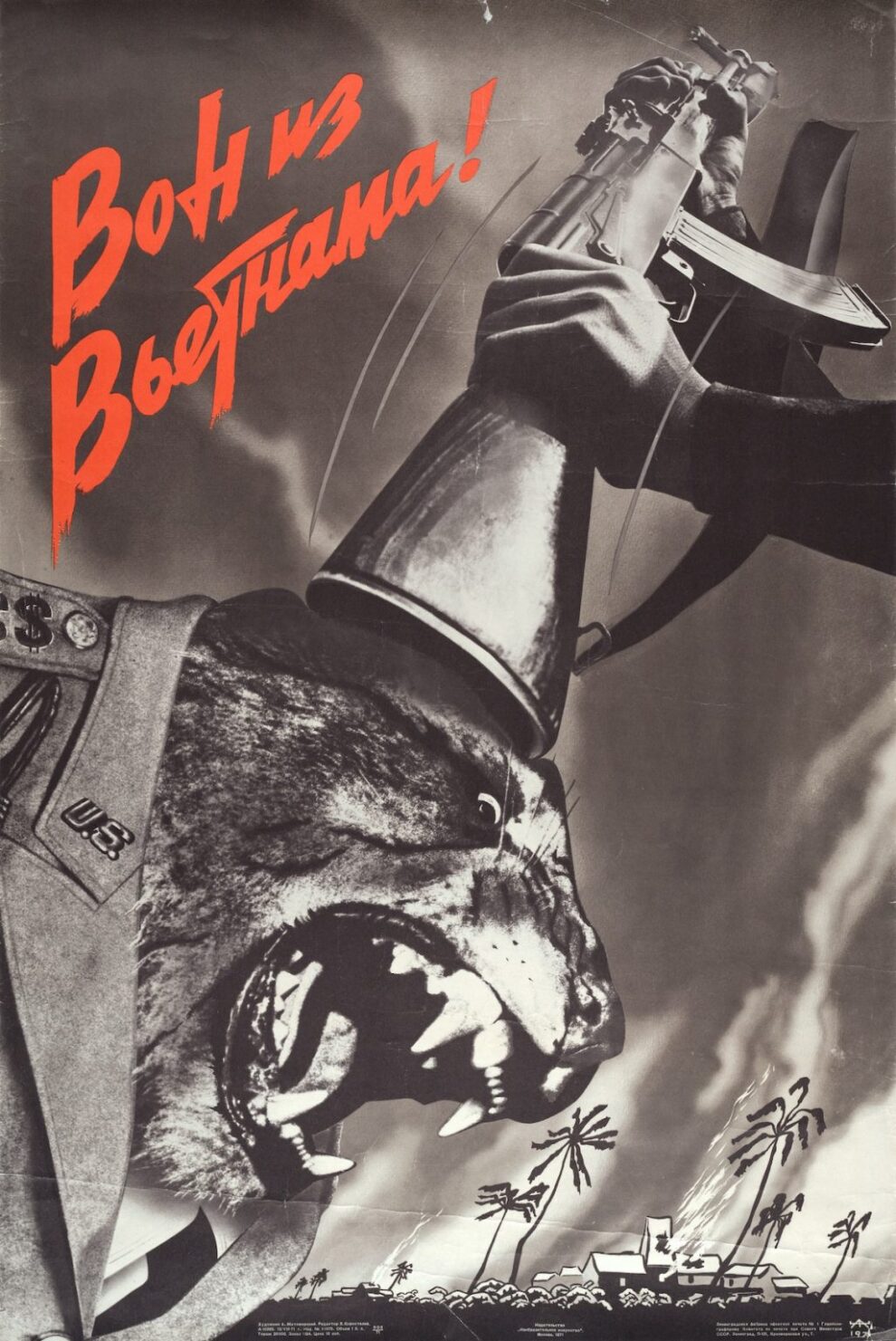 Get him out of Vietnam! The United States, pictured as a vicious animal, is being struck on the head by a rifle butt, 1971