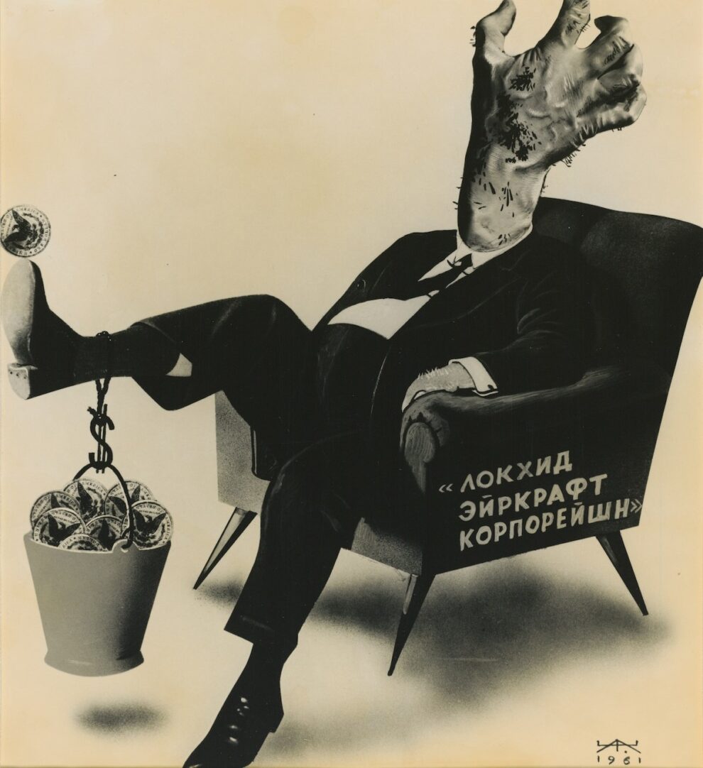 Lockheed Aircraft Corporation is pictured as a businessman with a grasping hand instead of a head and a foot holding up a bucket full of money – 1961