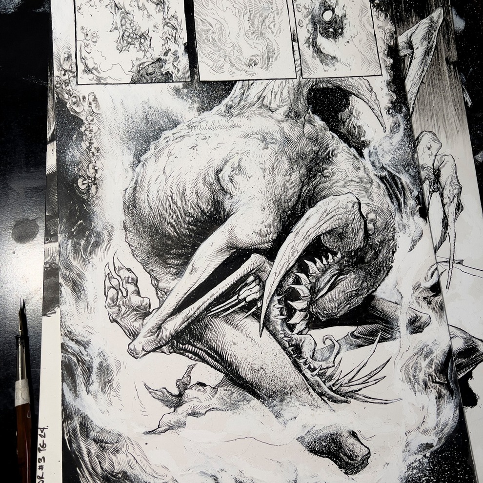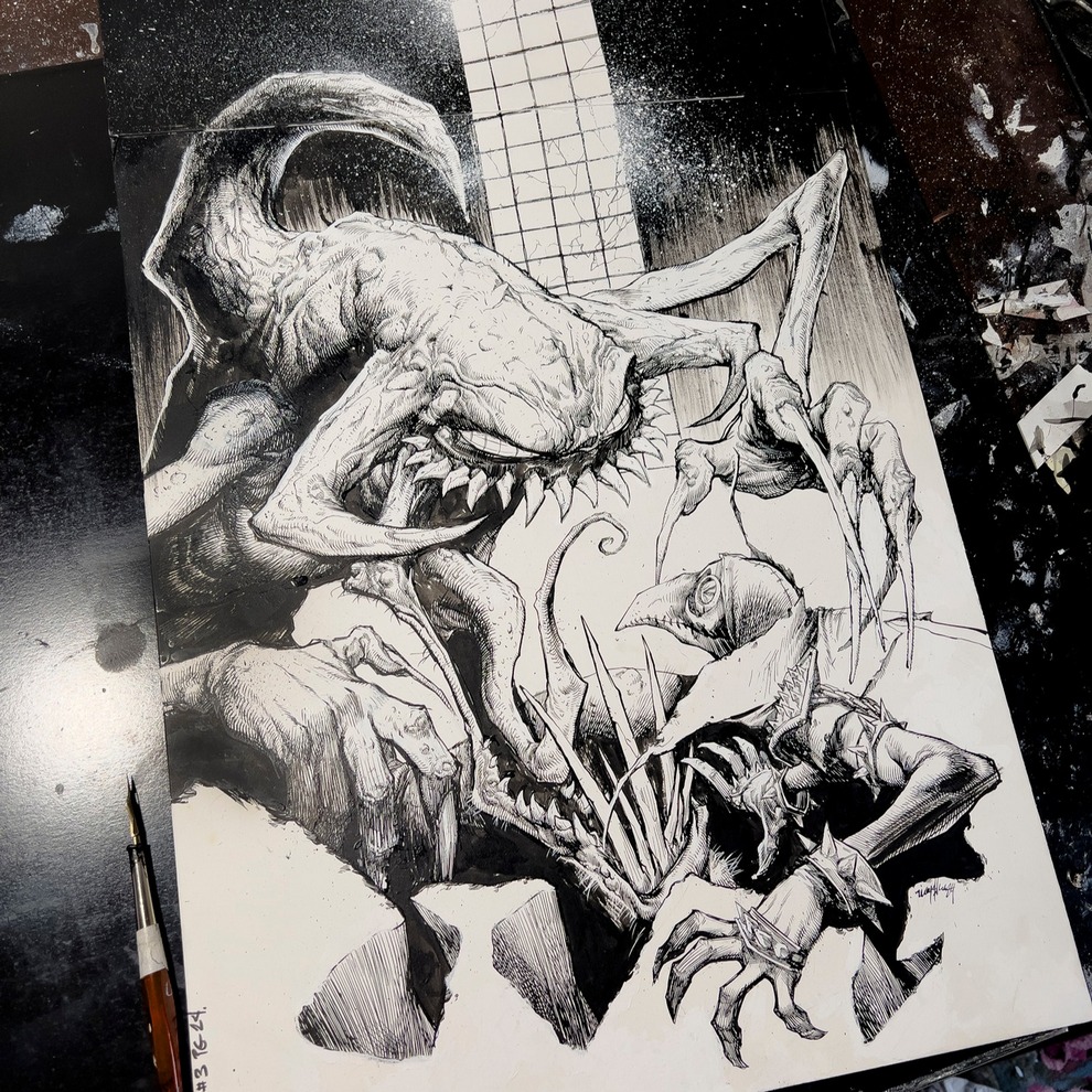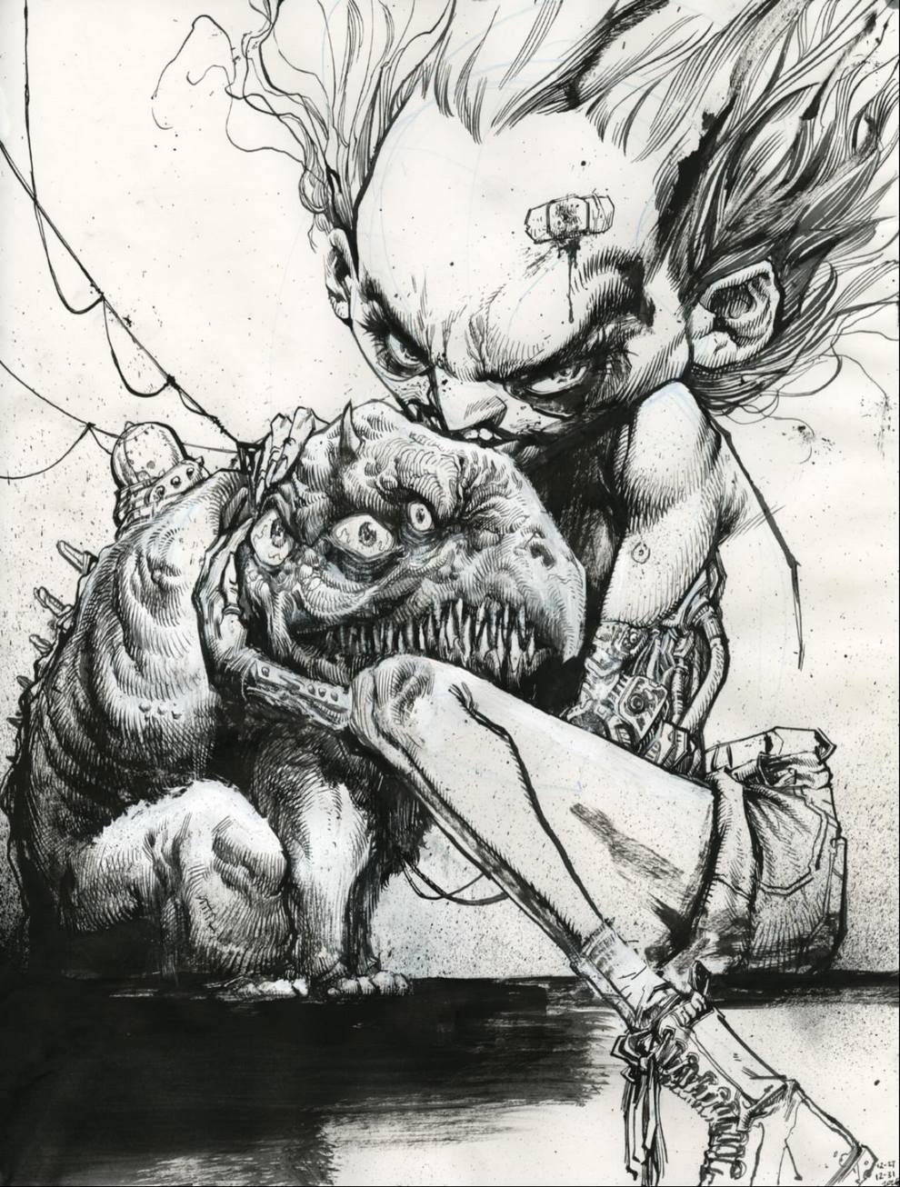 He regularly posts sketchbook pages, livestream doodles and commissions—ranging from Hulk, Weapon X and other Marvel characters to xenomorphs and monster designs—often described as “sketches with attitude” that show his improvisational, mark‑making‑driven process. His work appears in projects like Heavy Metal and creator‑owned comics such as “Cul‑De‑Sac,” for which artists like Jim Mahfood have drawn variant covers, reinforcing his place within the alternative, neo‑psychedelic comics scene.