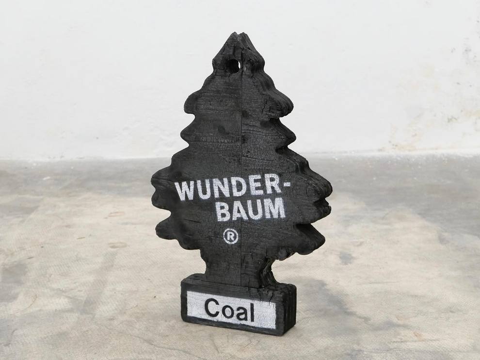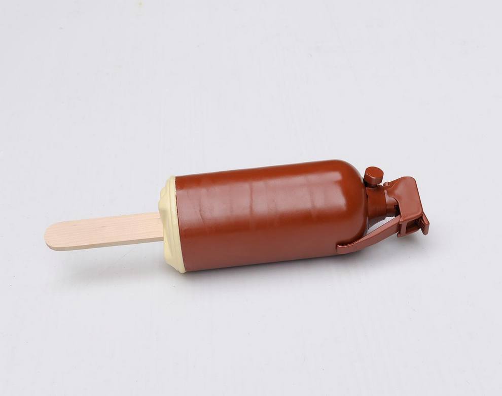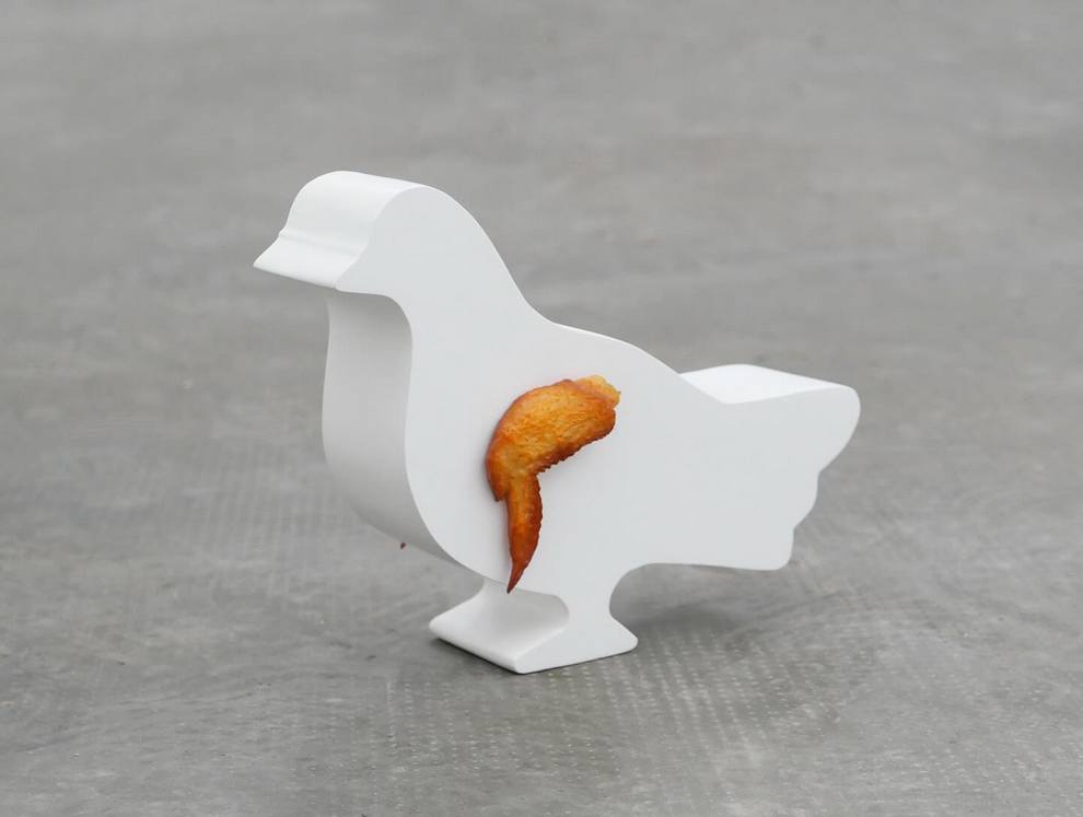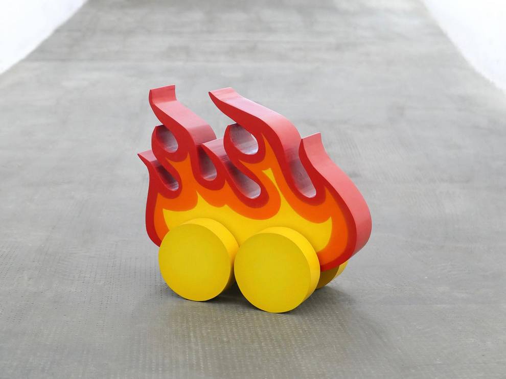 Delfino Fidel sculpts witty everyday symbols into playful objects with sharp commentary using carved wood, acrylic paint, polymer clay, steel springs blending pop culture, emojis, toys, branded items into surreal hybrids.