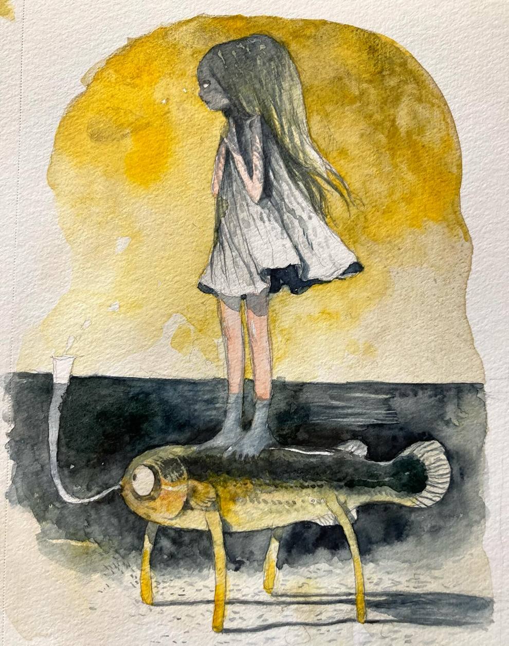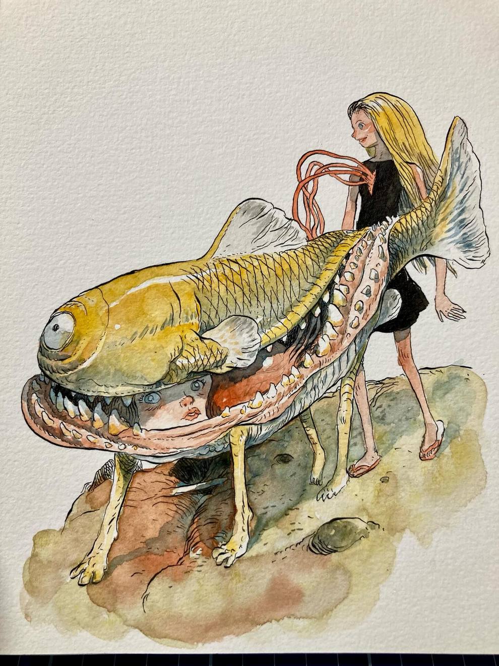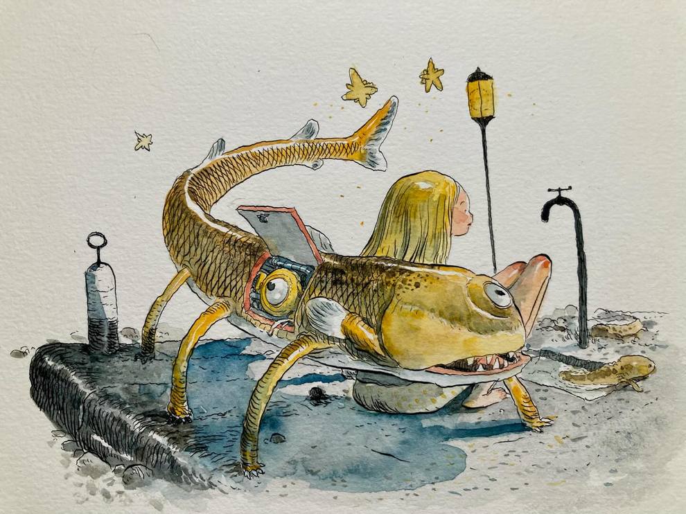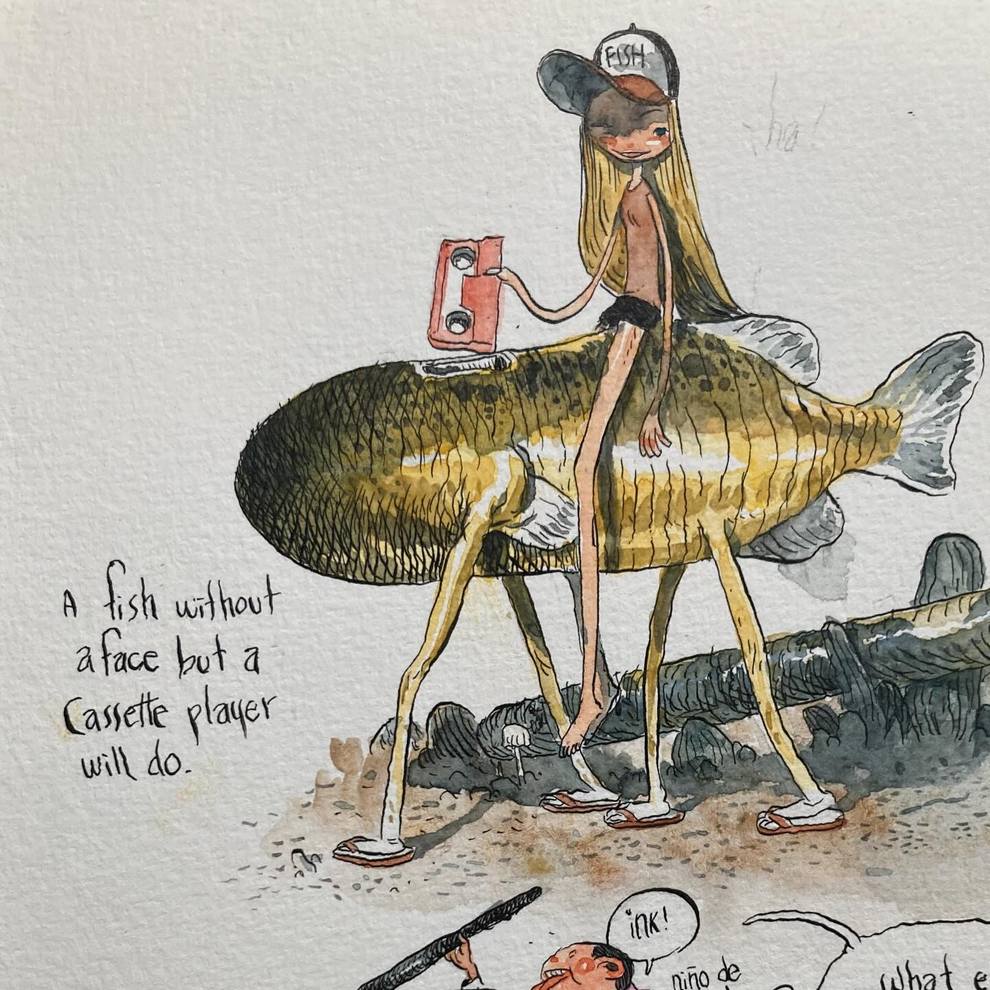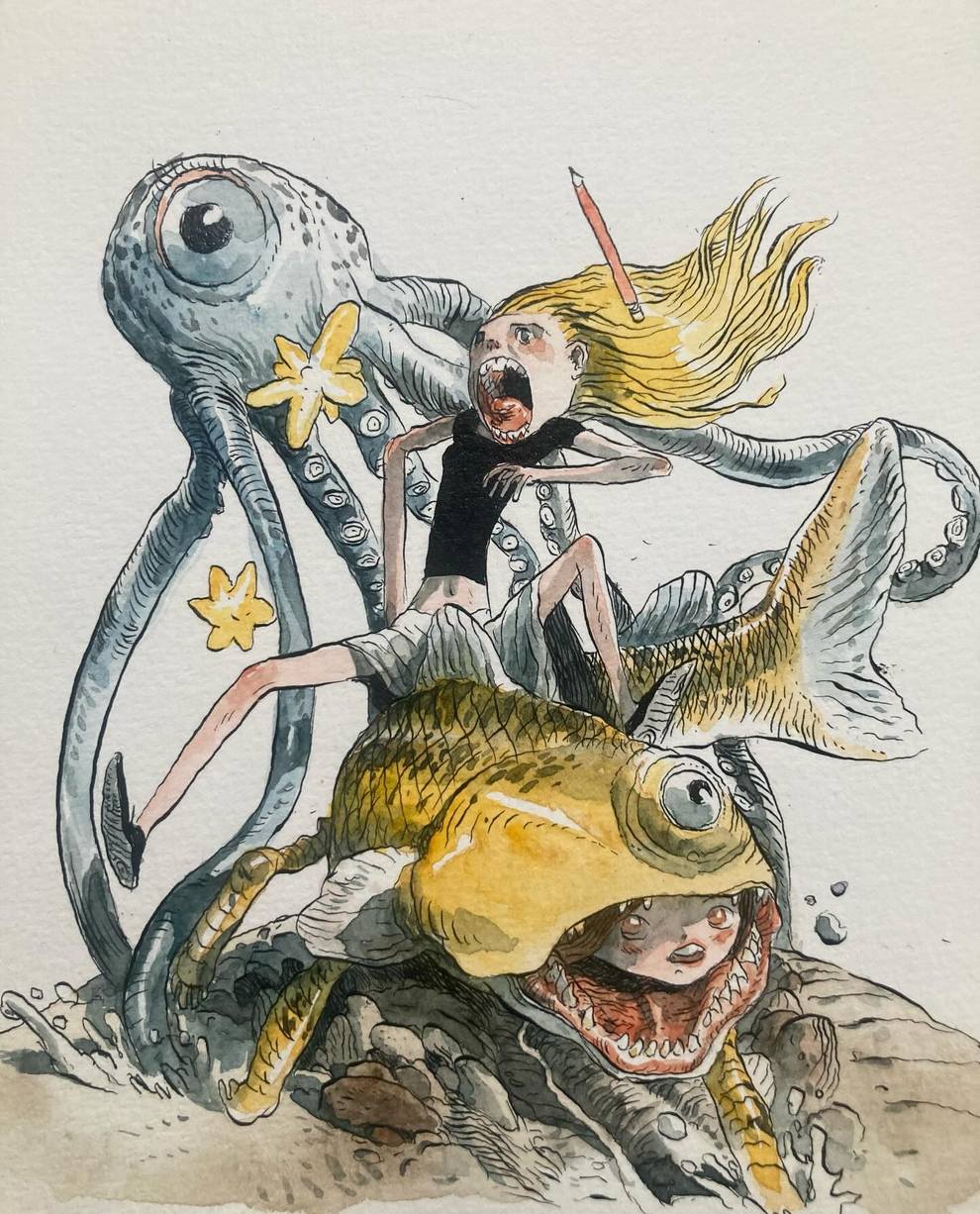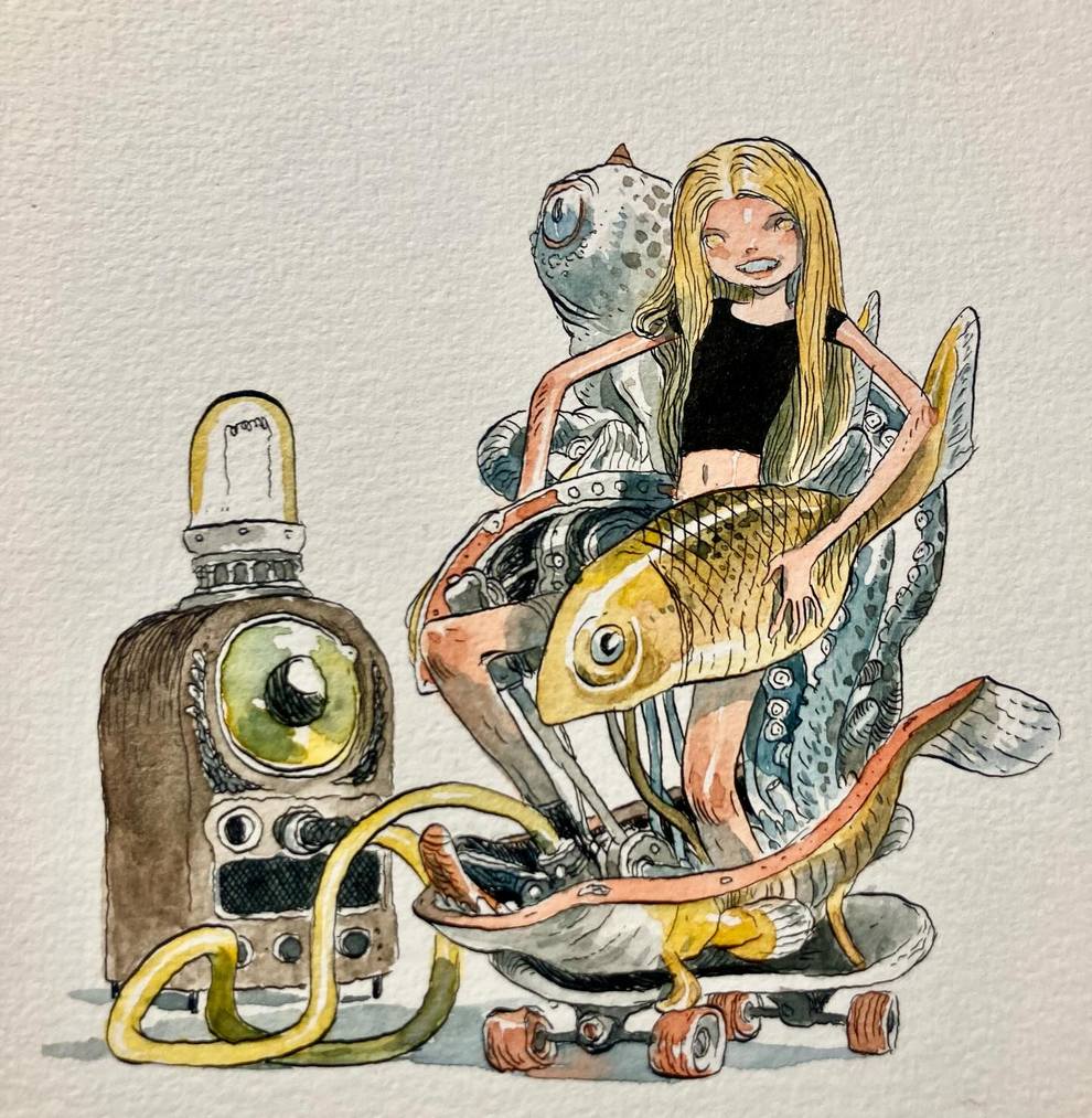 Alongside his well‑known graphic novels, he keeps releasing self‑published fanzines under the “Rain of Doom” name and fills sketchbooks with quick pencil and ink drawings, then revisits those ideas in finished watercolour and acrylic pieces like his ongoing “yellow fish” and “weird animals” series. His Instagram mixes loose sketches, process videos and finished illustrations, often tagged #fishrider and shared by art communities like SuperAni, positioning him as a cult favourite in contemporary dark‑fantasy comics and illustration.
