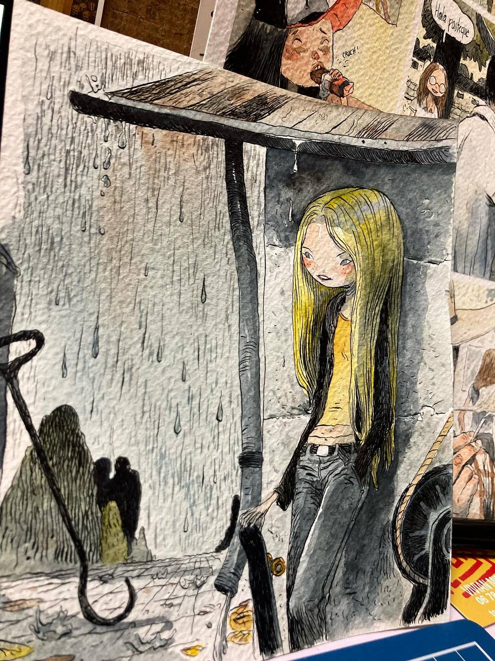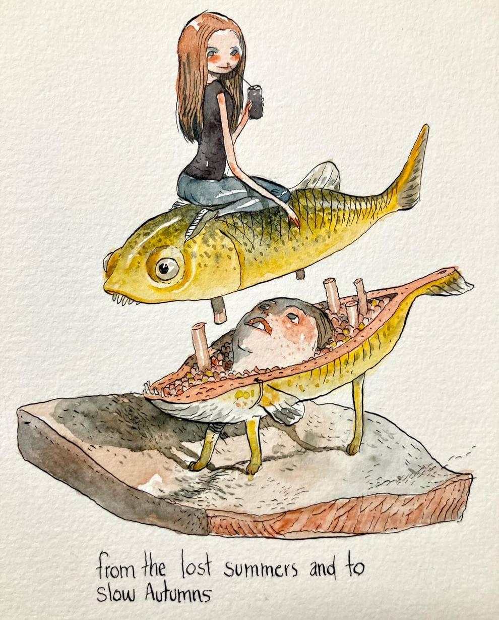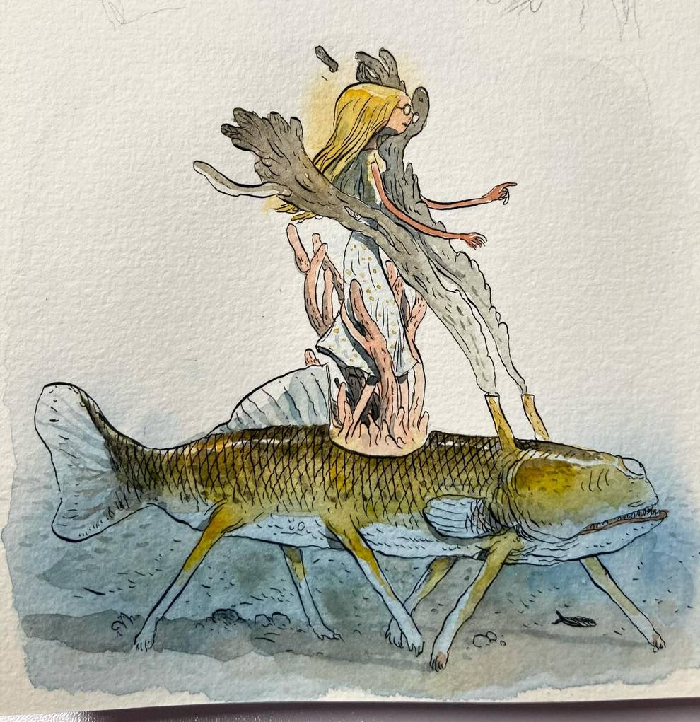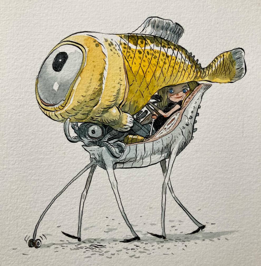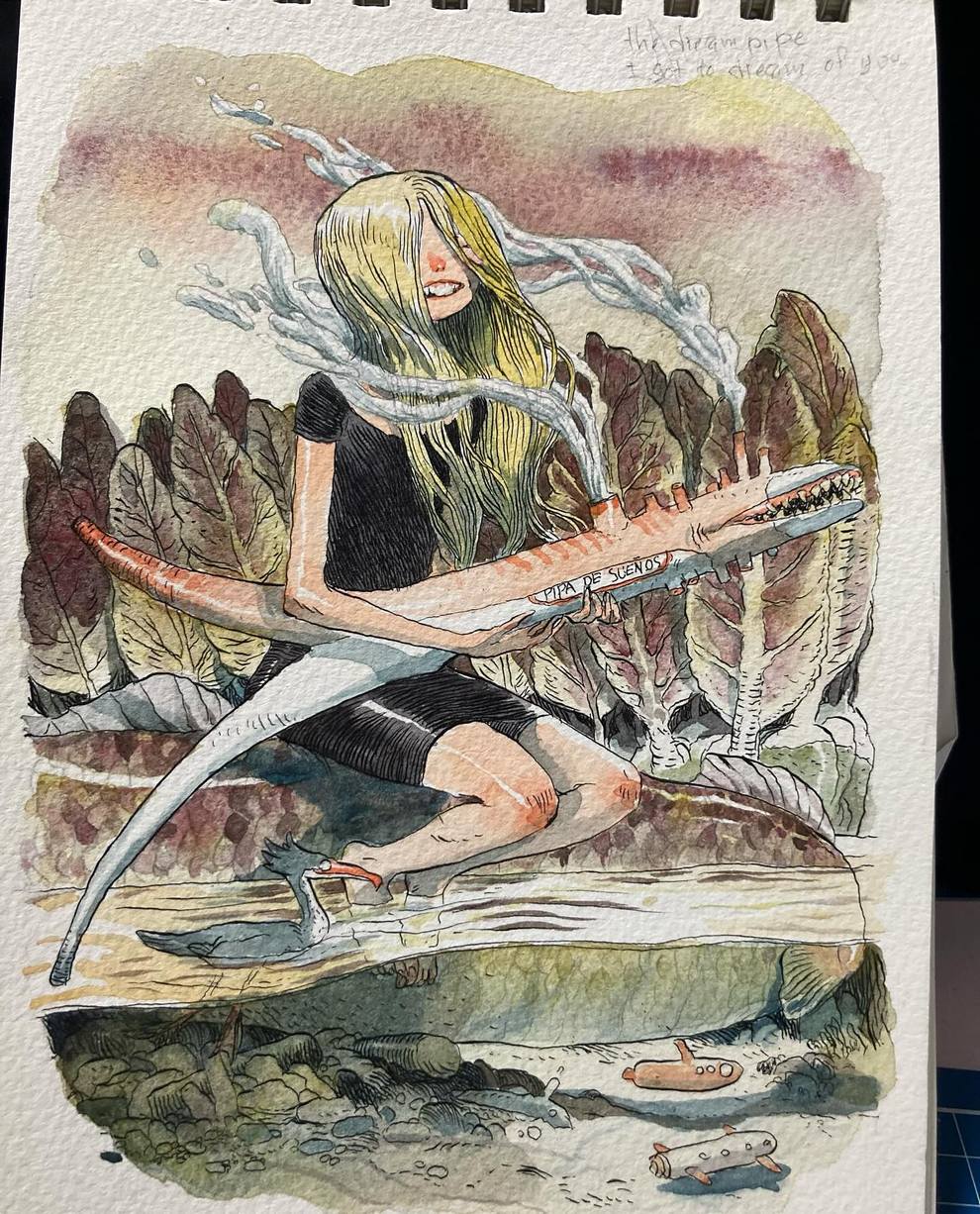 Alongside his well‑known graphic novels, he keeps releasing self‑published fanzines under the “Rain of Doom” name and fills sketchbooks with quick pencil and ink drawings, then revisits those ideas in finished watercolour and acrylic pieces like his ongoing “yellow fish” and “weird animals” series. His Instagram mixes loose sketches, process videos and finished illustrations, often tagged #fishrider and shared by art communities like SuperAni, positioning him as a cult favourite in contemporary dark‑fantasy comics and illustration.