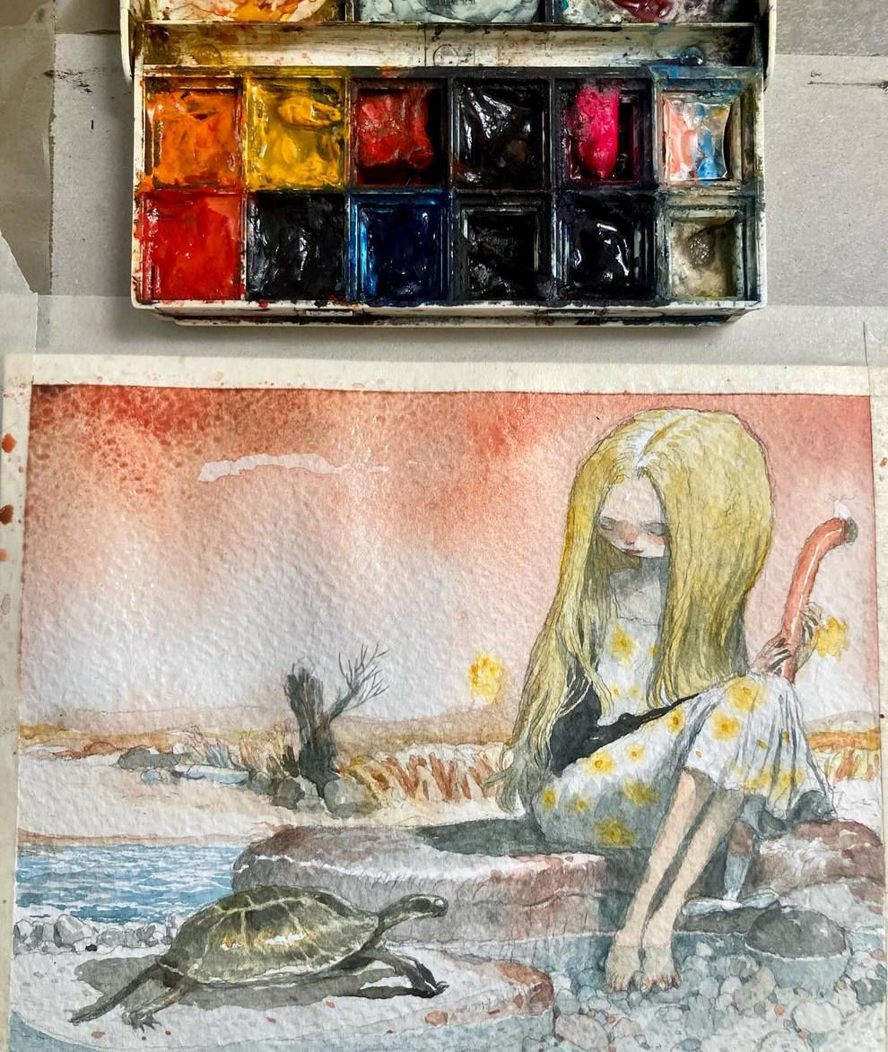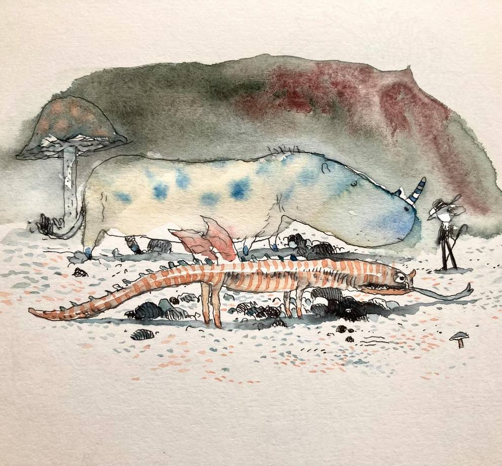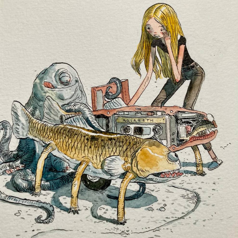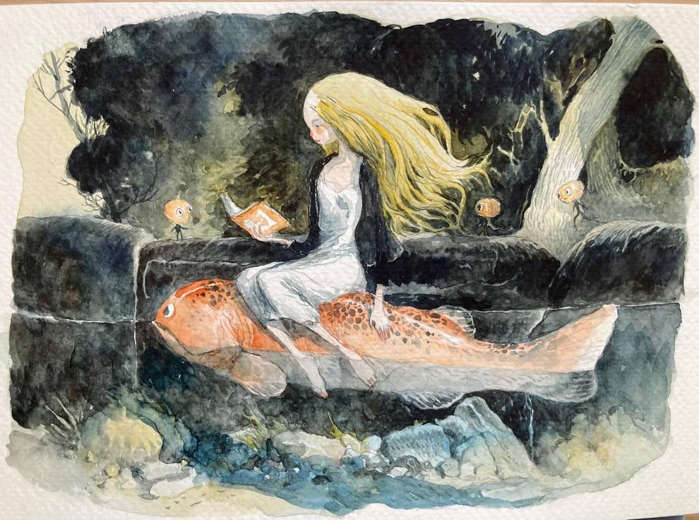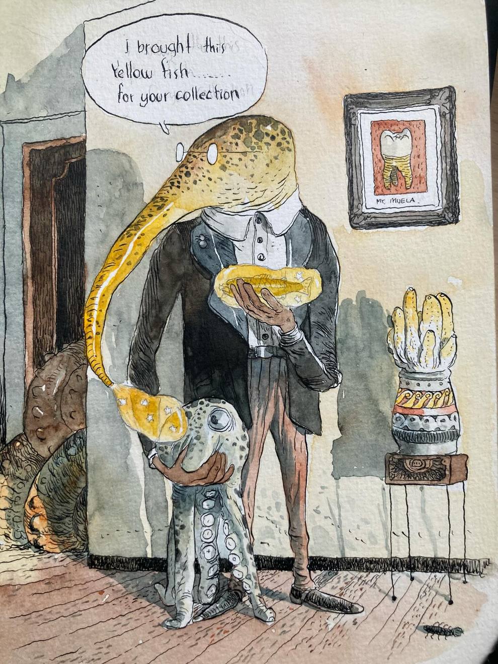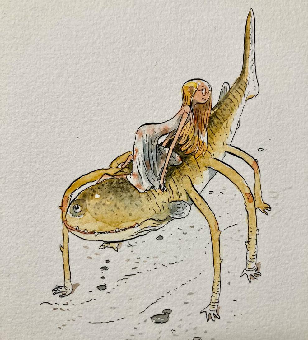 Alongside his well‑known graphic novels, he keeps releasing self‑published fanzines under the “Rain of Doom” name and fills sketchbooks with quick pencil and ink drawings, then revisits those ideas in finished watercolour and acrylic pieces like his ongoing “yellow fish” and “weird animals” series. His Instagram mixes loose sketches, process videos and finished illustrations, often tagged #fishrider and shared by art communities like SuperAni, positioning him as a cult favourite in contemporary dark‑fantasy comics and illustration.