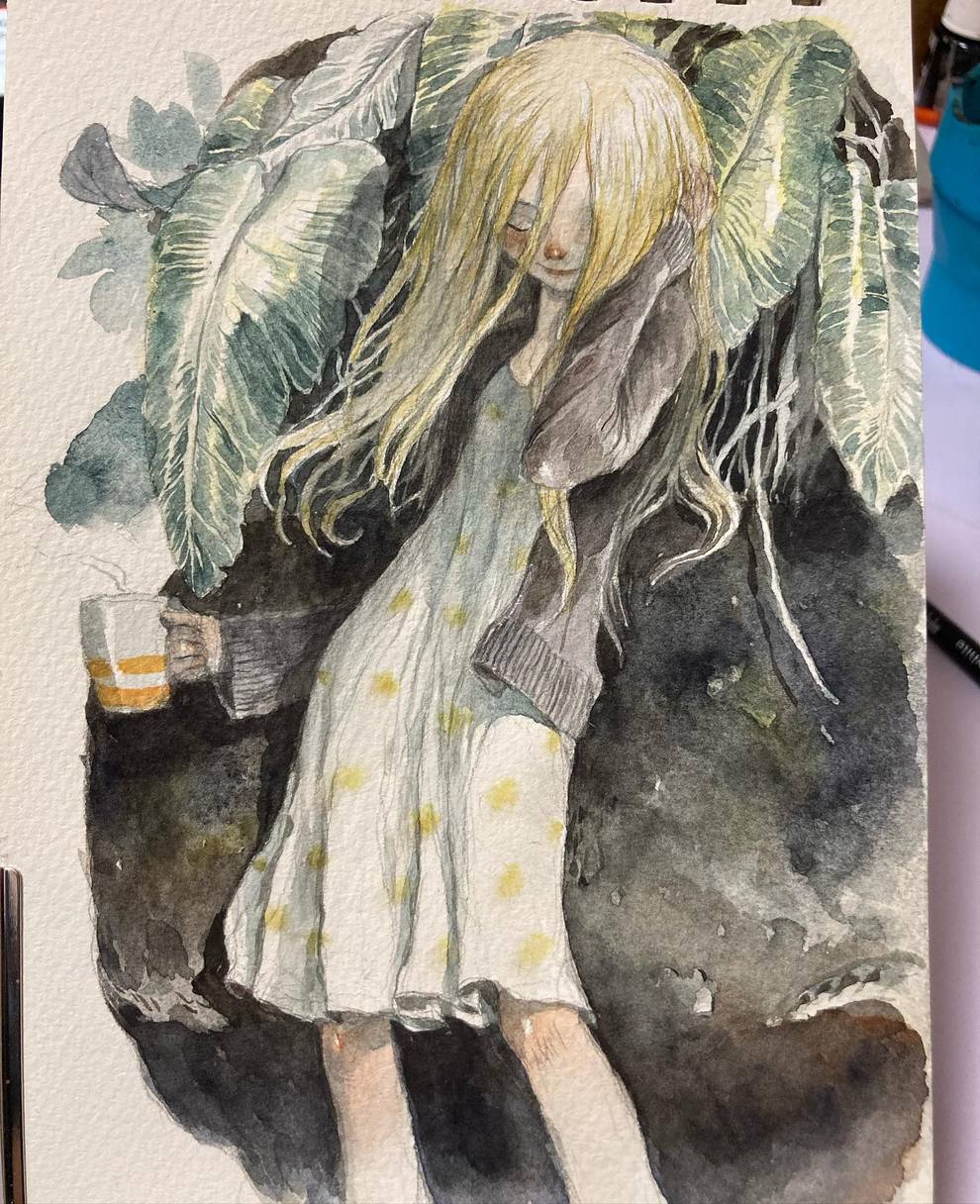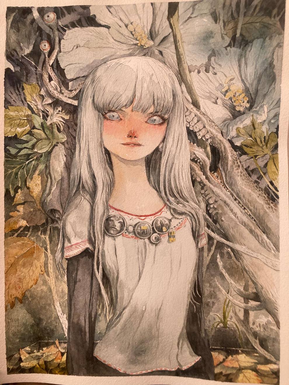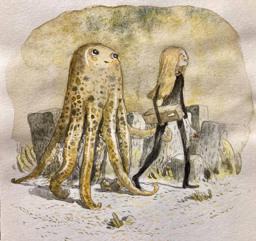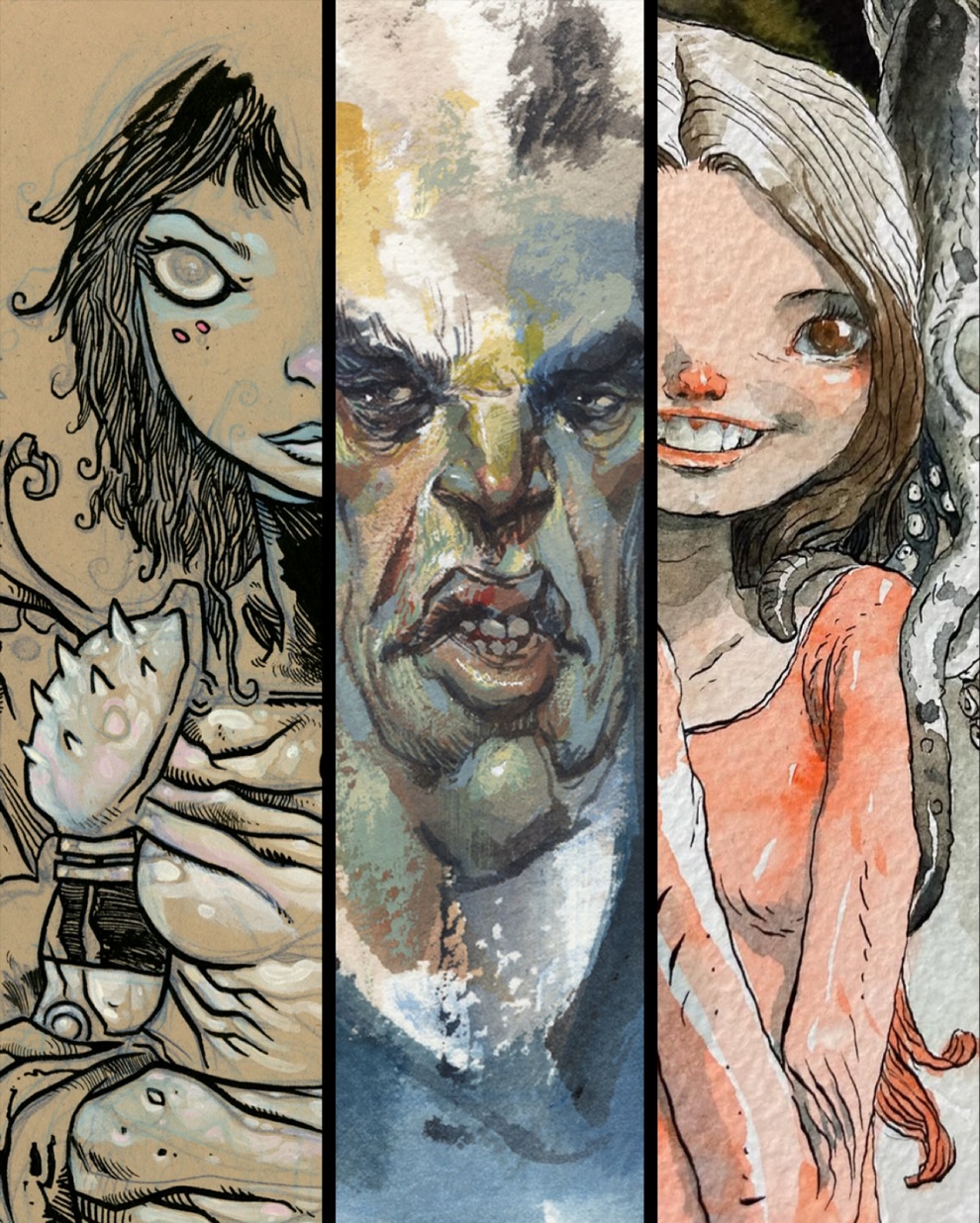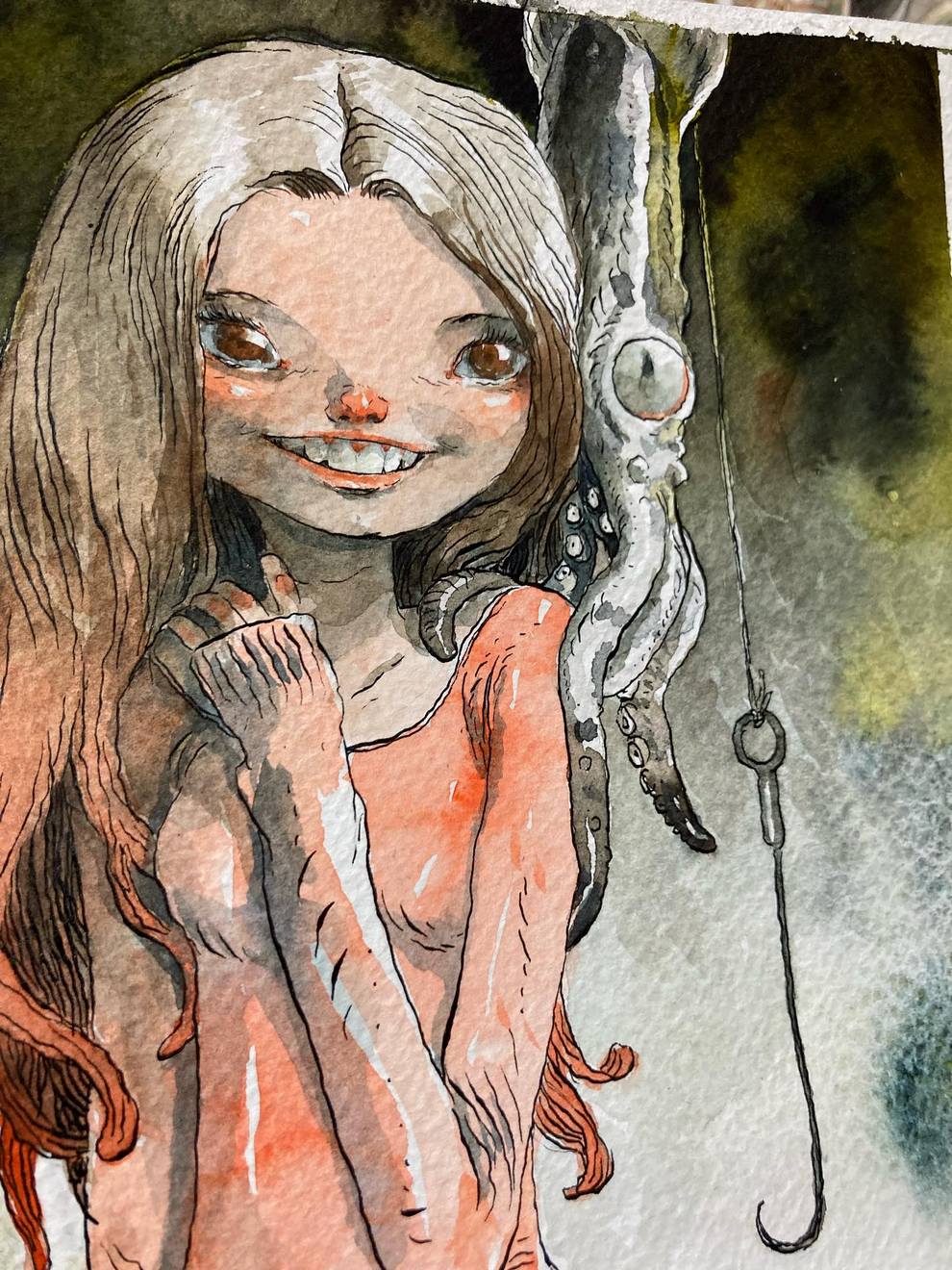 Alongside his well‑known graphic novels, he keeps releasing self‑published fanzines under the “Rain of Doom” name and fills sketchbooks with quick pencil and ink drawings, then revisits those ideas in finished watercolour and acrylic pieces like his ongoing “yellow fish” and “weird animals” series. His Instagram mixes loose sketches, process videos and finished illustrations, often tagged #fishrider and shared by art communities like SuperAni, positioning him as a cult favourite in contemporary dark‑fantasy comics and illustration.