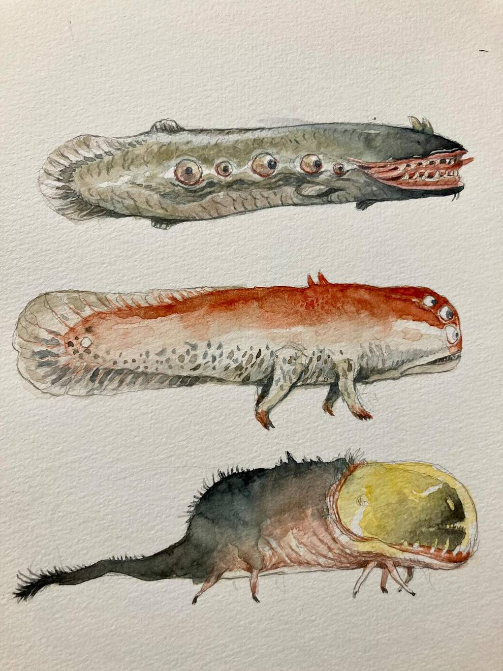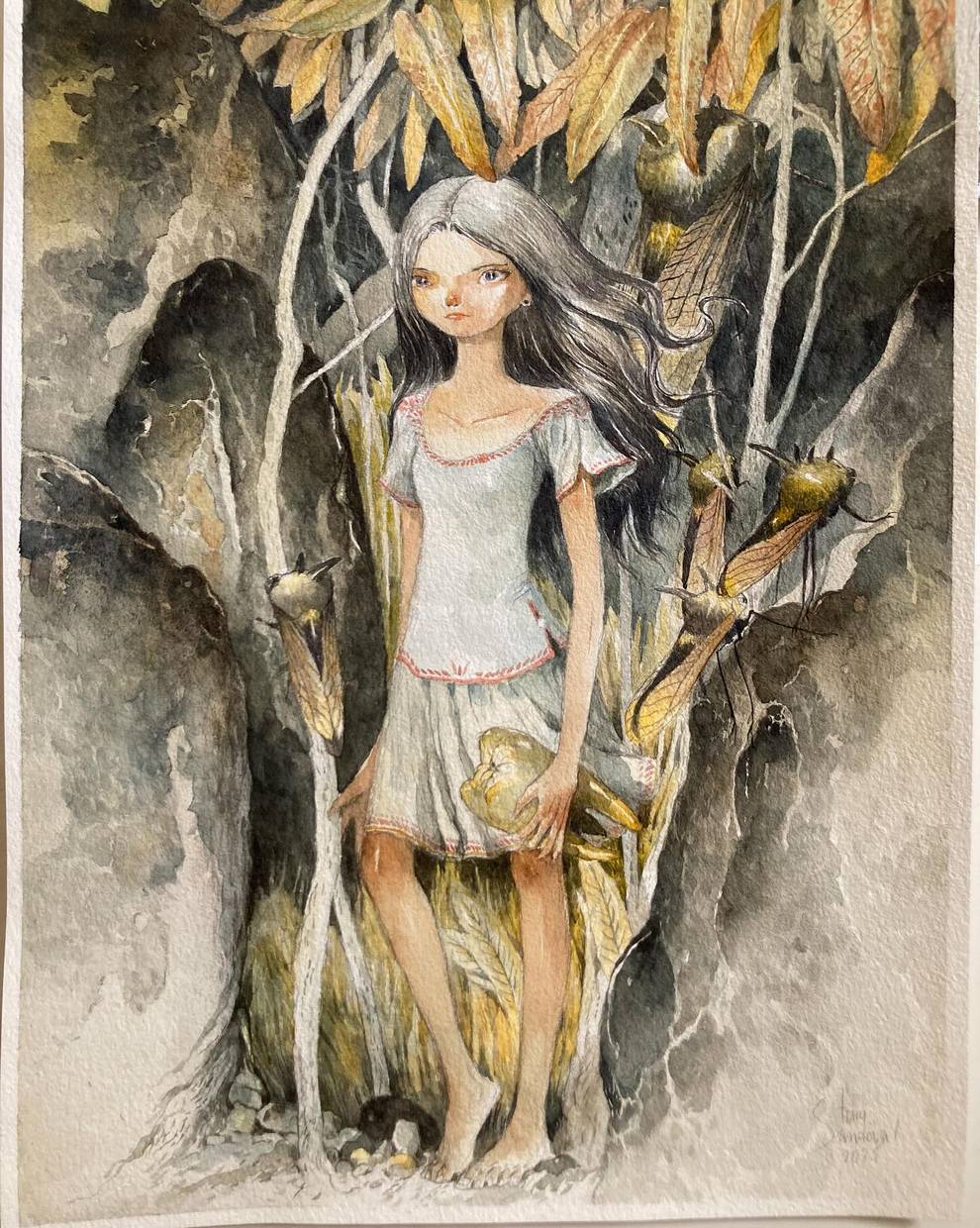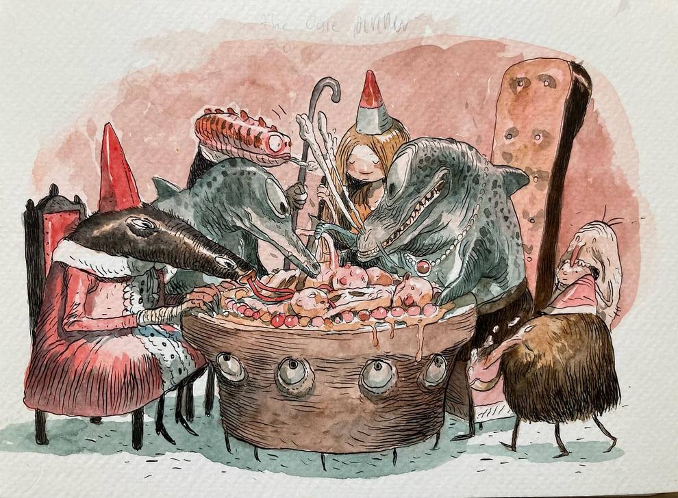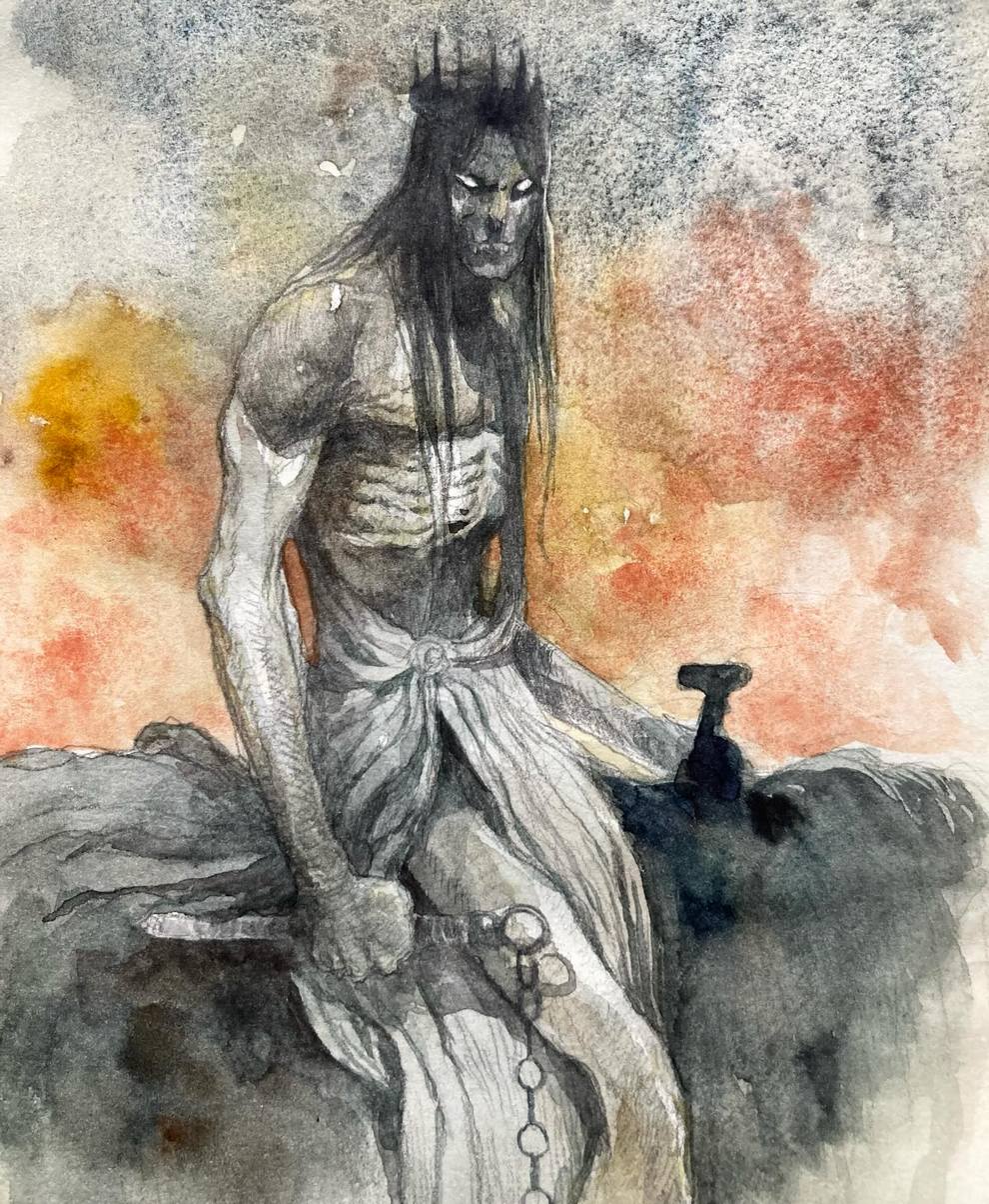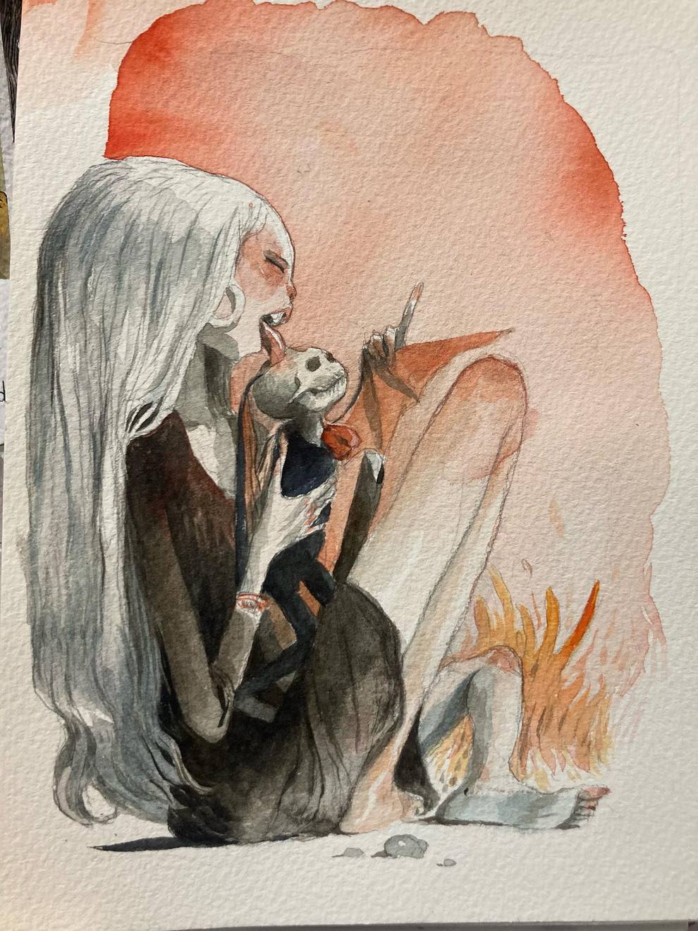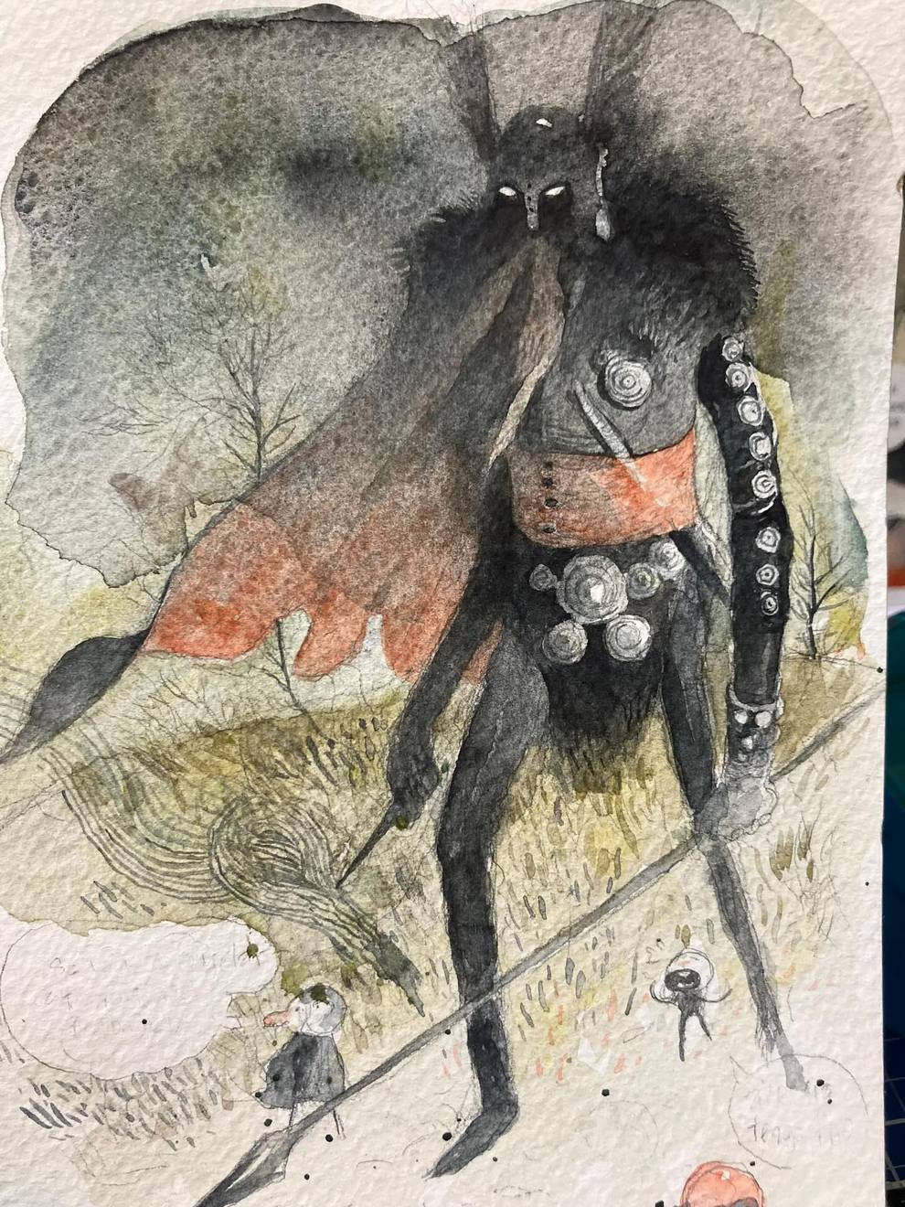Alongside his well‑known graphic novels, he keeps releasing self‑published fanzines under the “Rain of Doom” name and fills sketchbooks with quick pencil and ink drawings, then revisits those ideas in finished watercolour and acrylic pieces like his ongoing “yellow fish” and “weird animals” series. His Instagram mixes loose sketches, process videos and finished illustrations, often tagged #fishrider and shared by art communities like SuperAni, positioning him as a cult favourite in contemporary dark‑fantasy comics and illustration.