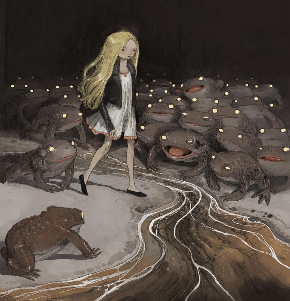 Tony Sandoval is a Mexican illustrator and comic‑book artist based in Europe, known for dreamy, slightly macabre watercolours where big‑headed kids, ghosts, monsters and fish riders drift through melancholic landscapes.