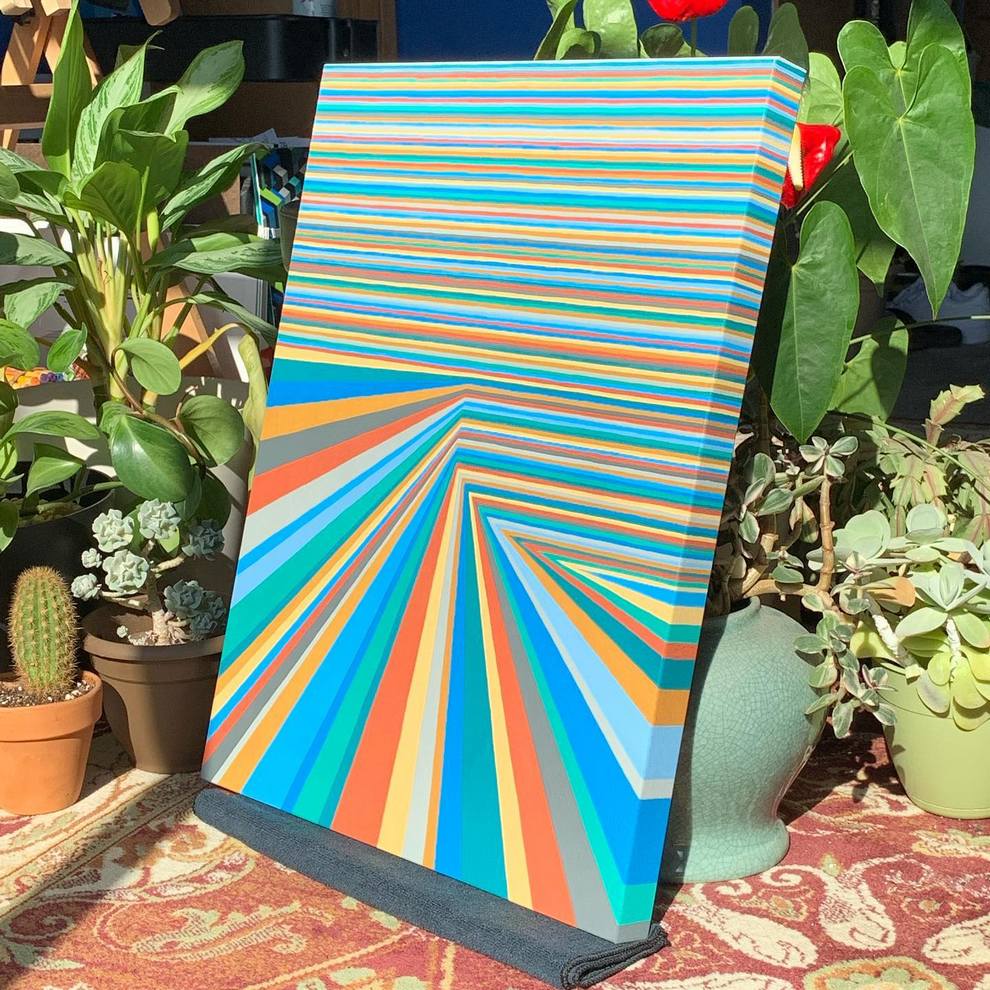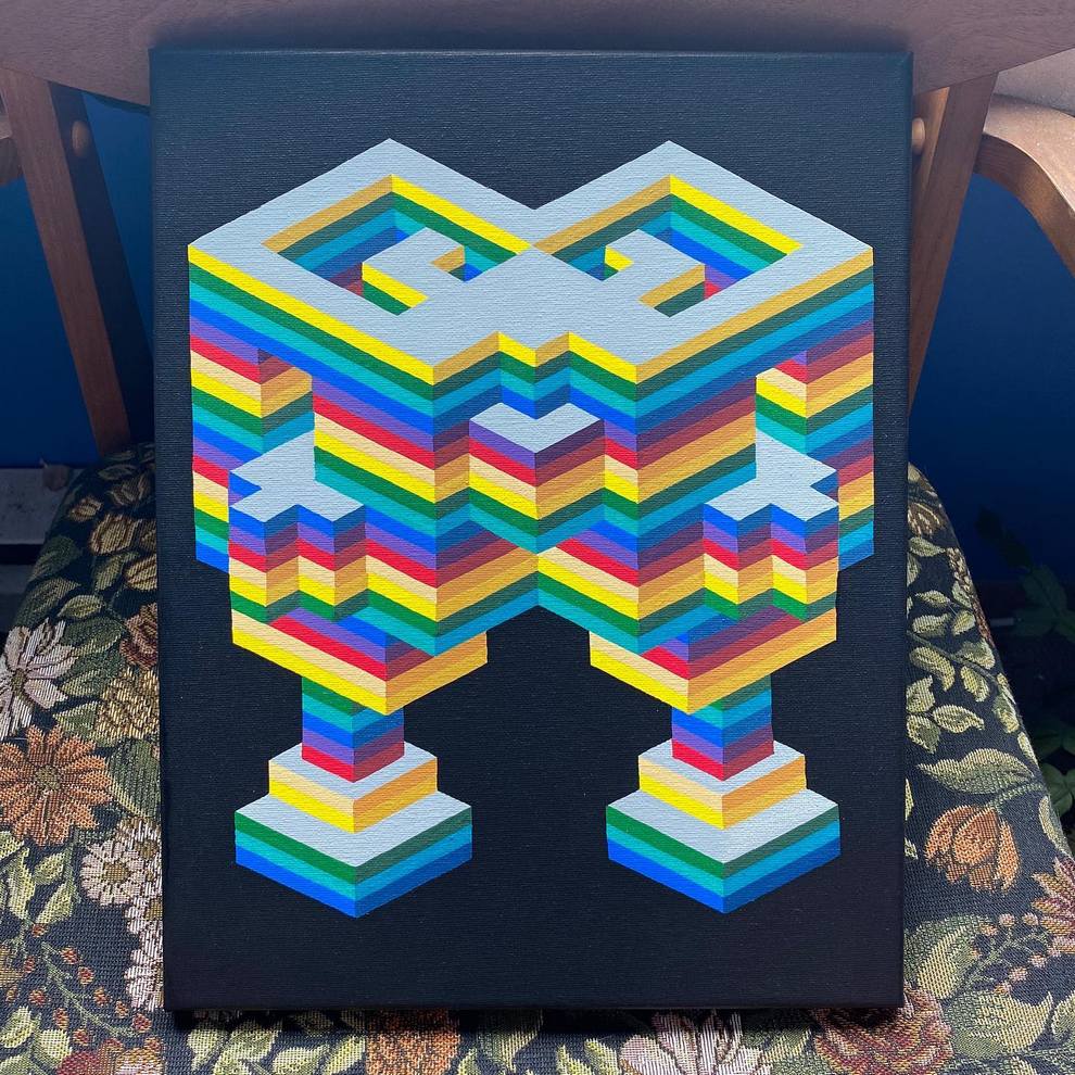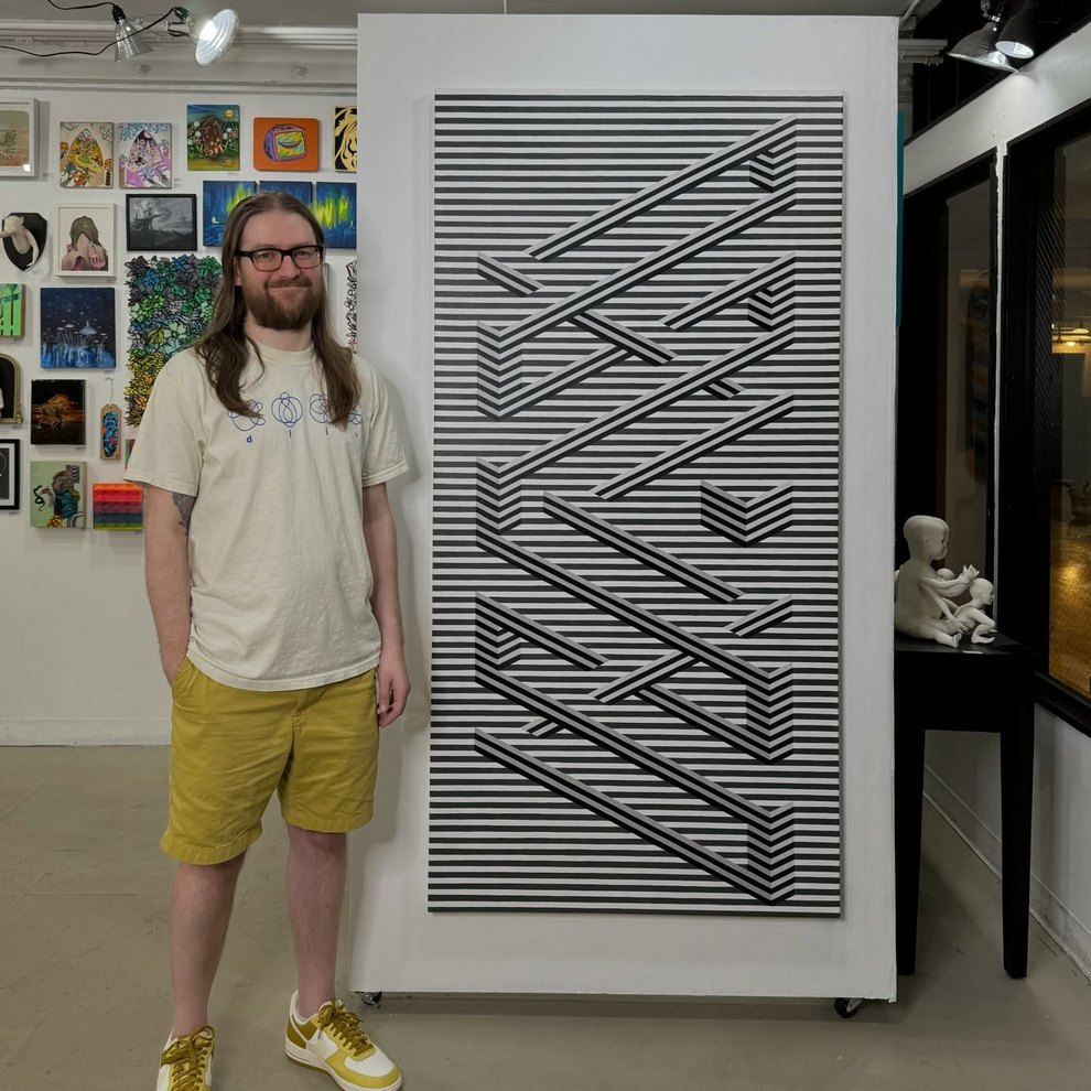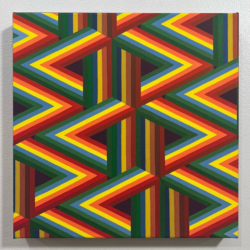 He shows and sells work in person at Pike Place Market (Seattle) and through local spaces like Hideout Seattle and Statix, and he curates/helps run Gallery Ergo, organizing themed group shows such as “Meow Brow” that spotlight other pop‑surreal and illustrative painters. His pieces like “Clear Skies” emphasize rhythm, symmetry and color interactions over figurative content, positioning him firmly in contemporary geometric abstraction while staying connected to a tight‑knit Northwest art scene.