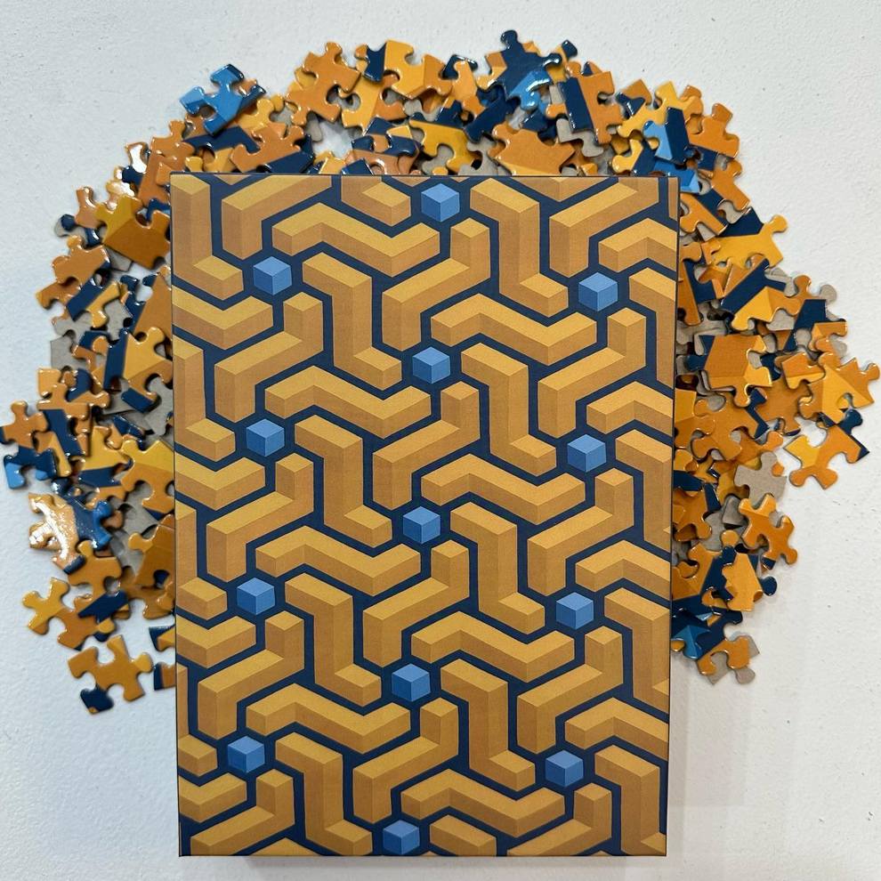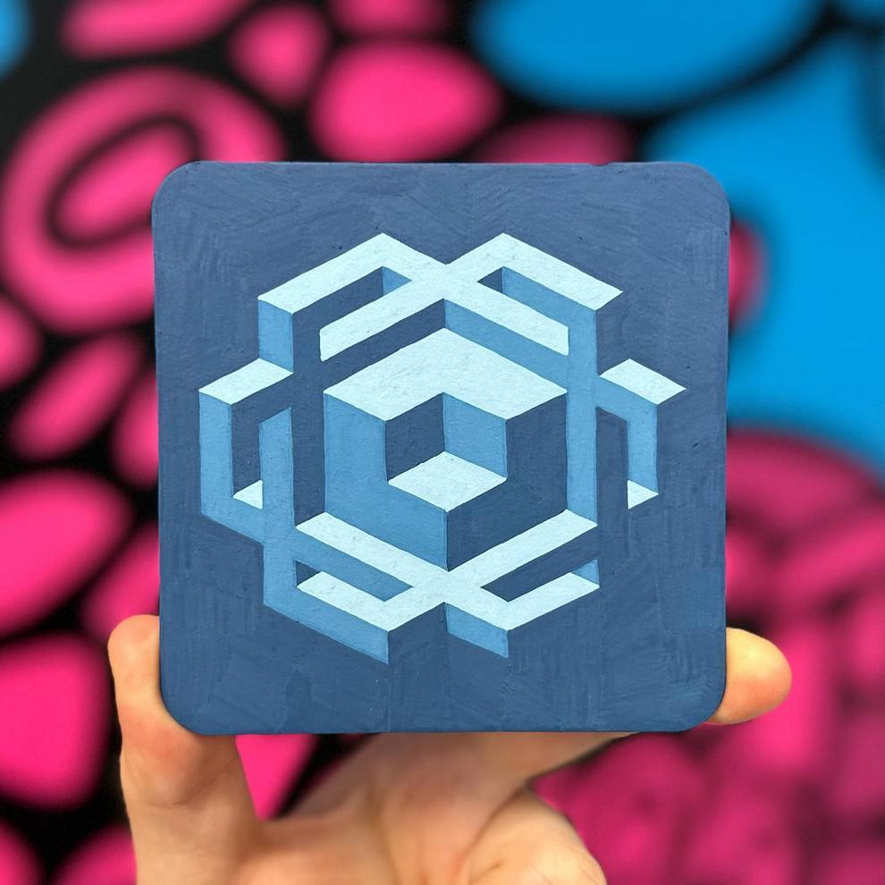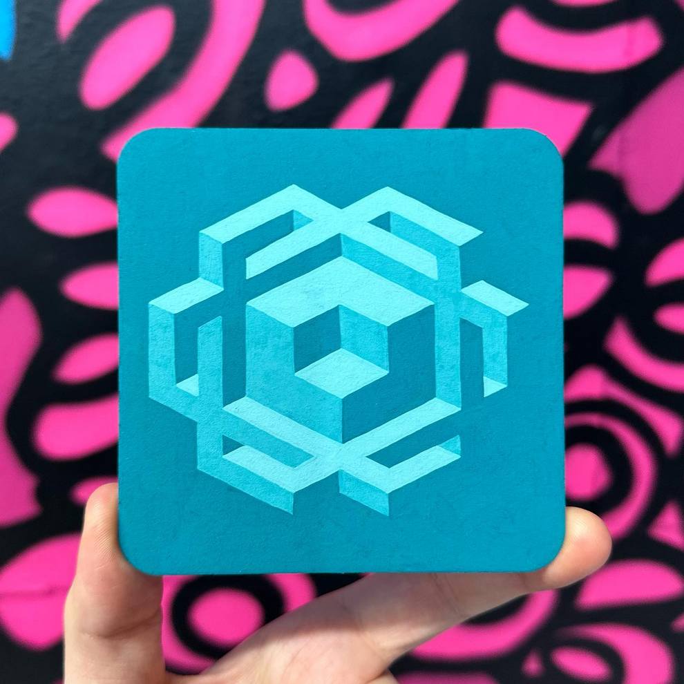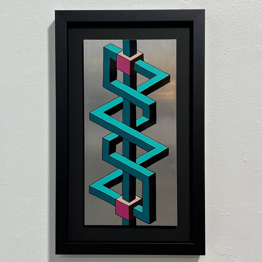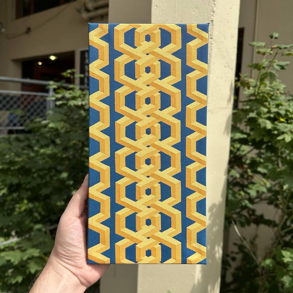 He shows and sells work in person at Pike Place Market (Seattle) and through local spaces like Hideout Seattle and Statix, and he curates/helps run Gallery Ergo, organizing themed group shows such as “Meow Brow” that spotlight other pop‑surreal and illustrative painters. His pieces like “Clear Skies” emphasize rhythm, symmetry and color interactions over figurative content, positioning him firmly in contemporary geometric abstraction while staying connected to a tight‑knit Northwest art scene.