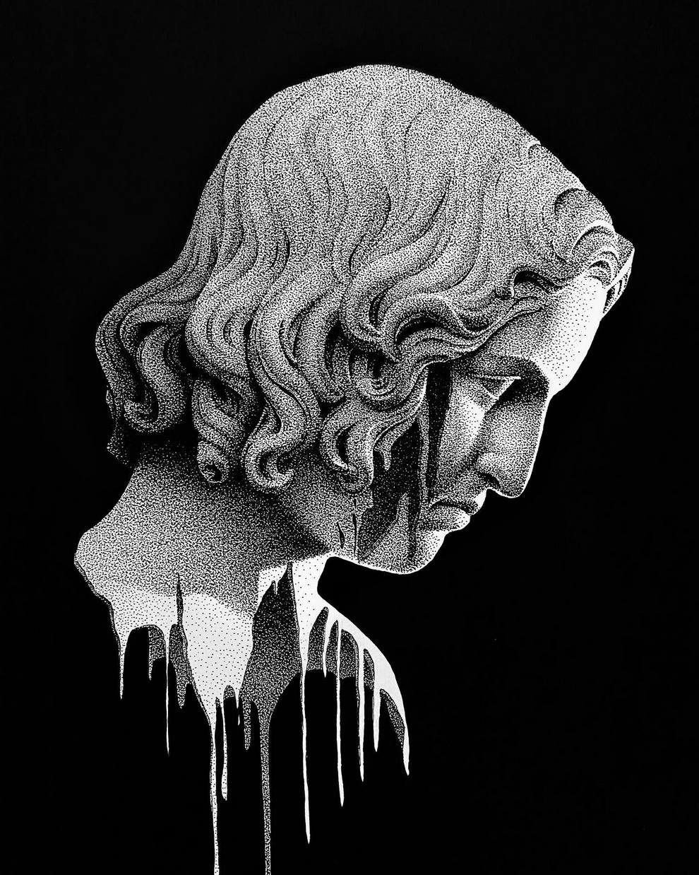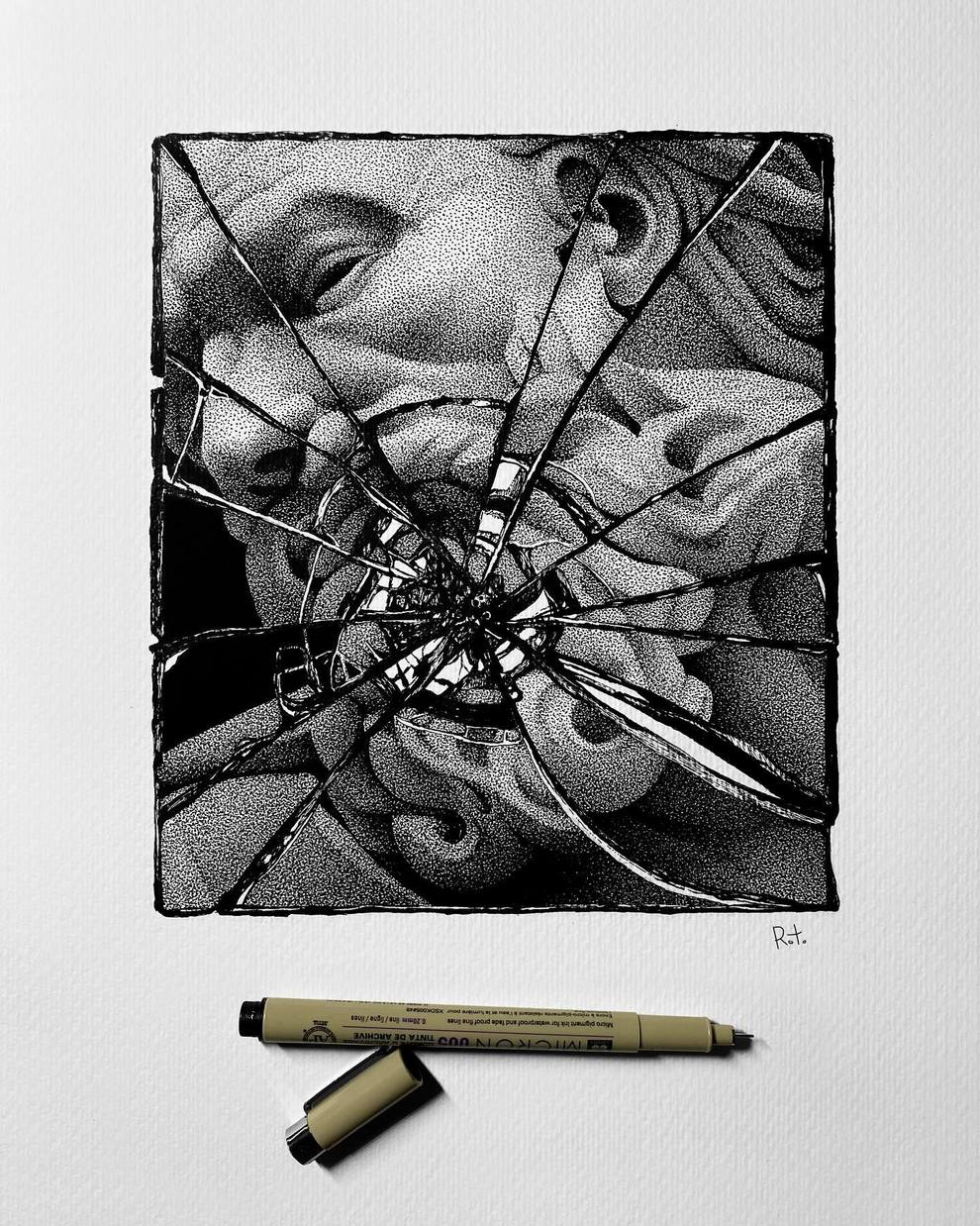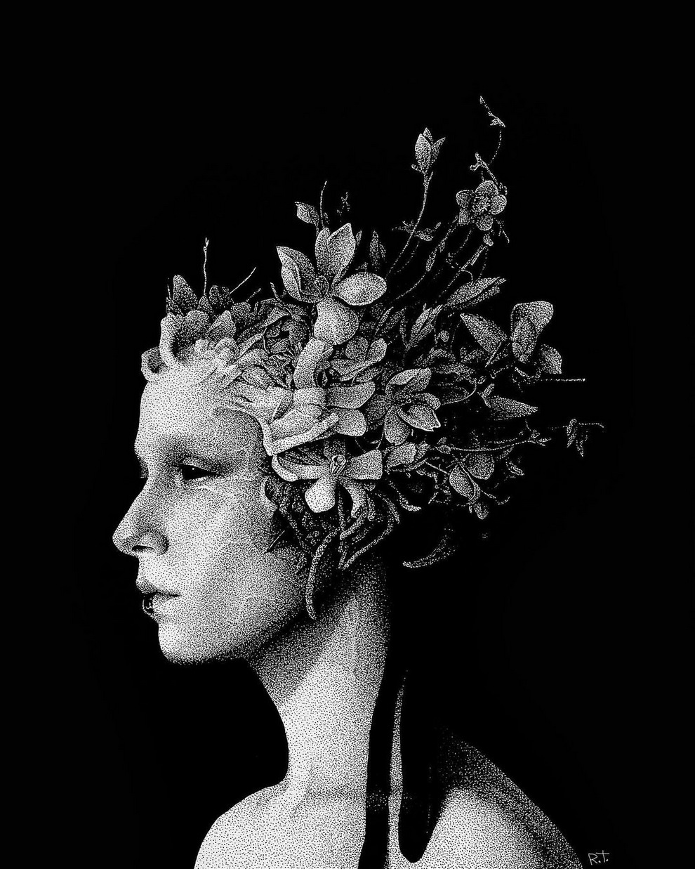 Rostislaw Tsarenko is a Ukrainian self‑taught artist from Poltava who specializes in highly detailed black‑and‑white ink drawings using dotwork and stippling to build realistic yet surreal, symbol‑heavy images.