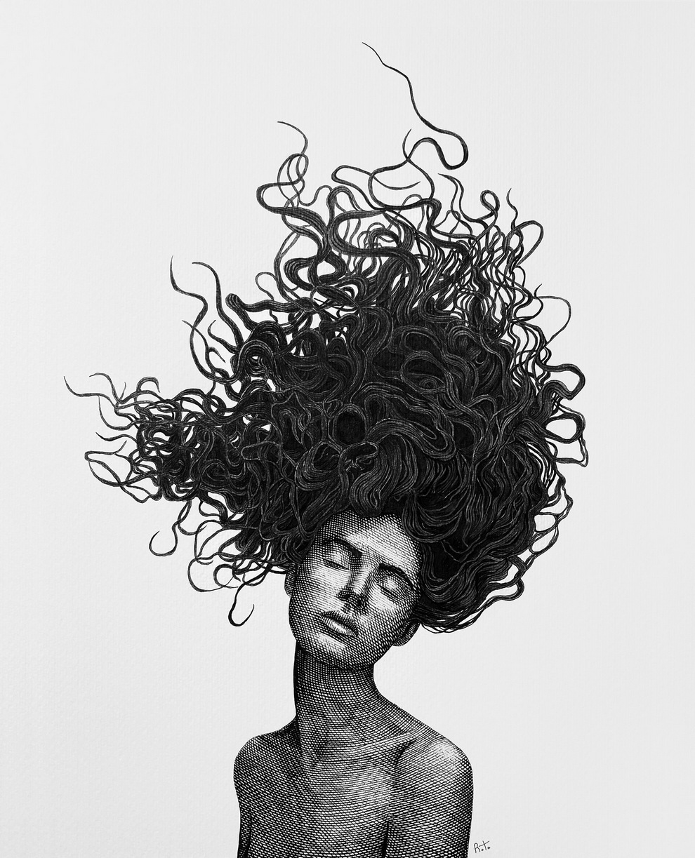 His pieces often explore ambiguous inner states—grief, guilt, rebirth, connection to nature—through motifs like crowned skeletons, queens and kings, forest guardians, animal–human hybrids, and figures splitting open to reveal fire, birds or other worlds, as seen in works such as “Forgiveness,” “Heat Inside,” “What Is Real And What Is Not?” and “The Forgotten Queen/King.” Alongside personal series like “Human and nature,” he shows in international group exhibitions (for example “Silver Linings” with the drawing “Light of truth”) and sells originals and prints via platforms like Artmajeur and Myartisreal while maintaining an active Instagram with process videos and archive posts.