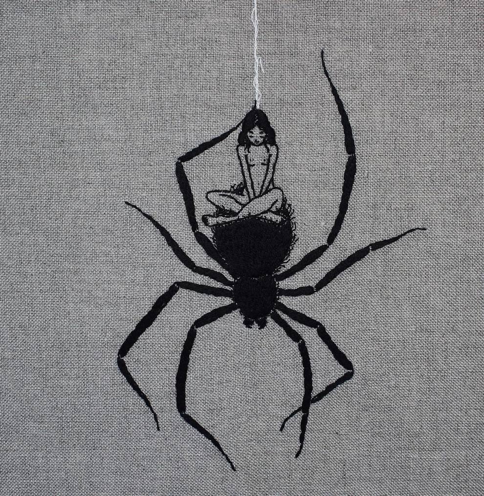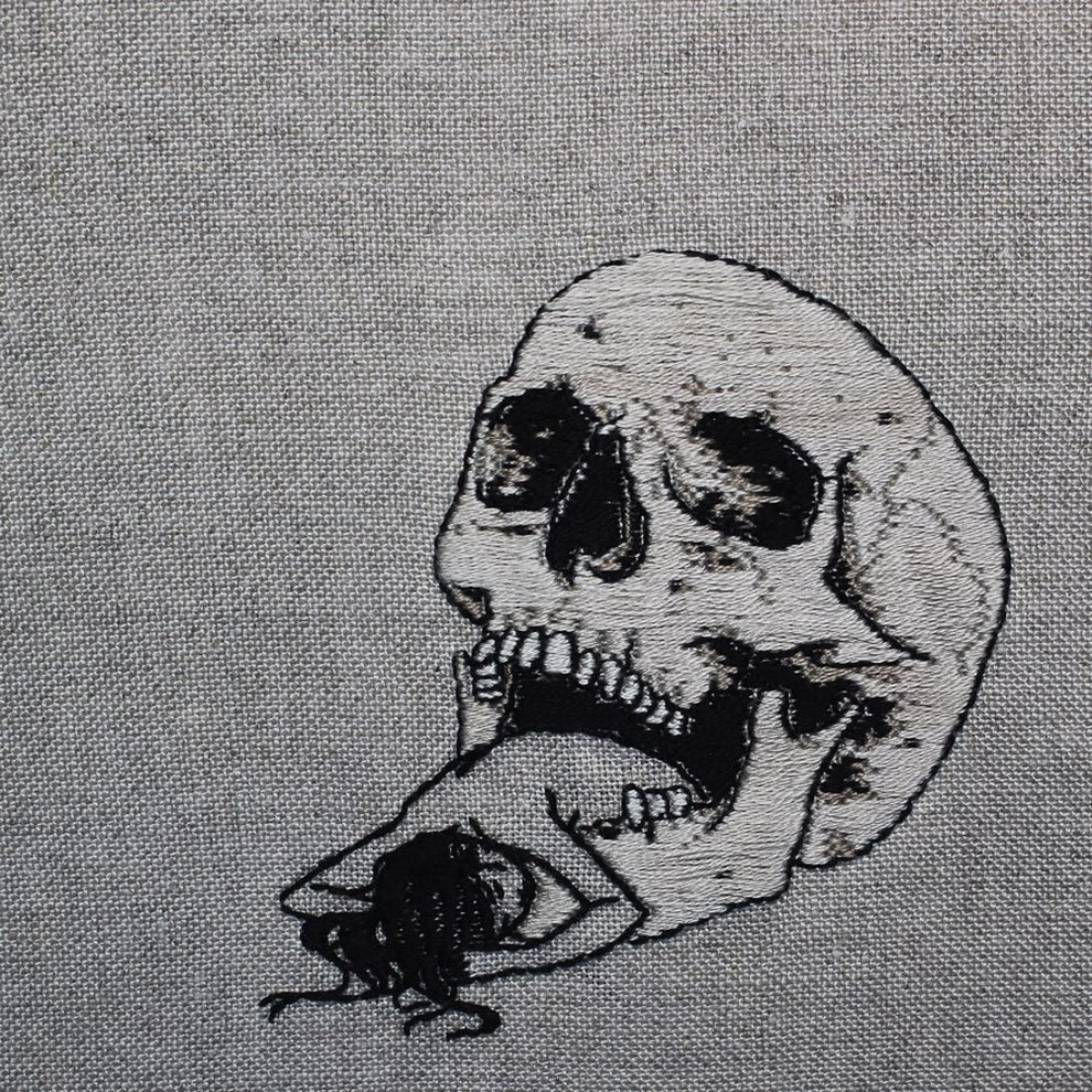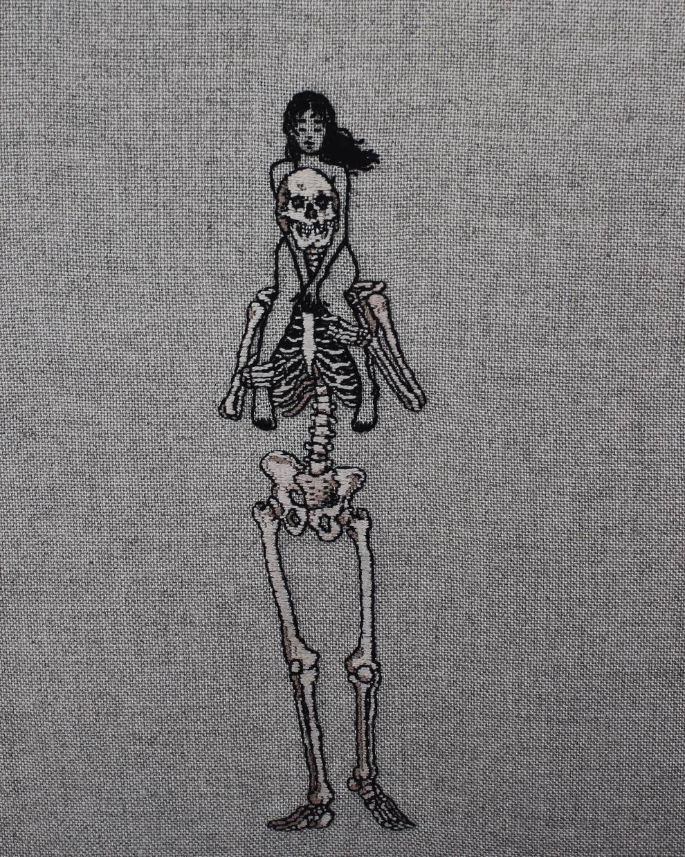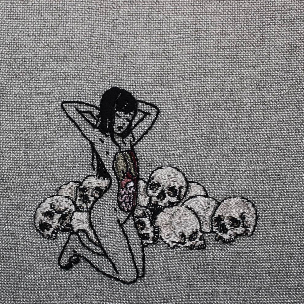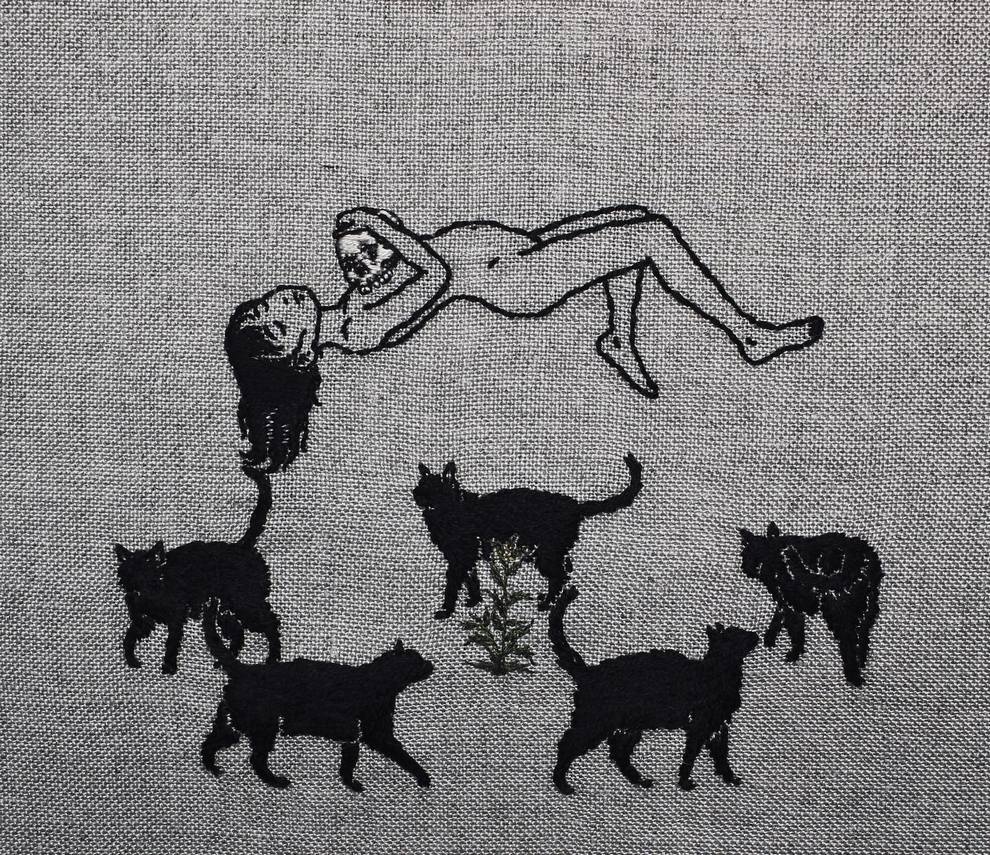 Themes draw from occult motifs, danse macabre, vanitas, death and the maiden, spiders, bats, skulls, and existential concepts like martyrdom and impermanence, often portraying raven‑haired maidens interacting with skeletons, goats, and deadly flora. Uses natural linen for sustainability; stitches temporary pieces on own skin; motifs symbolize emotional self‑portraits with irony, camp, and retro charm — tender, humorous, subtly disturbing.