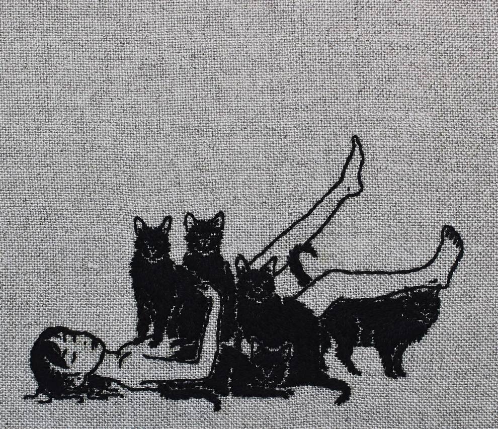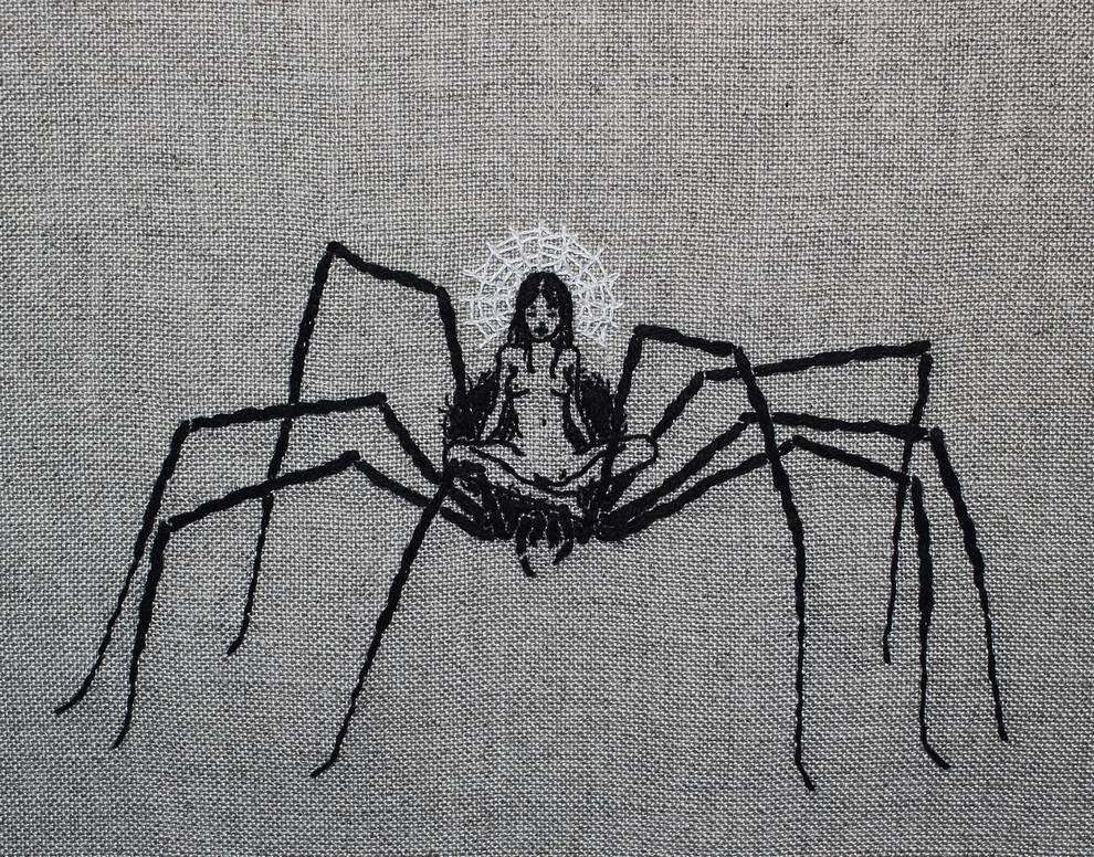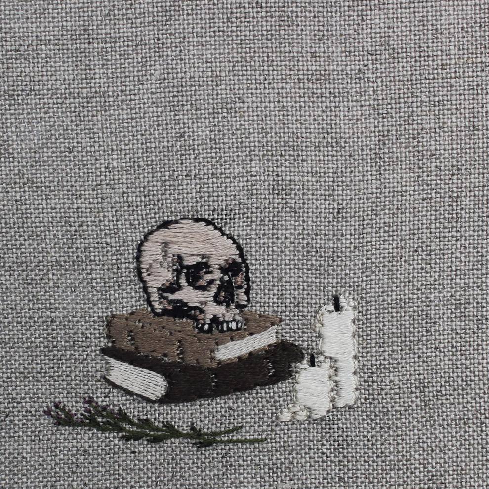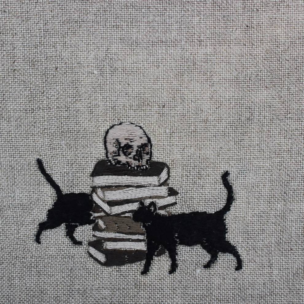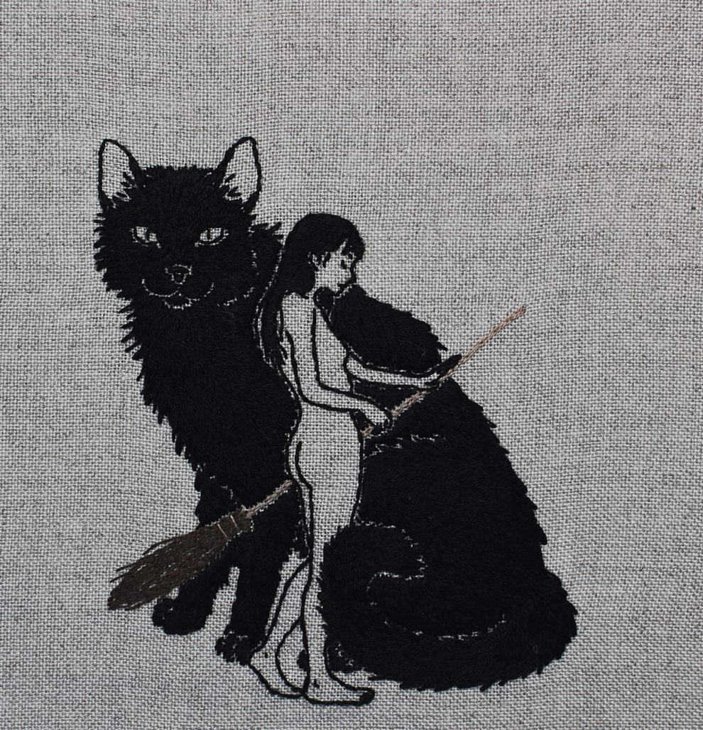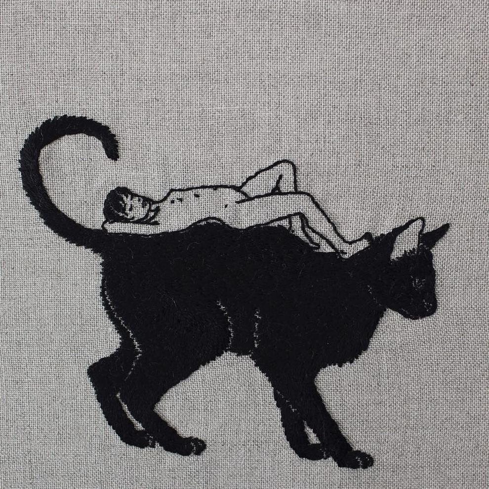 Themes draw from occult motifs, danse macabre, vanitas, death and the maiden, spiders, bats, skulls, and existential concepts like martyrdom and impermanence, often portraying raven‑haired maidens interacting with skeletons, goats, and deadly flora. Uses natural linen for sustainability; stitches temporary pieces on own skin; motifs symbolize emotional self‑portraits with irony, camp, and retro charm — tender, humorous, subtly disturbing.