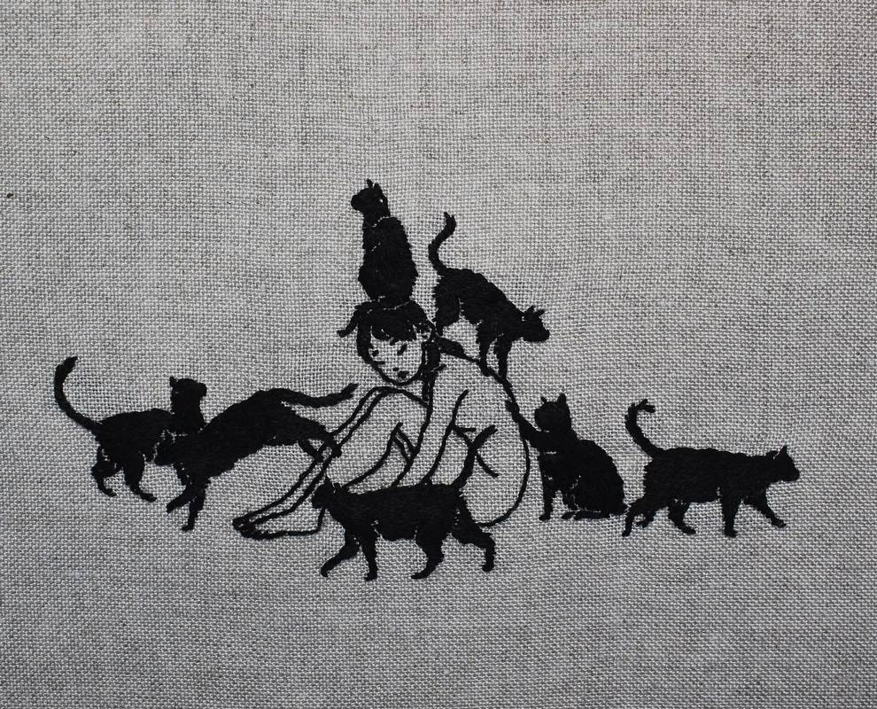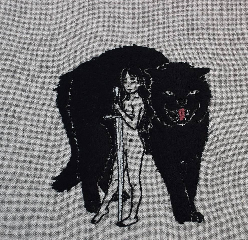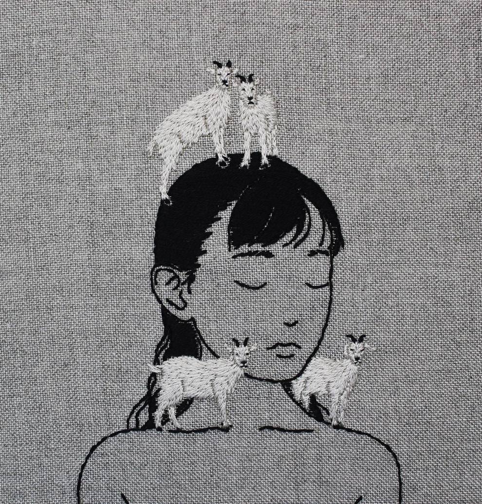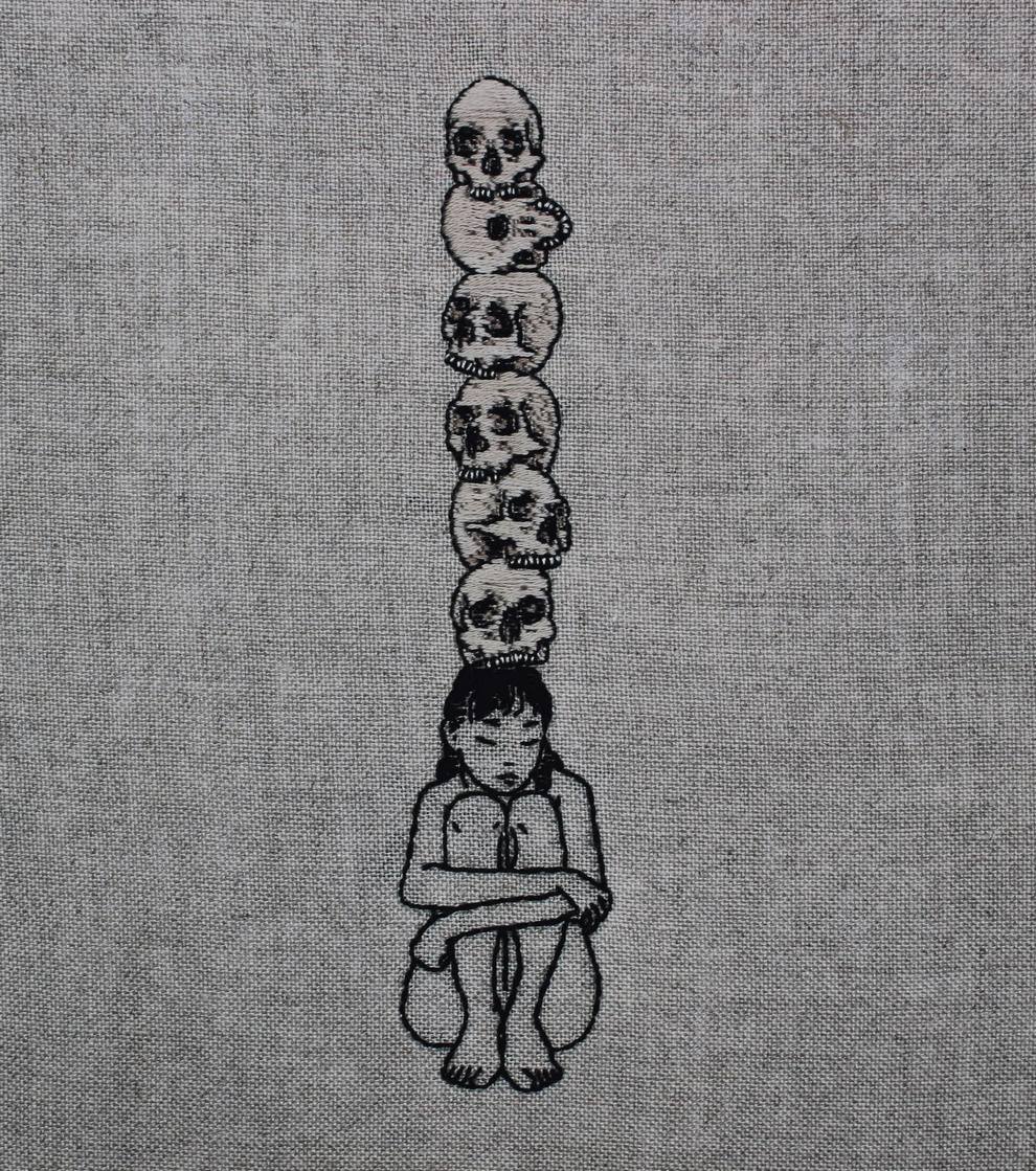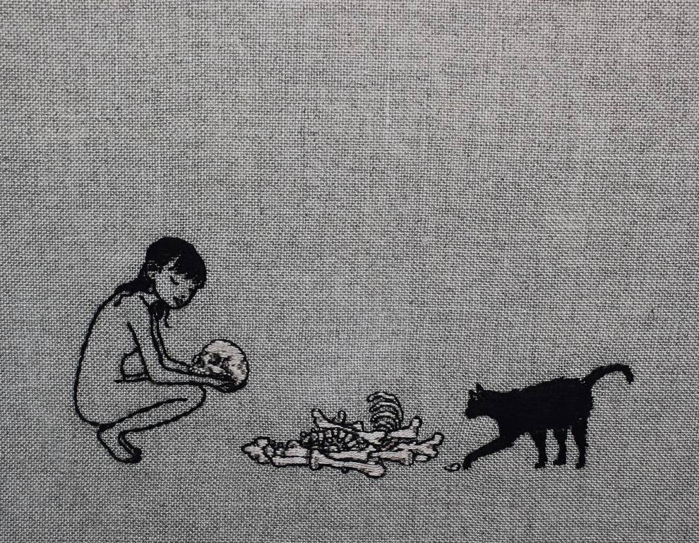 Themes draw from occult motifs, danse macabre, vanitas, death and the maiden, spiders, bats, skulls, and existential concepts like martyrdom and impermanence, often portraying raven‑haired maidens interacting with skeletons, goats, and deadly flora. Uses natural linen for sustainability; stitches temporary pieces on own skin; motifs symbolize emotional self‑portraits with irony, camp, and retro charm — tender, humorous, subtly disturbing.