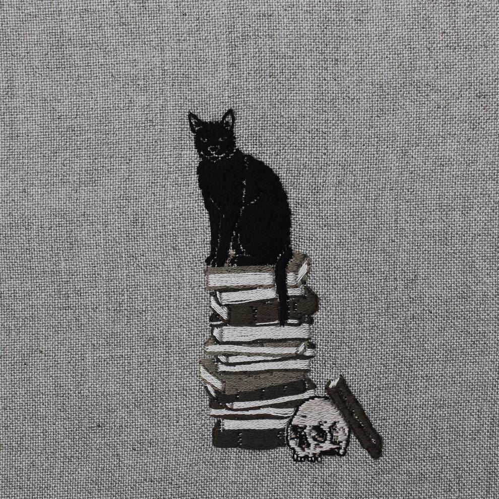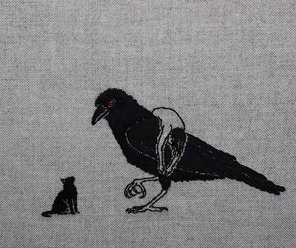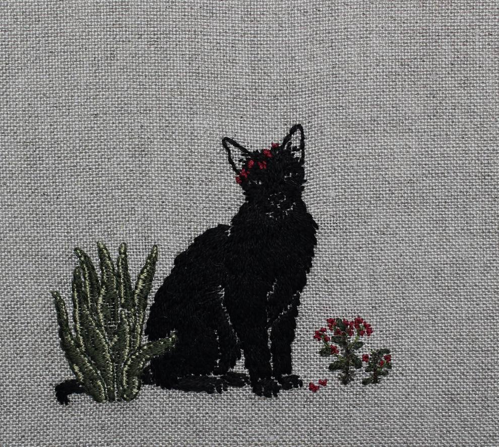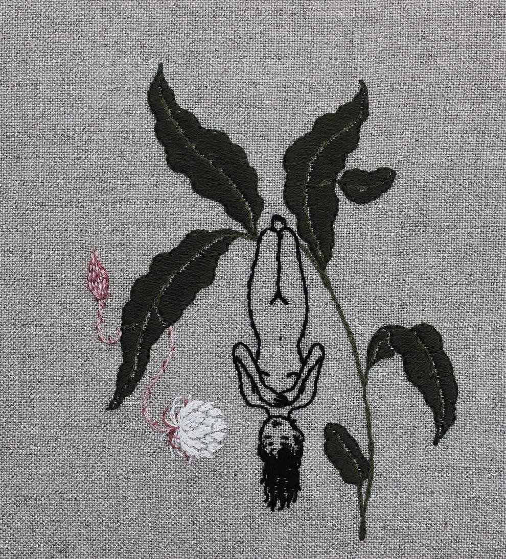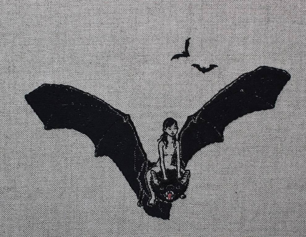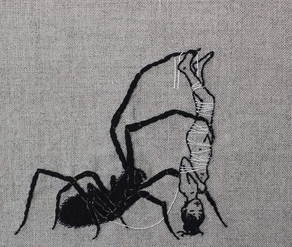 Themes draw from occult motifs, danse macabre, vanitas, death and the maiden, spiders, bats, skulls, and existential concepts like martyrdom and impermanence, often portraying raven‑haired maidens interacting with skeletons, goats, and deadly flora. Uses natural linen for sustainability; stitches temporary pieces on own skin; motifs symbolize emotional self‑portraits with irony, camp, and retro charm — tender, humorous, subtly disturbing.