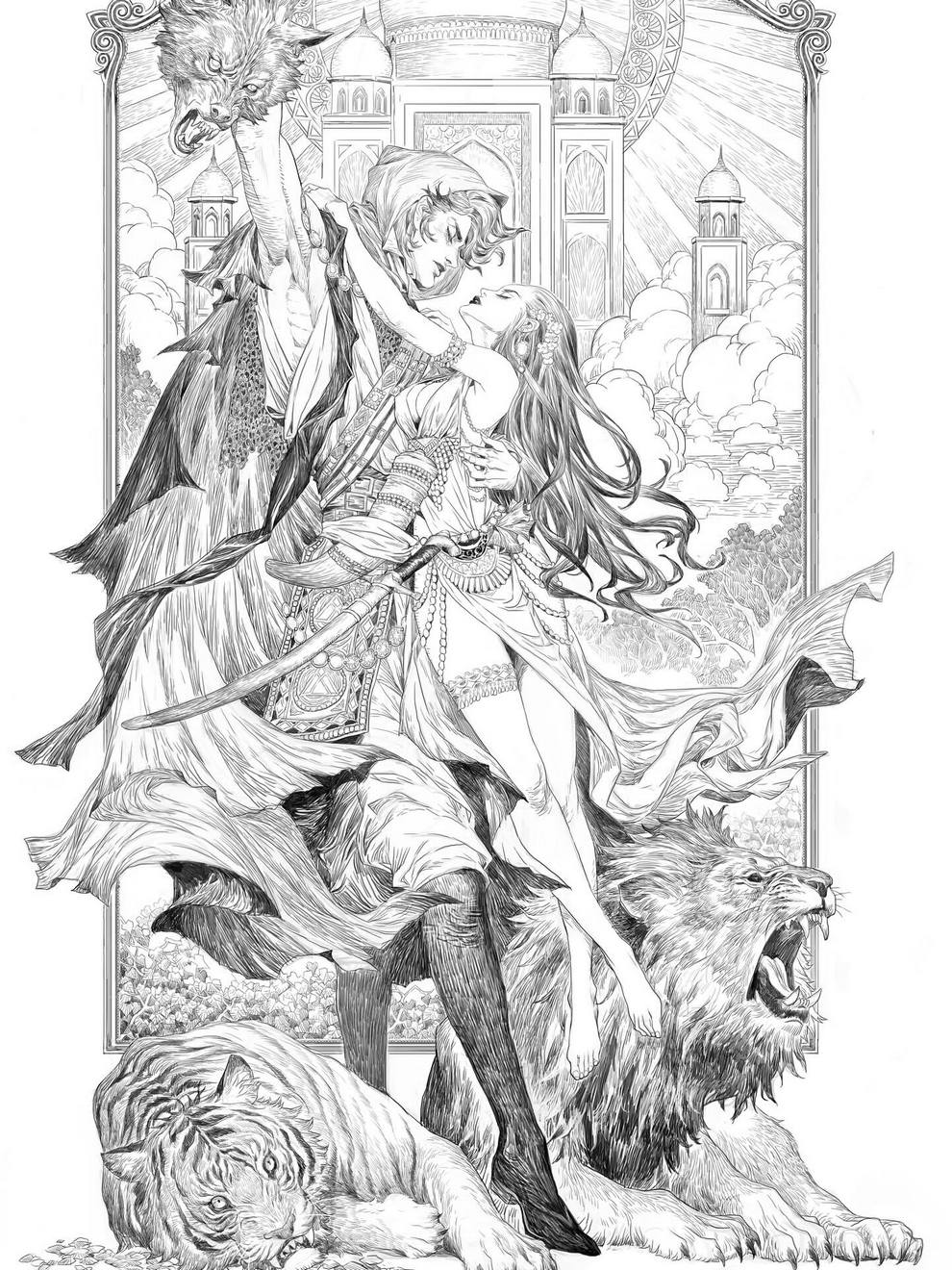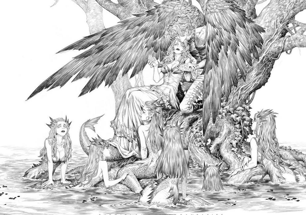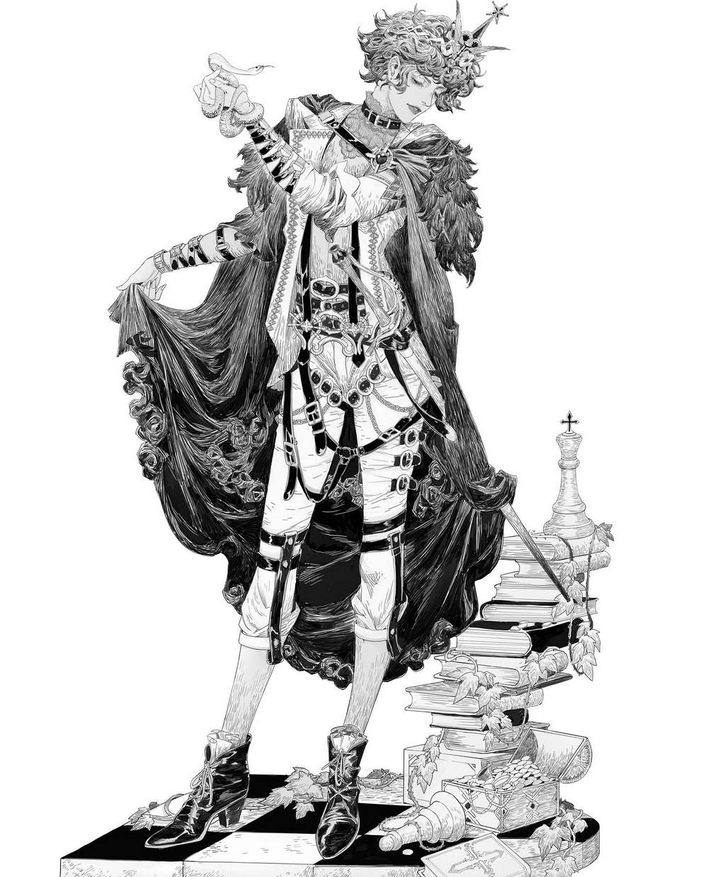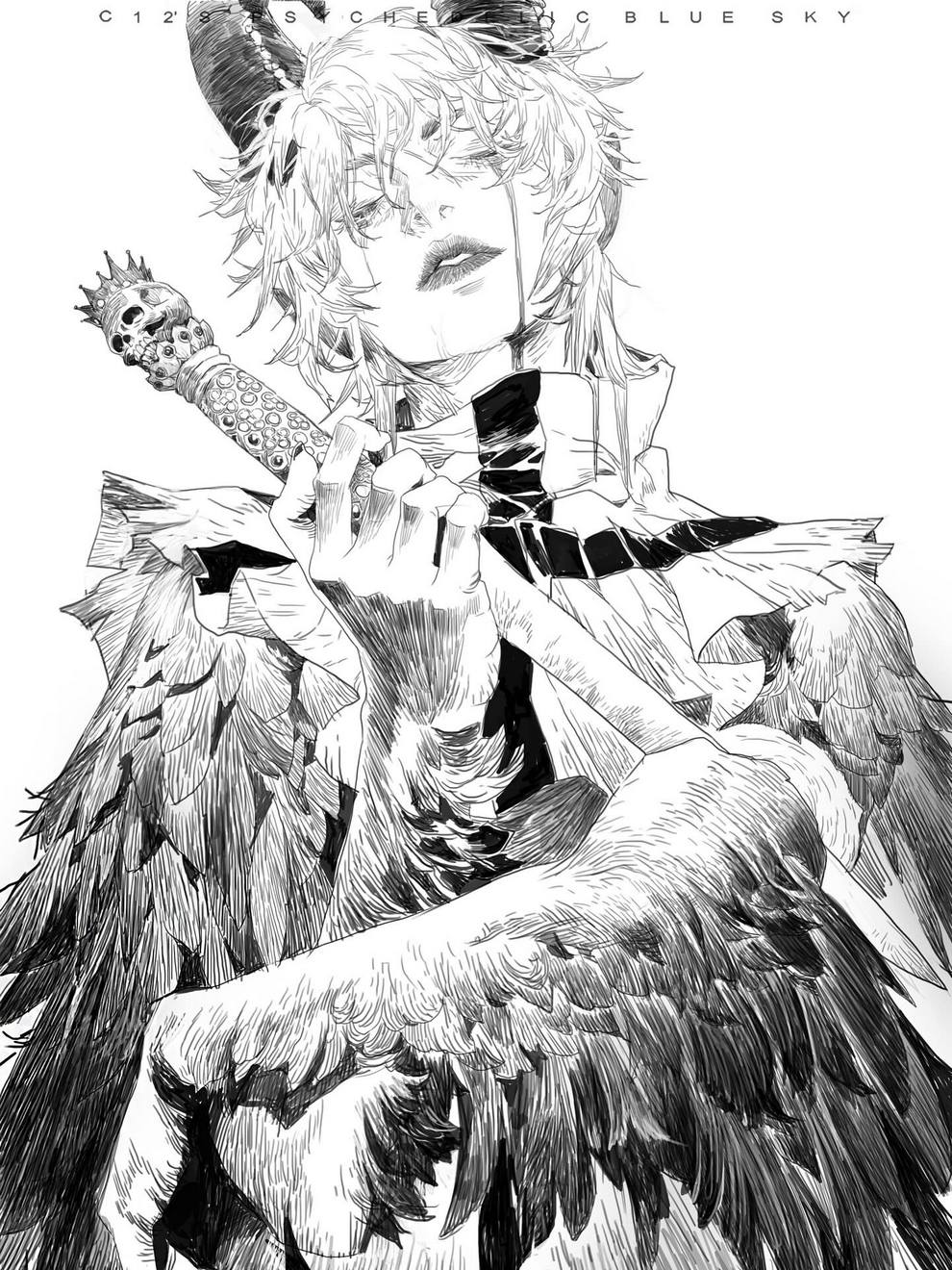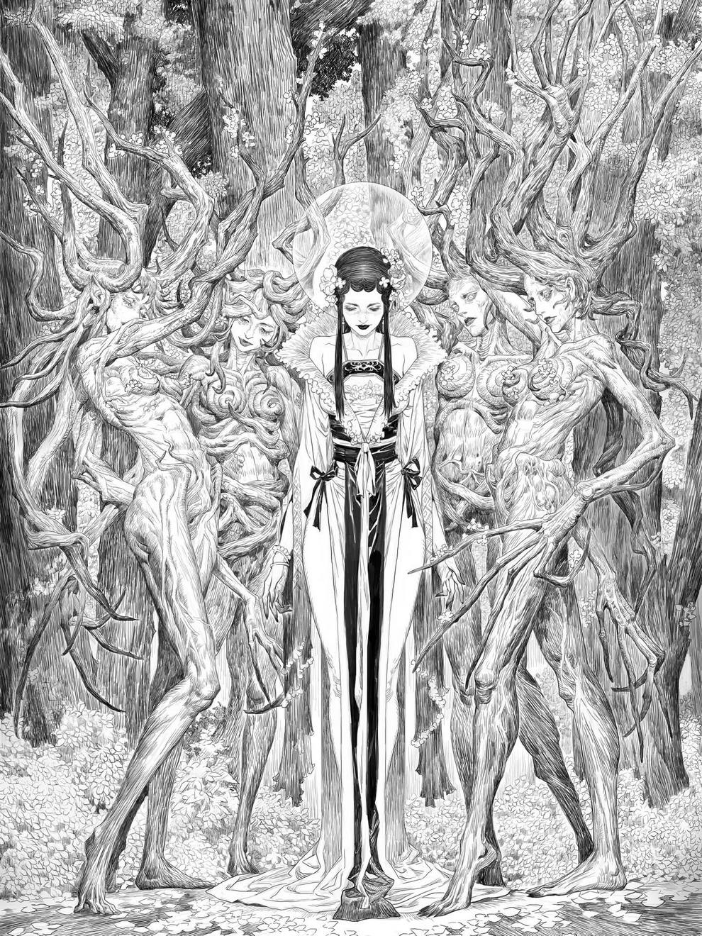 His work ranges from black‑and‑white, insanely intricate line‑art scenes to richly coloured fantasy pieces featuring astronaut girls, angelic figures, spider‑like women and cinematic, anime‑influenced characters that feel both grounded and surreal.