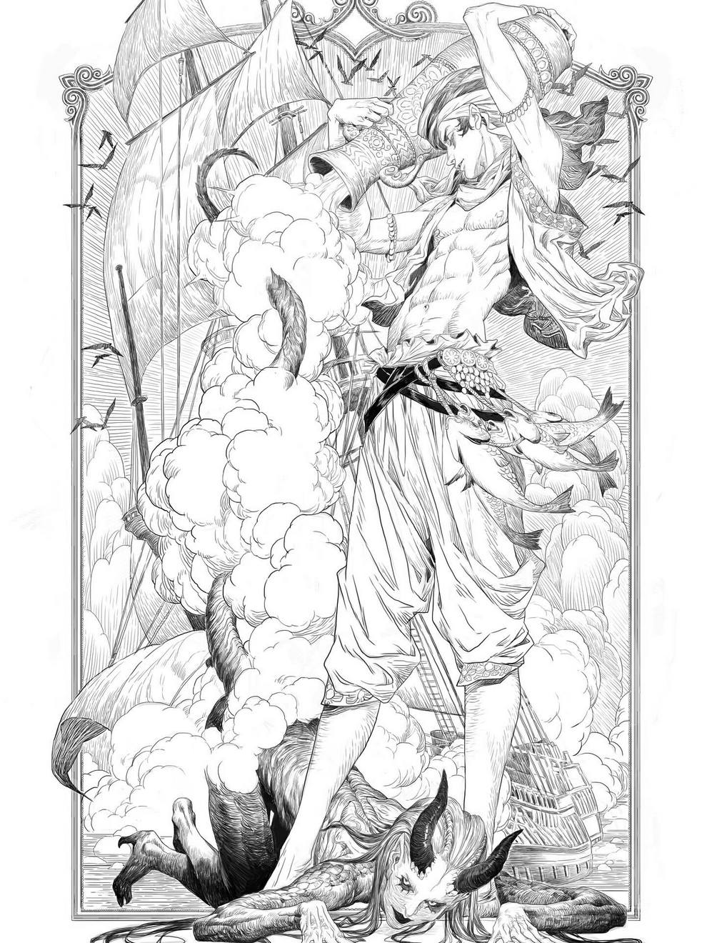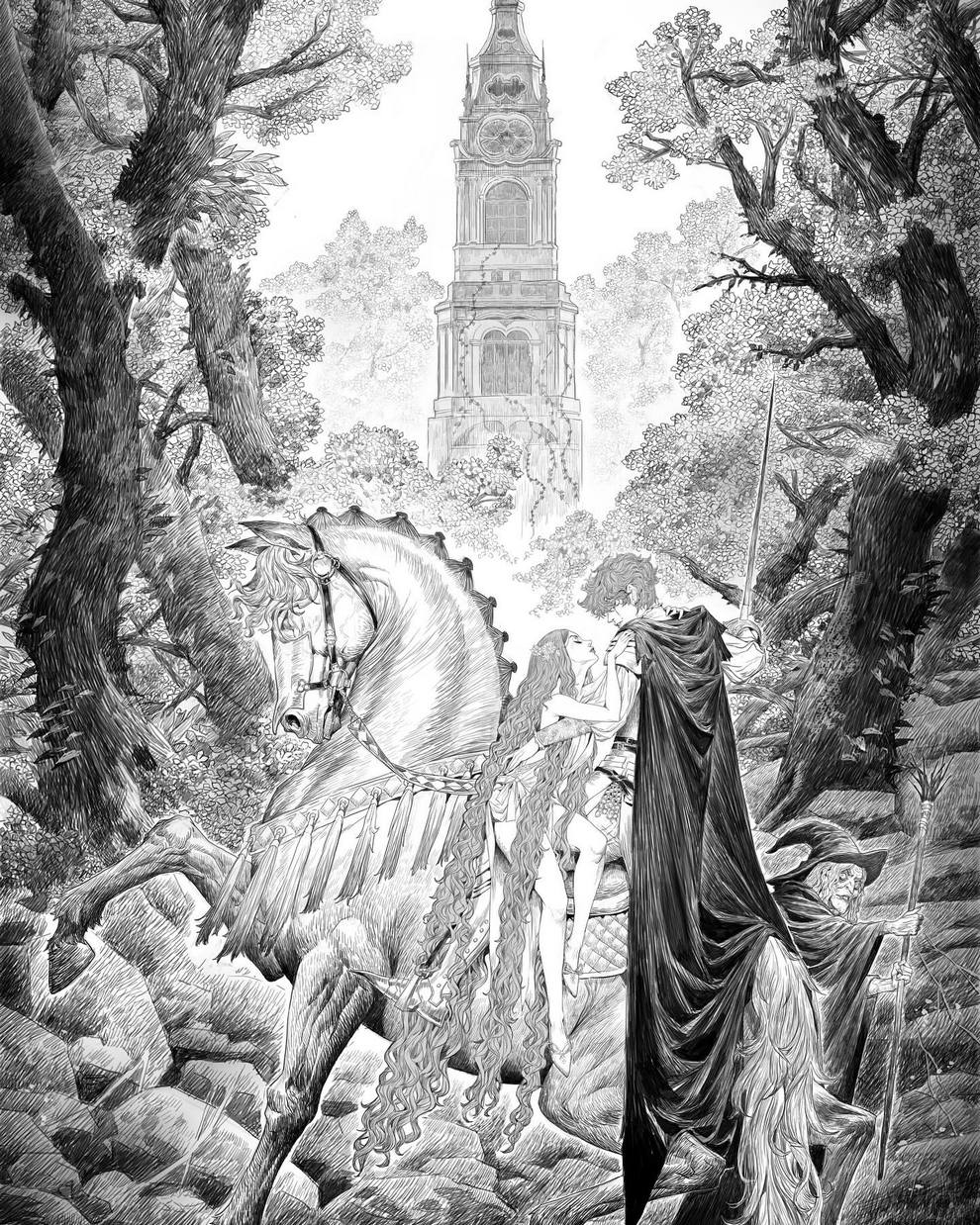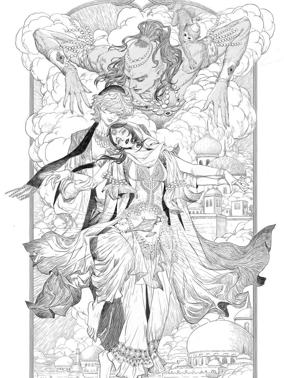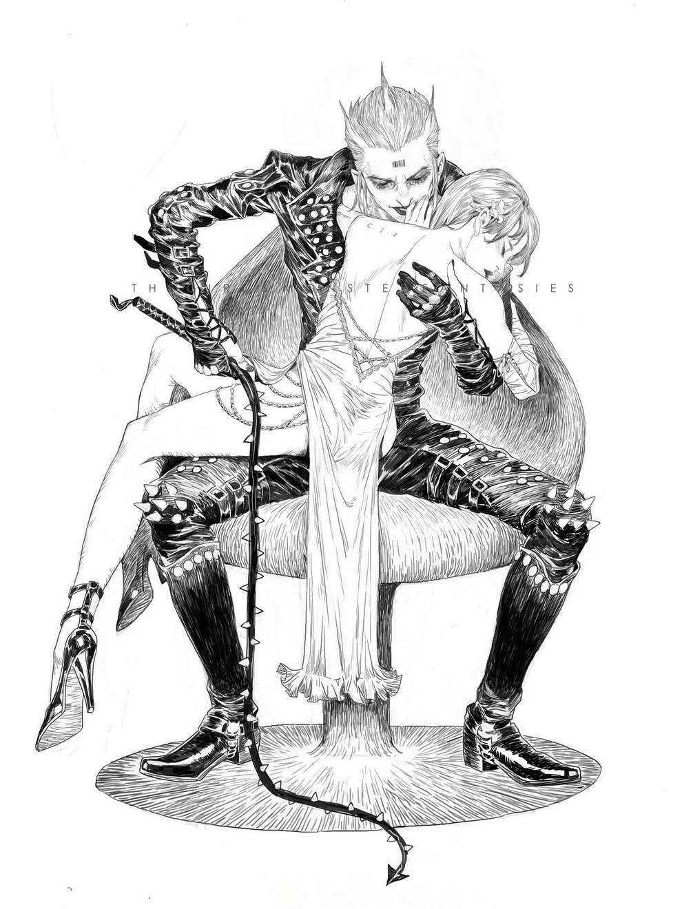 His work ranges from black‑and‑white, insanely intricate line‑art scenes to richly coloured fantasy pieces featuring astronaut girls, angelic figures, spider‑like women and cinematic, anime‑influenced characters that feel both grounded and surreal.
