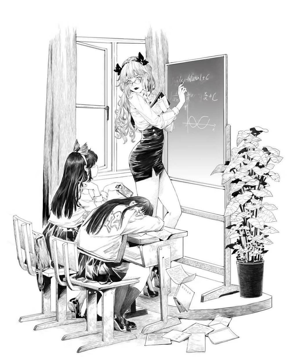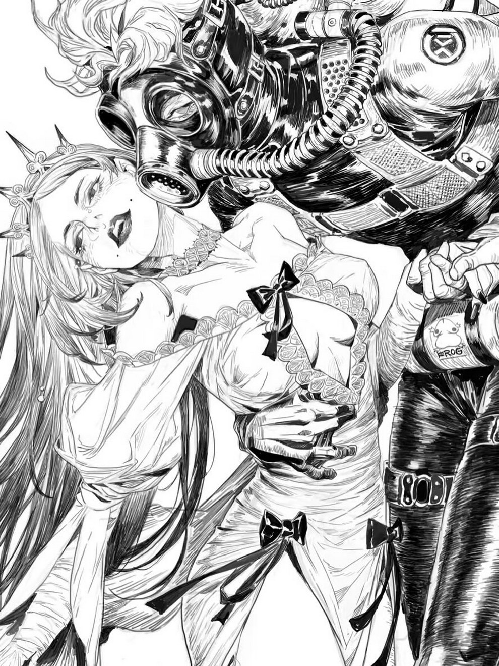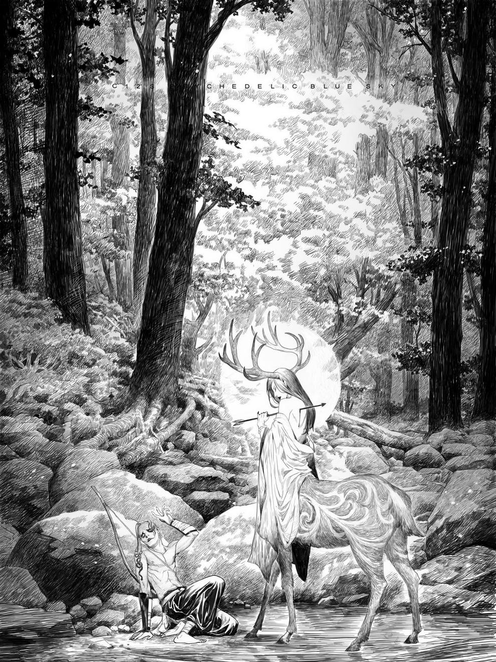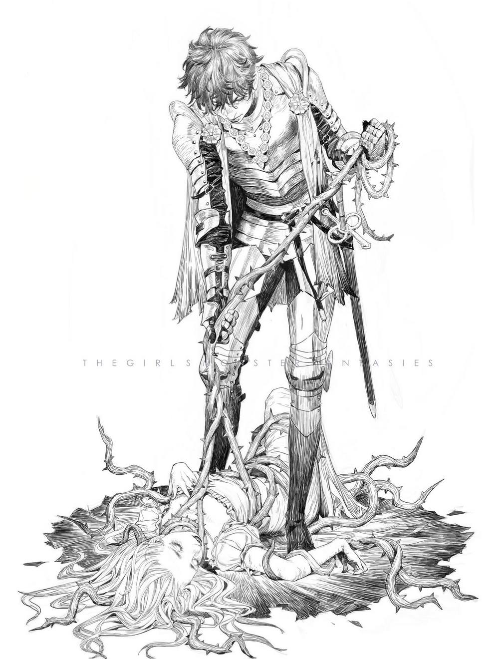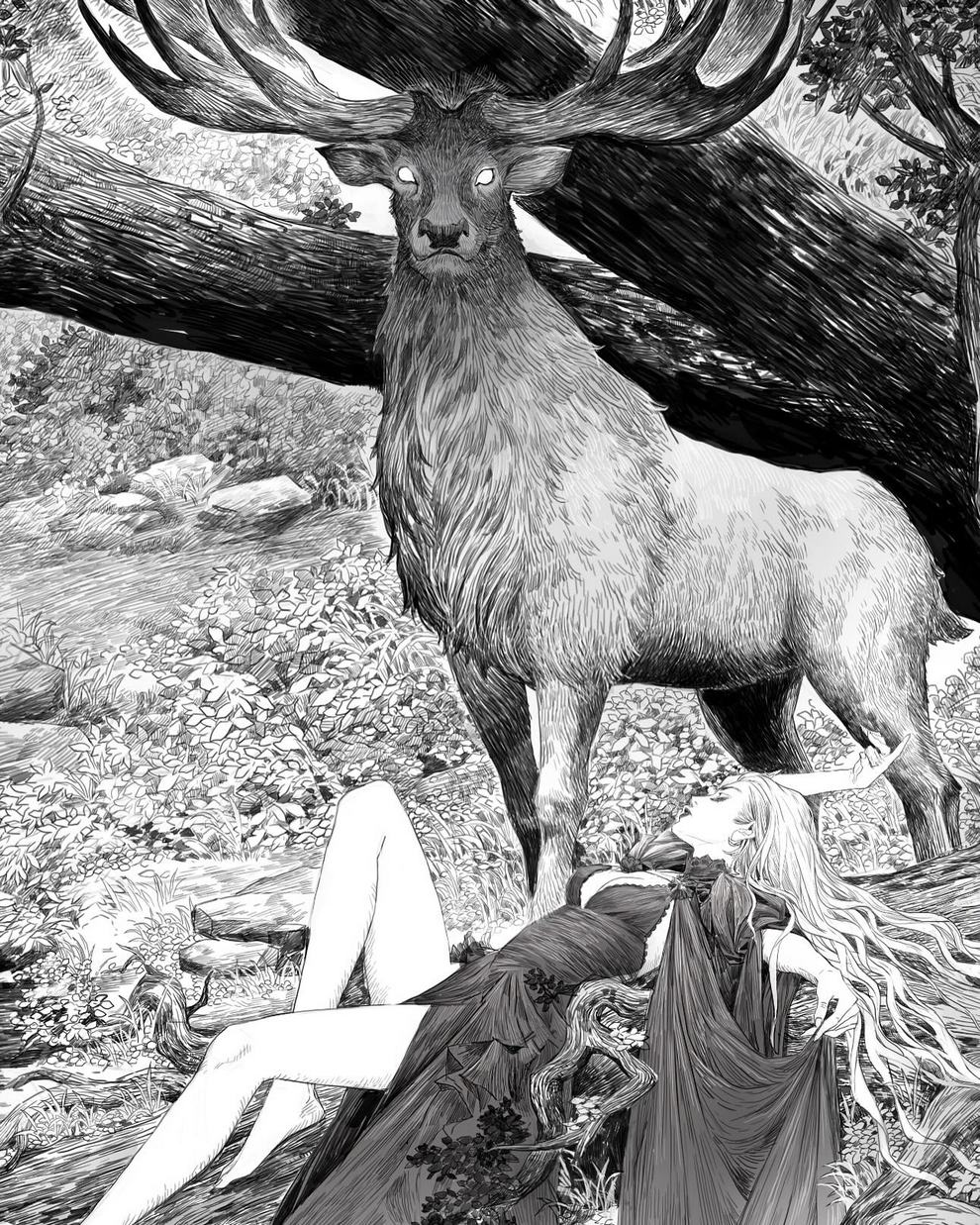 His work ranges from black‑and‑white, insanely intricate line‑art scenes to richly coloured fantasy pieces featuring astronaut girls, angelic figures, spider‑like women and cinematic, anime‑influenced characters that feel both grounded and surreal.