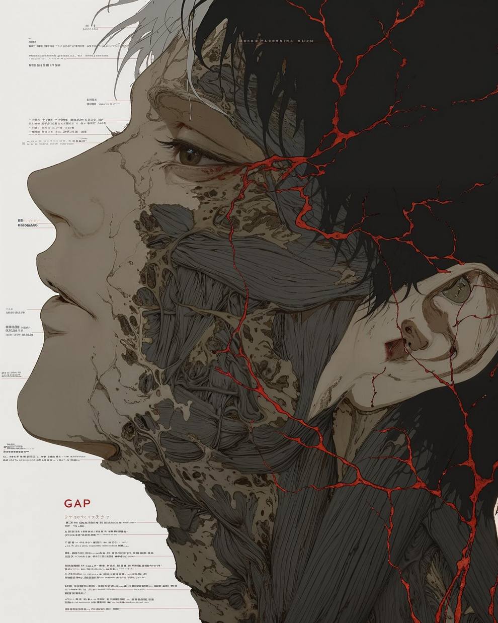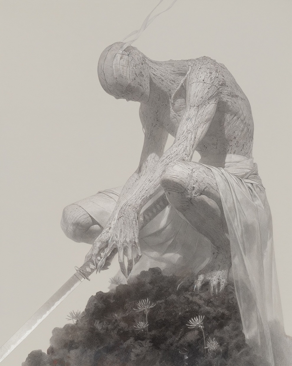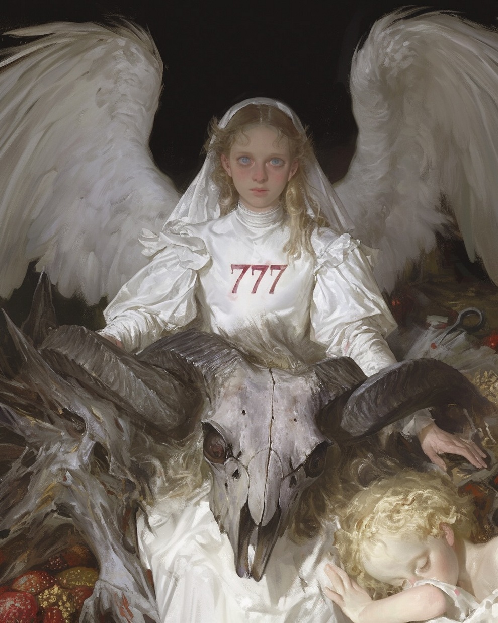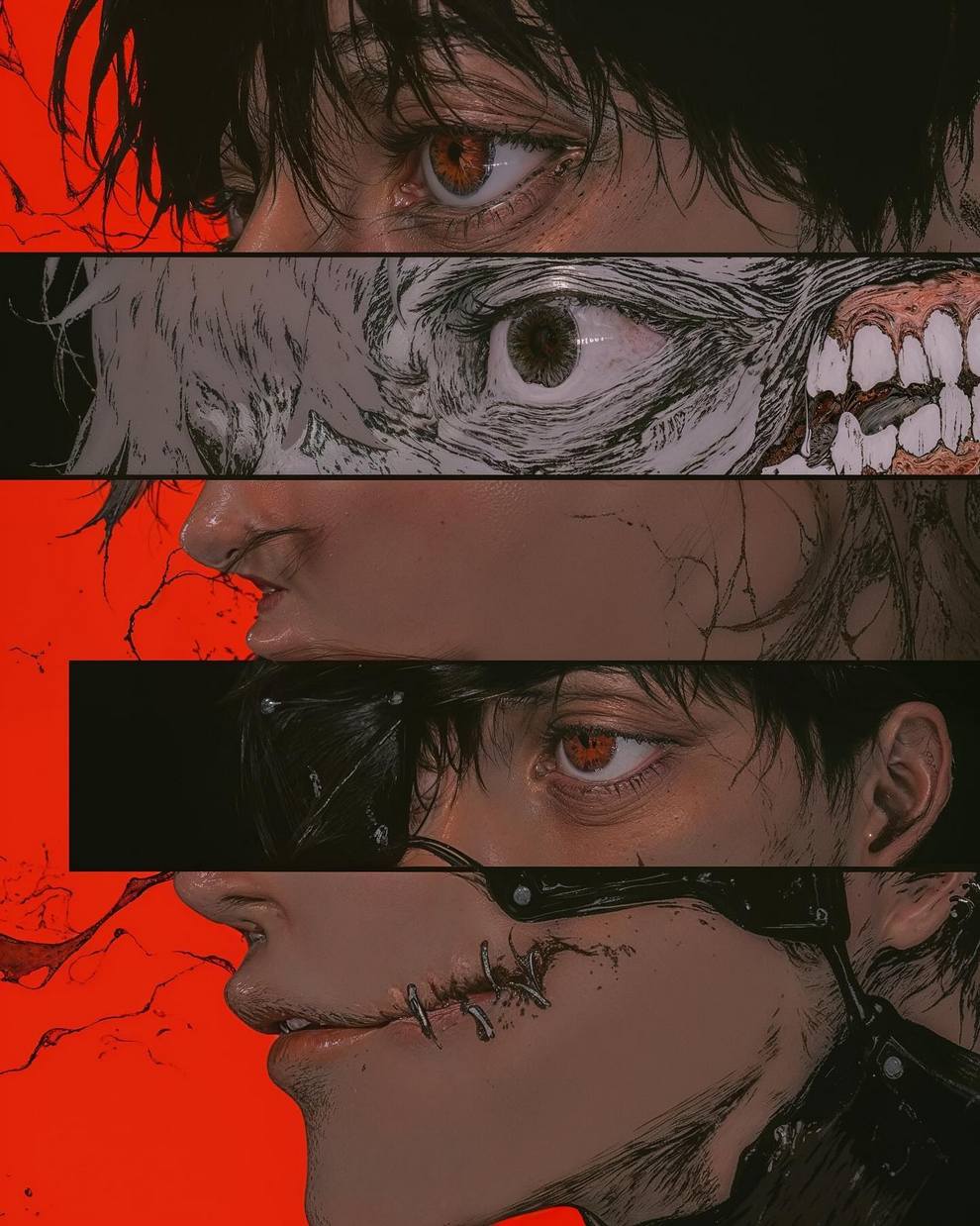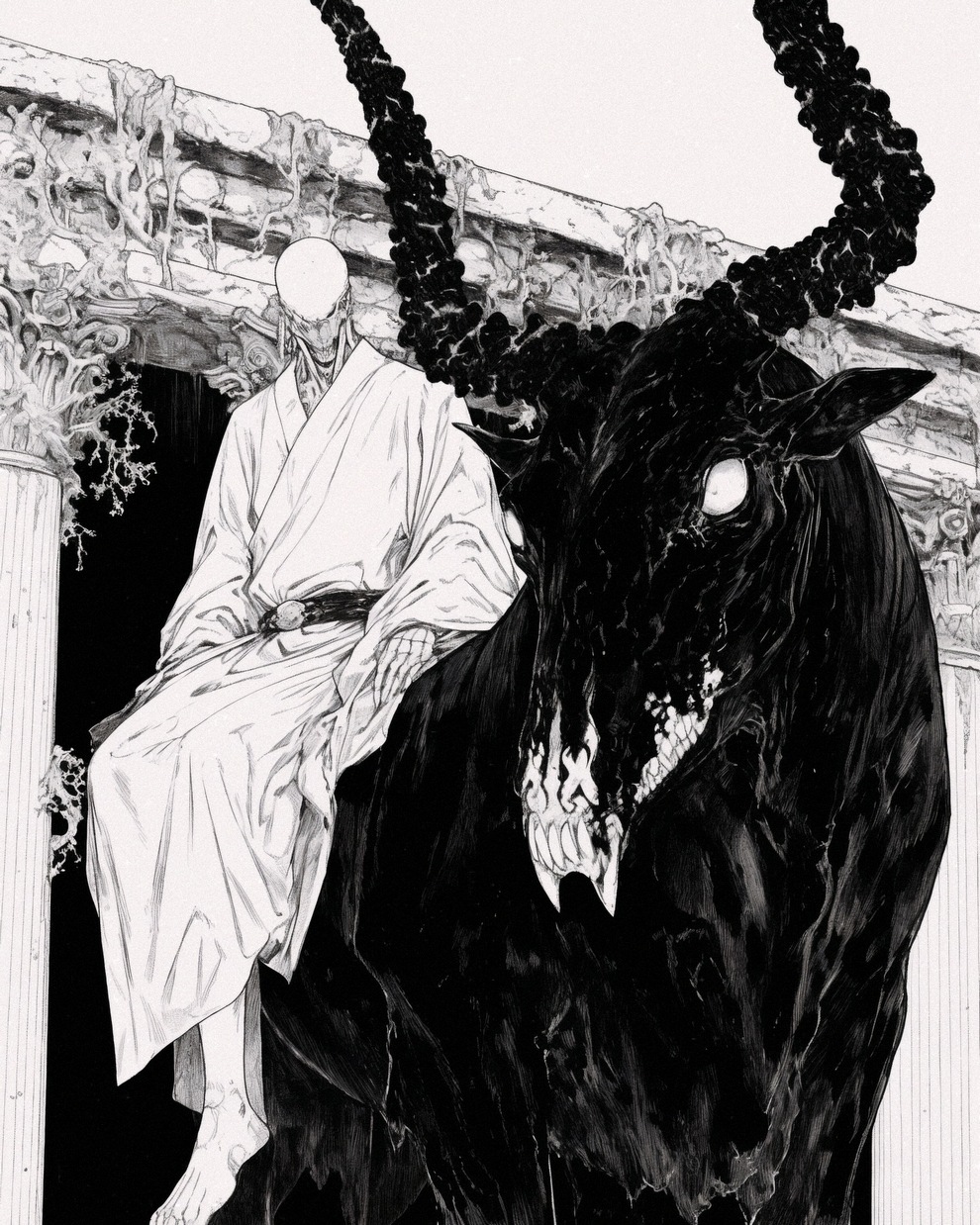 His mixes moonlit figures, death motifs, Vatican museum reflections, ritualistic imagery and prompt‑driven experiments (e.g., “This Is Not a Prompt Book” sold via Ko‑fi), with pieces exploring loneliness, darkness, beauty, betrayal and mythic gates.
